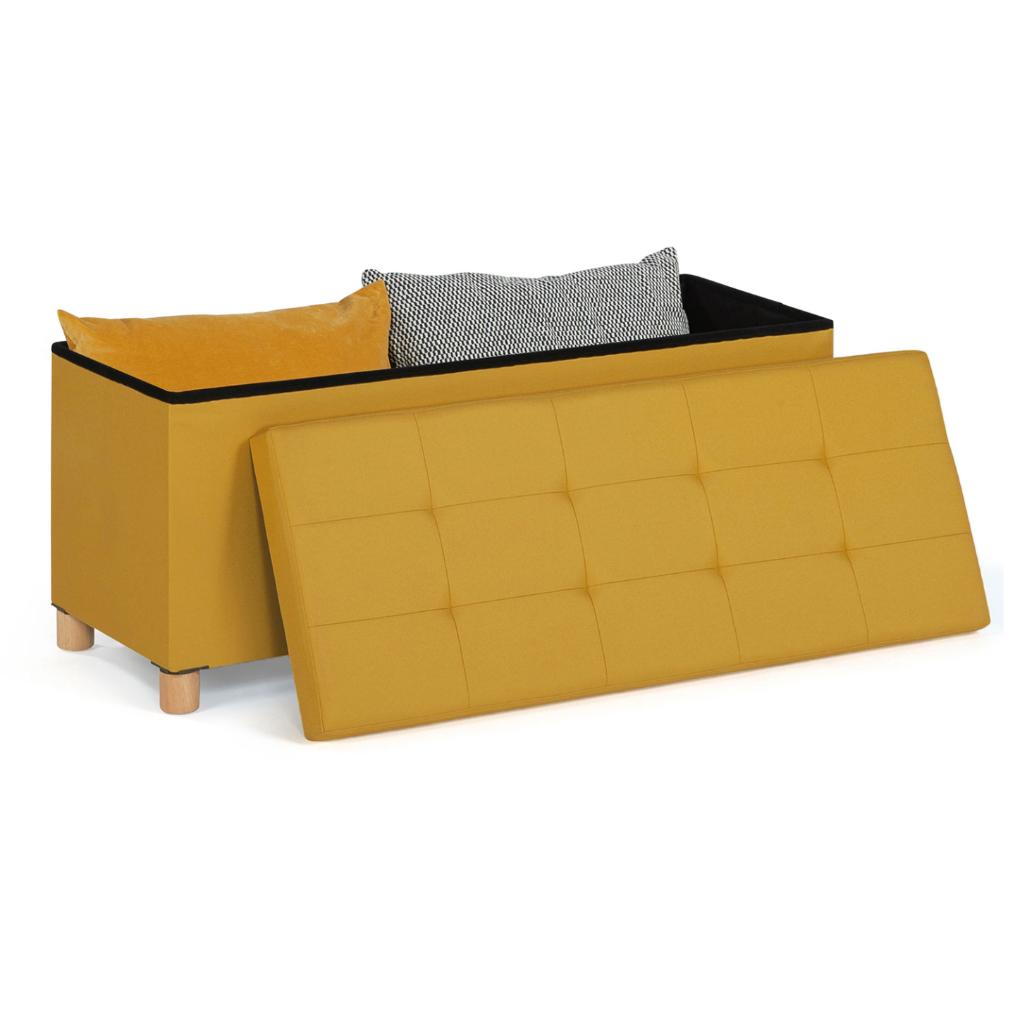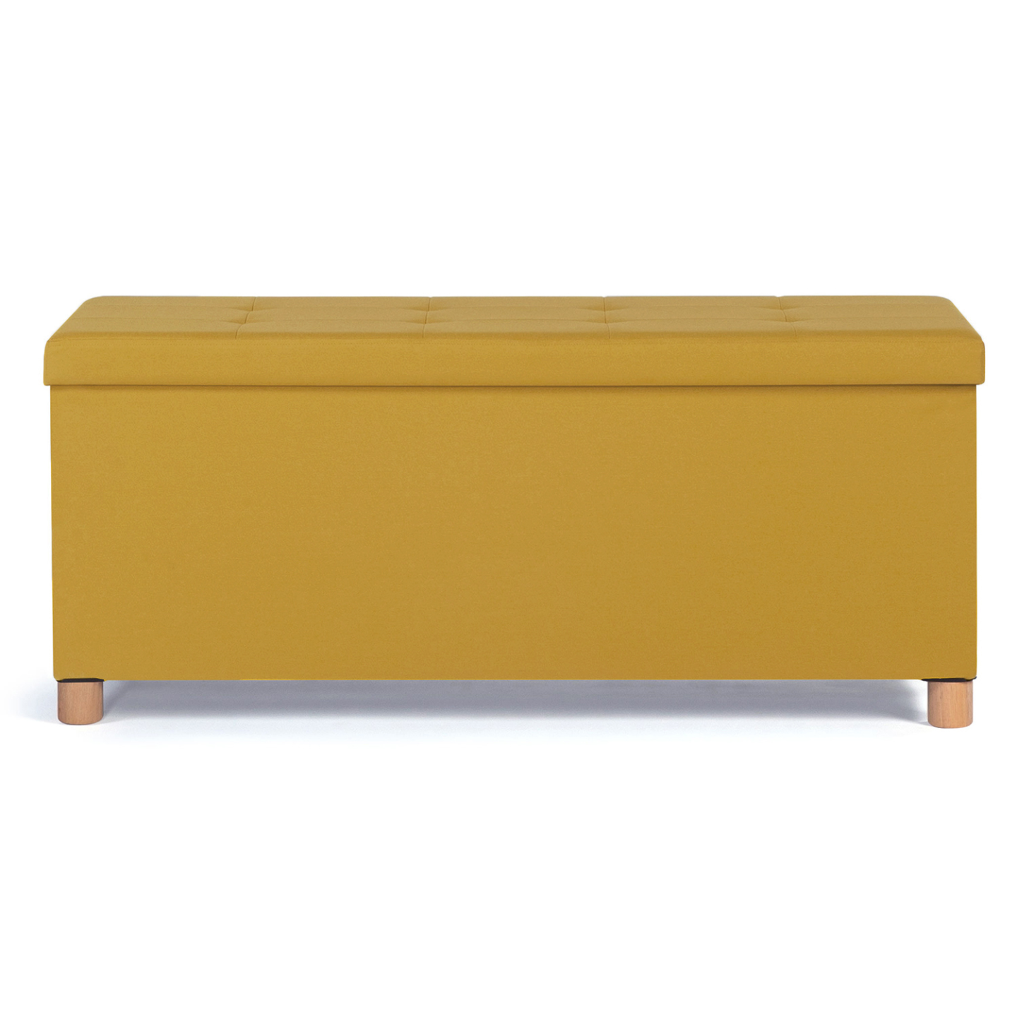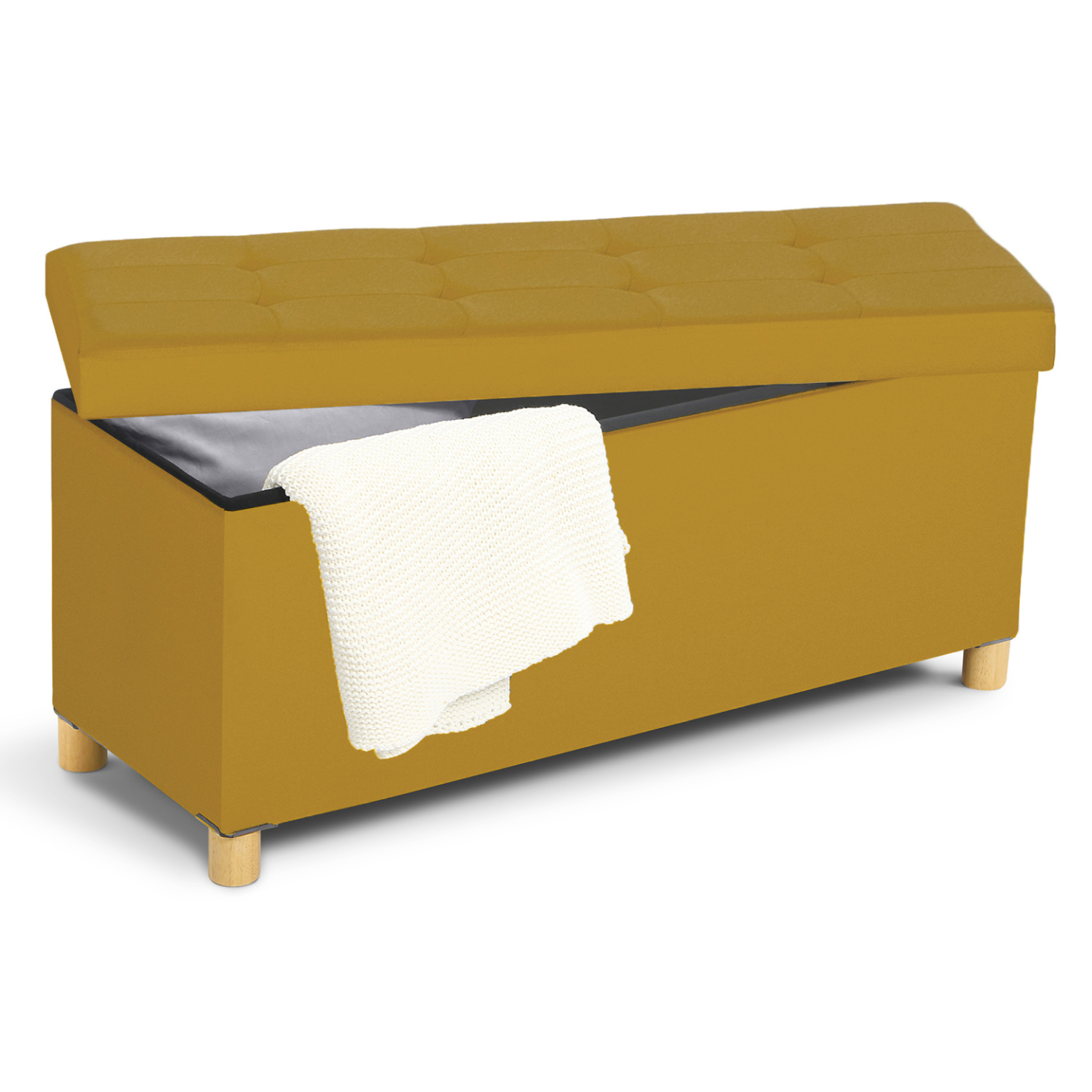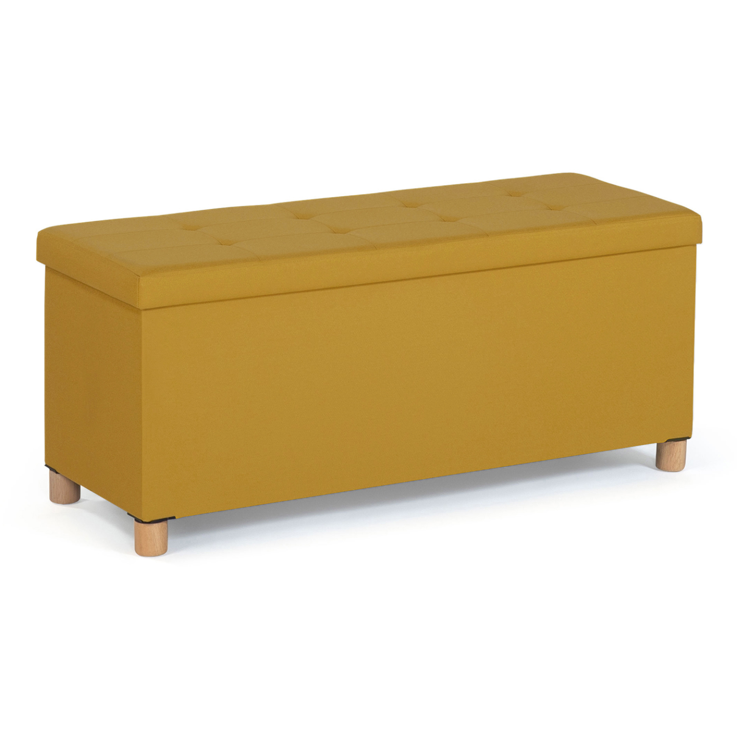 Vous pouvez dès à présent ranger efficacement tous vos vêtements, chaussures, plaids, jouets, DVD, livres ou tout autre objet grâce à notre banc coffre 100 cm en tissu jaune moutarde. Avec sa maxi capacité de rangement, fini les affaires qui traînent ! Gardez vos objets discrètement rangés, organisés, à l'abri de la poussière, et à portée de main !Doté de belles finitions, son couvercle, joliment capitonné, en tissu lin jaune moutarde élégant et moderne, lui confère un design chic et charme. En plus d'être agréable au toucher, sa surface rembourrée aux 8 capitons en fait une assise d'appoint confortable.Pratique, esthétique, et discret, ce banc coffre s'adaptera idéalement à tout type d'intérieur ! Il donnera du peps et de la couleur à votre pièce de vie tout en lui apportant une petite touche scandinave !Surélevé sur de petits pieds en bois d'hévéa de 5 cm de hauteur, à la structure en MDF, il est stable et robuste. Avec son poids léger, il est facilement transportable. Véritable solution de rangement et élément de décoration, installez-le où bon vous semble : dans votre chambre comme bout de lit, dans votre dressing, dans votre vestibule contre un mur comme meuble d'entrée, dans une salle de jeux, ou tout simplement dans votre salon.Astucieux, il ne prend pas de place ! Vous n'avez plus qu'à y poser un plaid ou de petits coussins colorés à motifs géométriques pour parfaire la décoration et le confort de votre pièce! Dimensions du banc de rangement 100 cmDimensions globales: Longueur 100 cm x largeur 38 cm x Hauteur 43 cmHauteur des pieds : 5 cmÉpaisseur de l'assise : 2,5 cmRevêtement extérieur : lin jaune moutardeRevêtement à l'intérieur du coffre : doublure noire non-tissé 80 grammesRembourrage en polyesterStructure en MDFPieds en bois d'hévéaÀ monter soi-mêmeRetrouvez l'ensemble de nos coffres de rangement sur notre boutique en ligne !