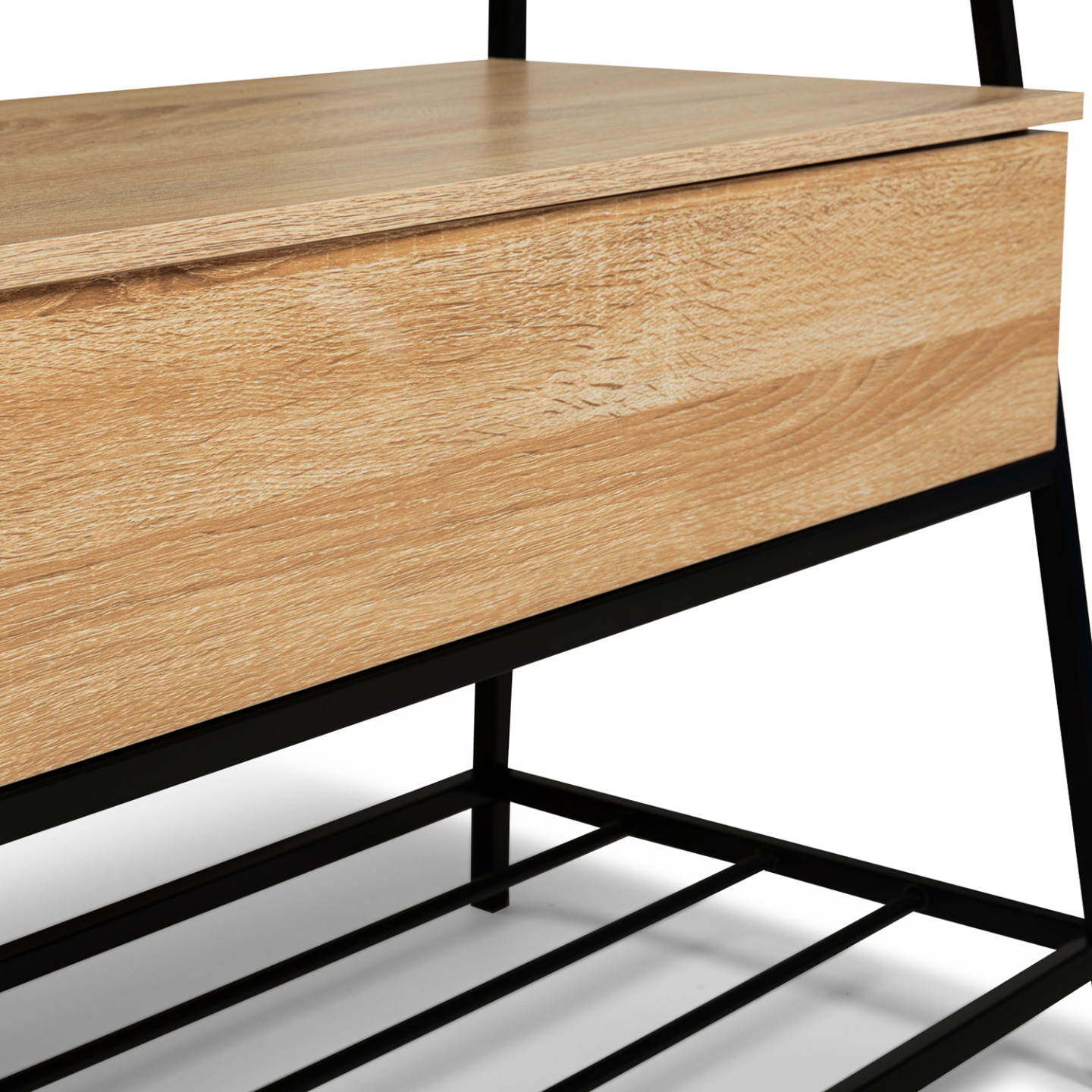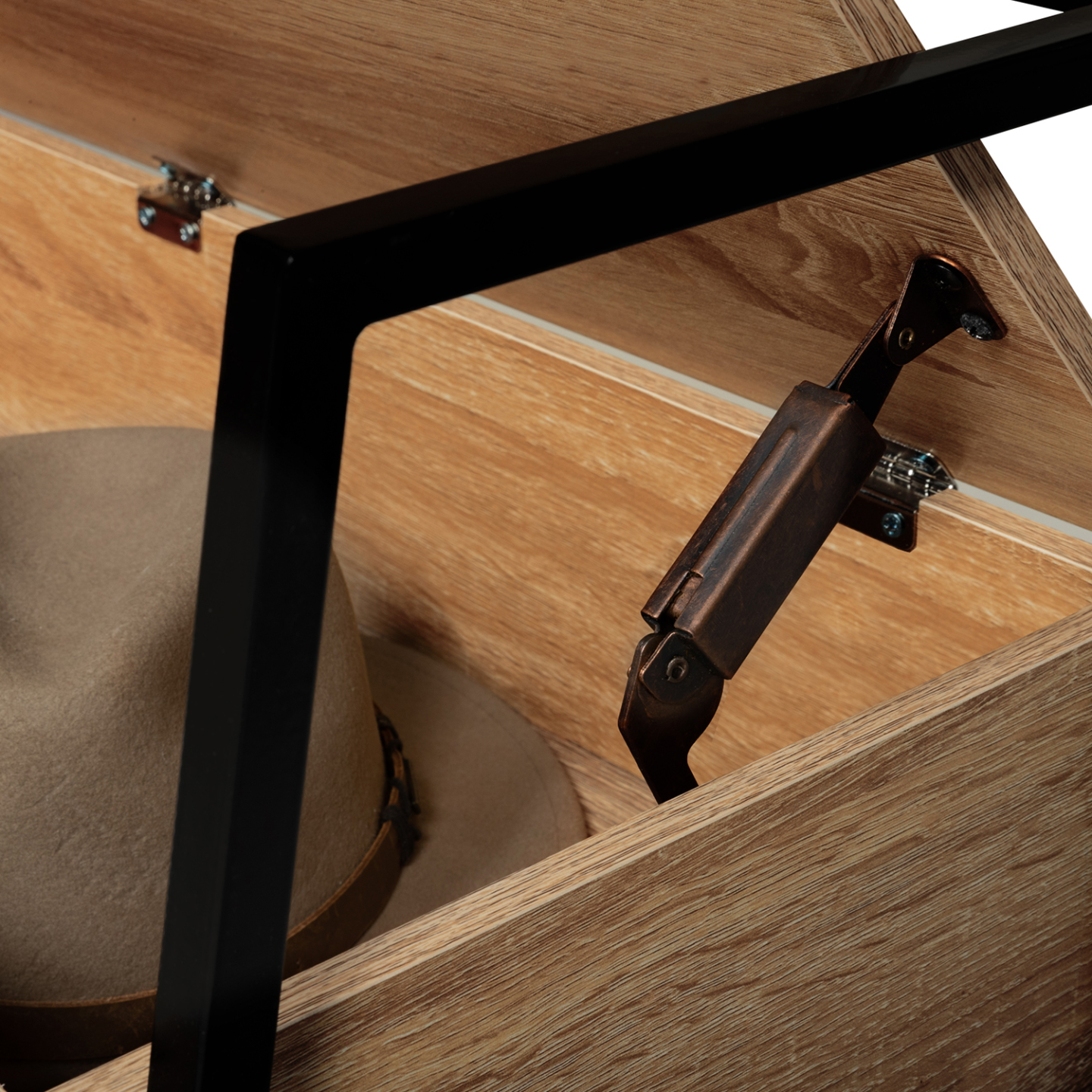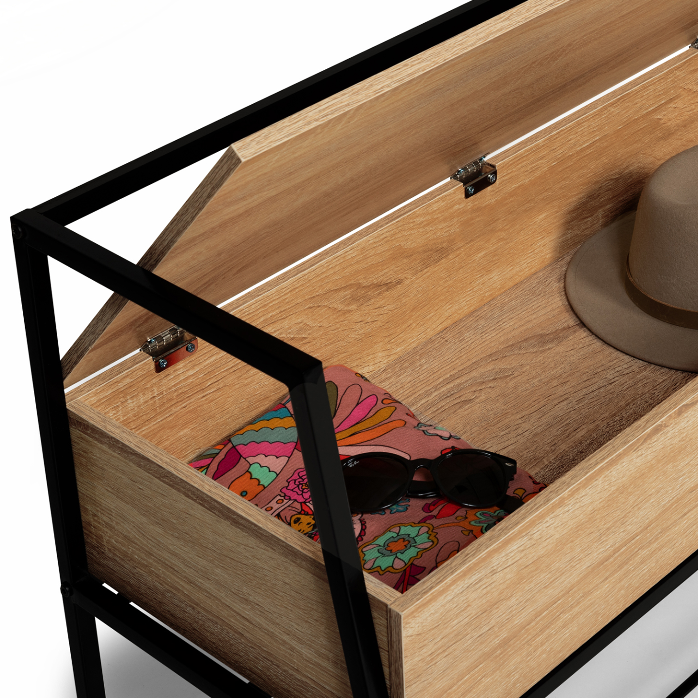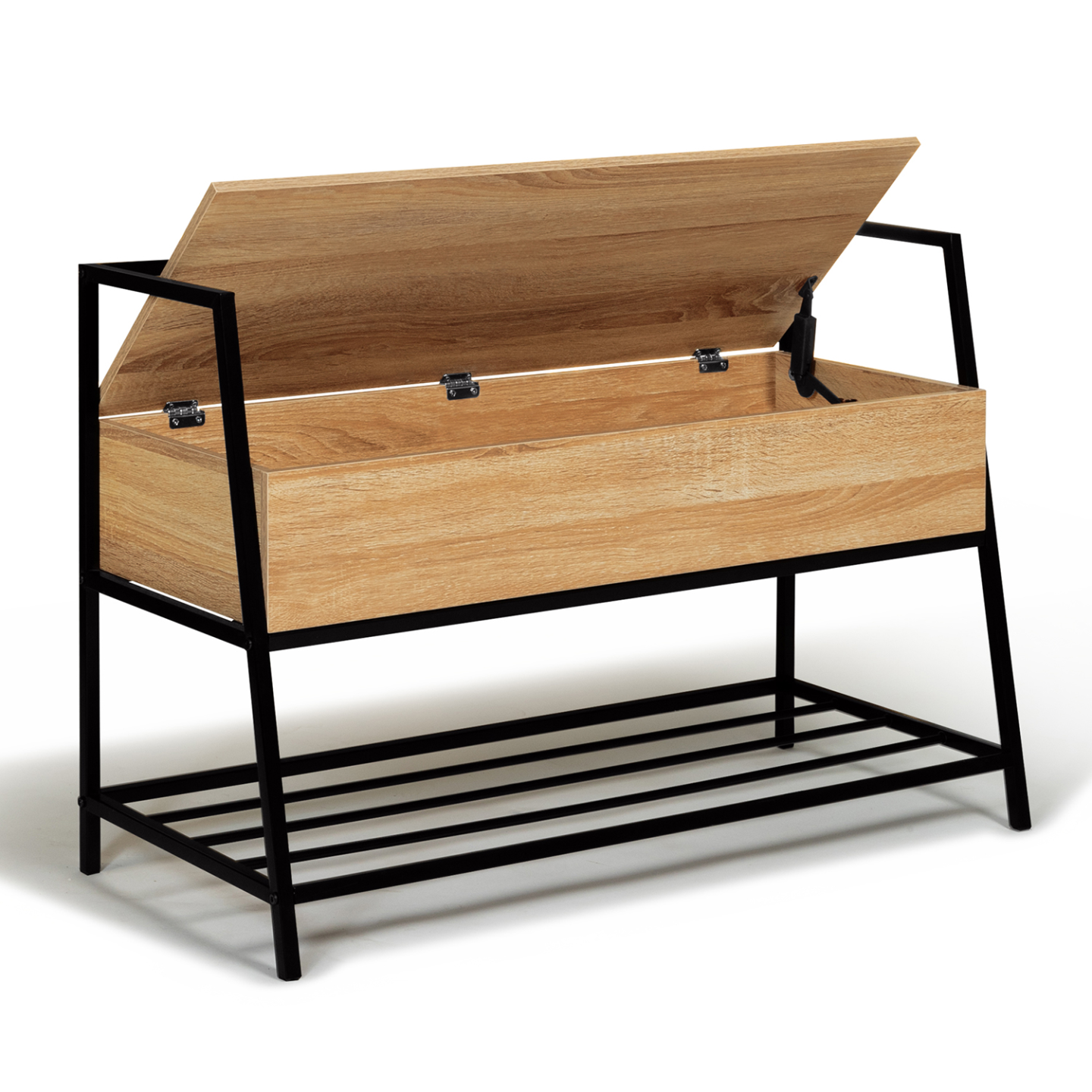 Descriptif du banc d'entrée TIM design industrielSublimez votre intérieur avec ce banc d'entrée TIM ultra fonctionnel. Idéal dans une entrée ou en bout de lit, il possède un grand coffre de rangement et une étagère ajourée pour un maximum de rangement. Son design industriel ultra tendance s'adaptera dans toutes les pièces de votre intérieur.Son format L.90xl.39xH.60 cm est parfait pour les entrées ou les couloirs, permettant ainsi de ne pas être encombrant et de favoriser le rangement de votre pièce. Vous pouvez aussi vous en servir en bout de lit pour compléter la décoration de votre chambre.Sous son assise se trouve un grand coffre de rangement, parfait pour les foulards, écharpes et autres accessoires que vous voulez avoir à porté de main. L'étagère en métal ajourée qui se trouve sur la partie inférieure du meuble est quant à elle parfaite pour y ranger vos chaussures.Son mécanisme avec vérin permet une ouverture facile et rapide du coffre pour une utilisation quotidienne. Sa structure métallique noire est solide et robuste, vous pourrez vous en servir pour chausser et déchausser facilement vos chaussures !Profitez de ce superbe meuble au design industriel à prix canon pour rafraîchir votre intérieur !Dimensions du banc d'entrée TIMDimensions globales : L.90xl.39xH.60 cmMatière : panneaux de particules mélaminés et métalColoris : bois et noirPoids du produit : 12 KGVisserie incluse