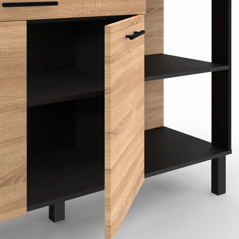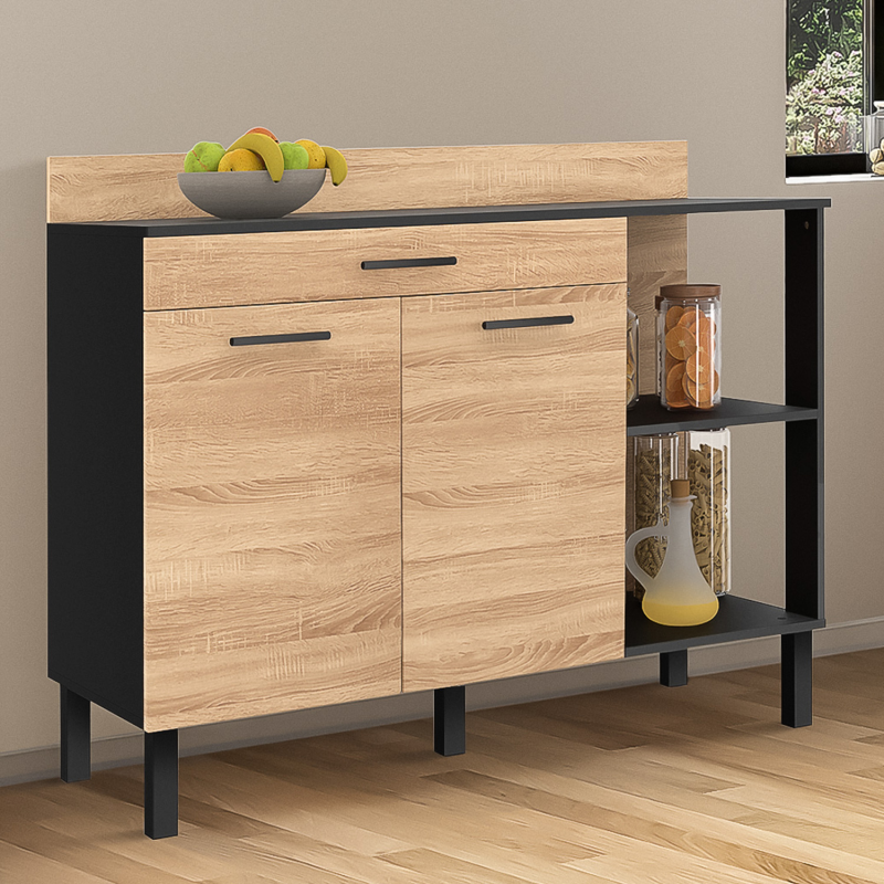 Choisissez le buffet de cuisine CINA au design tendance et moderne pour aménager votre intérieur. Sa structure noire et ses portes façon hêtre s'accorderont parfaitement dans votre pièce de vie. Ce meuble est doté d'un large plan de travail de 120 x 40 cm, idéal pour cuisiner de bons petits plats pour toute la famille. Optimisez votre espace en utilisant ses 2 étagères, son large placard et son tiroir. Privilégiez le placard situé en bas de la structure pour stocker vos plats les plus lourds et encombrants. Vous disposez d'un large stockage de 80 cm de longueur avec une étagère ajustable sur 3 niveaux. Le tiroir de 80 cm de longueur vous permet de stocker l'ensemble de vos couverts et de vos pelles à tarte, fouets et autres outils de cuisine.2 étagères viennent compléter ce meuble et pourront accueillir vos épices ou aliments stockés en vrac, tout en les gardant à portée de main. Faites-vous plaisir et choisissez le meuble pratique et esthétique pour votre cuisine. Plus qu'un simple meuble de rangement, le buffet de cuisine CINA vous permet de stocker et de garder à portée de main tout le nécessaire de votre cuisine. Dimensions du buffet de cuisine CINA 120 CM - H. 93 cm Dimensions globales : Longueur 120 cm x largeur 40 cm x Hauteur 93 cmDimensions intérieures placard : L. 77 x l. 36.50 x H. 53 cm avec 1 étagère amovible sur 3 niveauxDimensions intérieures tiroir : L. 72 x l. 33.50 x H. 5.50 cm - Façade H.10 cmDimensions étagères extérieures : L. 36.50 x l. 40 x H. 32 cmHauteur du plan de travail : H.83 cmHauteur pied : 15 cmHauteur rebord : 10 cmDimensions façade portes : L. 40 x H. 56 cm2 poteaux intérieurs : 5 x 2.5 cmPoignée de 14 cm de longueurMatériaux : panneaux de particules + pieds en métalColoris : noir et boisÀ monter soi-mêmeVisserie incluse Retrouvez l'ensemble de nos éléments de cuisine et buffets sur notre boutique en ligne !Retrouvez également le buffet bas de cuisine structure façon hêtre et portes noires.