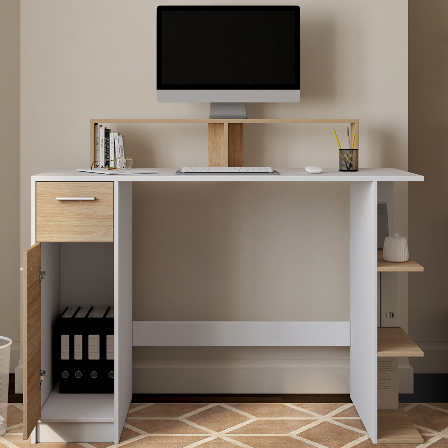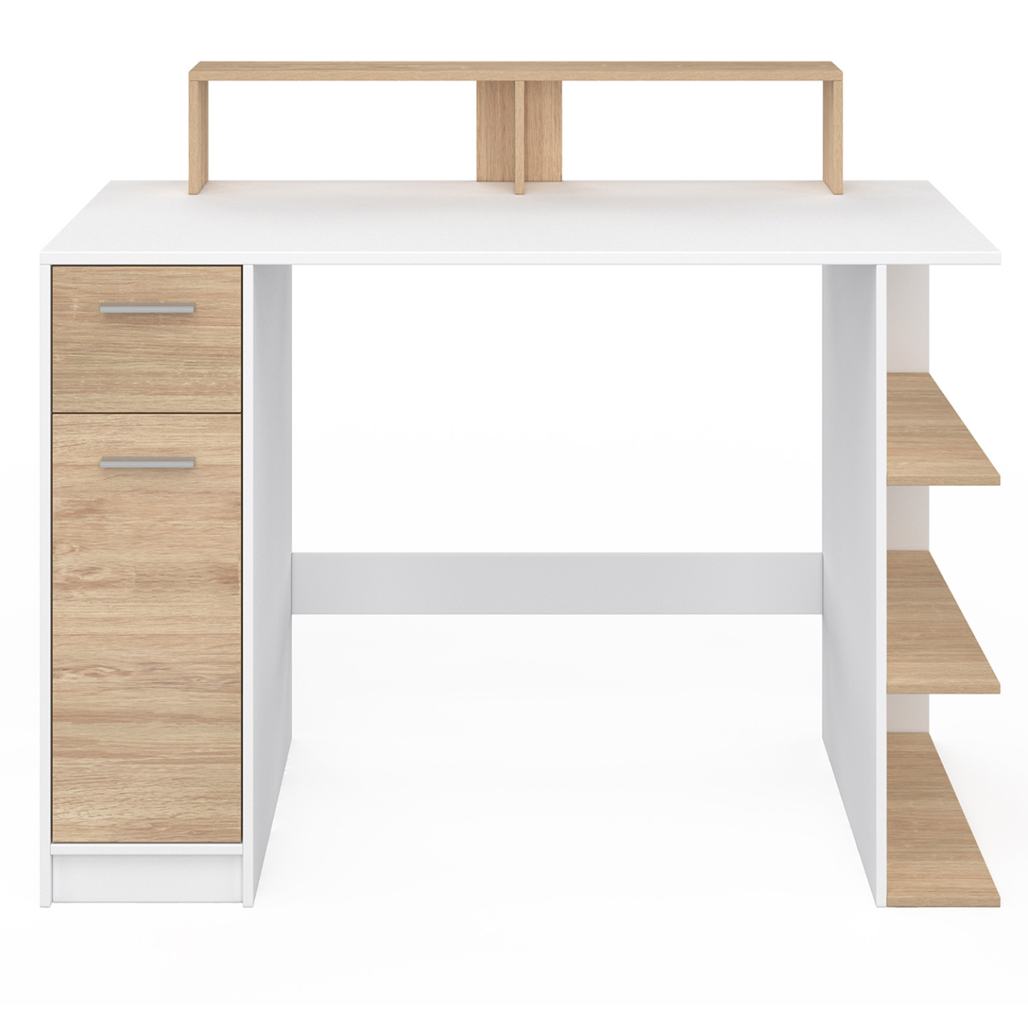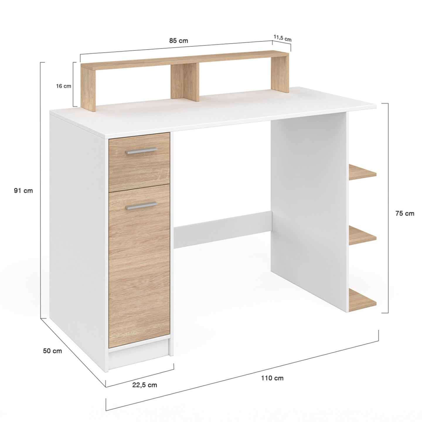 Le bureau avec rangement MAY blanc et bois apportera une touche autant contemporaine que moderne et s'intégrera parfaitement à tout type d'intérieur.Grâce à son grand plateau de 110 cm, son plateau surélevé et ses 2 niches, vous pourrez installer à la fois votre poste d'ordinateur, vos accessoires de bureau, tout en disposant d'un grand plan de travail. Pratiques et fonctionnels, le tiroir et le placard de rangement ont été spécialement conçus pour vous permettre de ranger vos livres, classeurs, boites de rangement à l'abri des regards, tandis que les étagères sur le côté vous permettront de disposer vos objets de décoration. Les différents rangements du bureau MAY vous donnent la possibilité d'organiser plus aisément votre espace de travail et d'avoir tous vos documents et livres bien rangés et à portée de main en laissant le plateau du bureau libre et dégagé.Il ne vous reste plus qu'à aménager les étagères avec de petits accessoires, des objets de décoration ou de petites plantes vertes pour le personnaliser à votre goût, et bien travailler en toute sérénité !Stable et robuste grâce à sa structure en particules de bois, organisez-vous un coin bureau en toute sécurité. Adoptez dès maintenant le bureau MAY pour ne plus manquer de rangement. Dimensions du bureau MAY bois façon hêtre et blancDimensions globales du bureau : Longueur 110 cm x largeur 50 cm x Hauteur 91 cmHauteur du bureau : 91 cm Hauteur plateau : 75 cm Dimensions des étagères sur le côté : L. 12.5 x l. 48.5 x H. 23 cmDimensions des niches sur le plateau : L. 40 x l. 11.5 x H. 15 cm Dimensions de l'étagère sur les niches : L. 85 x l. 11.5 Dimensions du placard : L. 22.5 x l. 47 x H. 48.5 cmDimensions du tiroir : L. 17.5 x l. 28.5 x H. 8.5 cmMatériaux : Panneaux de particules (PB) Coloris : Bois et blancRetrouvez tous nos modèles de bureaux sur notre boutique en ligne.