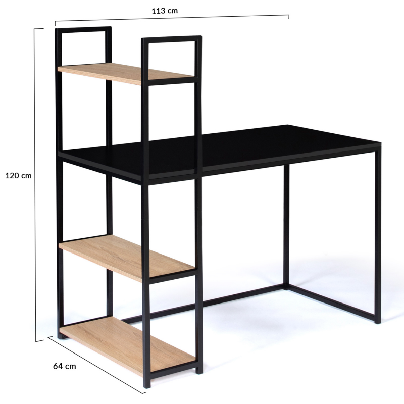 Le design du bureau style industriel s'inspire des usines et de leurs ateliers. Les lignes sobres et le style épuré du bureau BOSTON donneront à votre intérieur un aspect loft du meilleur effet. Avec ses coloris bois noir et façon hêtre et ses matériaux bruts, votre bureau trouvera facilement sa place chez vous car vous pourrez l'intégrer à différents styles d'intérieurs en renforçant le côté loft ou au contraire en donnant un peu de chaleur avec son design.Ce bureau bois métal industriel est doté d'un long plateau couleur bois très pratique en particules de bois d'une longueur de 113 cm sur 64 cm de large. Il est idéal pour travailler confortablement, disposer vos pots à crayons, trier vos documents sans gêne et installer votre poste d'ordinateur sur le large espace de travail.Fonctionnel, grâce à ses 3 étagères en métal noir maxi capacité, vous pourrez ranger vos livres, classeurs, boîtes de rangement, disposer vos objets de décoration favoris et laisser libre votre espace de travail sur le bureau !Les différents plateaux de 1,5 cm d'épaisseur sont soutenus par une structure métallique qui lui assure solidité et stabilité au quotidien.Au-delà de son côté authentique et robuste, ses proportions généreuses en font un bureau fonctionnel qui pourra s'insérer dans les petits comme les grands espaces de vie.Laissez entrer le style industriel si tendance dans votre intérieur avec notre bureau bi-matière en métal et bois !Pratique et déco, ce meuble modernisera votre salon ou votre bureau et facilitera le rangement de votre espace de travail !Dimensions du bureau BOSTON design industrielDimensions globales : Longueur 113 cm x largeur 64 cm x Hauteur 120 cmDimensions de l'étagère : Longueur 24 cm x Profondeur 64 cm x Hauteur 120 cm(Etagère non réversible)Hauteur du plan de travail : 72 cmEpaisseur plateaux bois : 1,5 cmEpaisseur tubes métal : 2 x 2 cmA monter soi-mêmeDécouvrez l'ensemble de notre collection industrielle sur notre boutique en ligne !