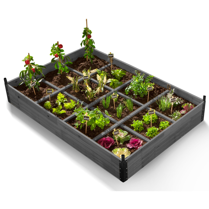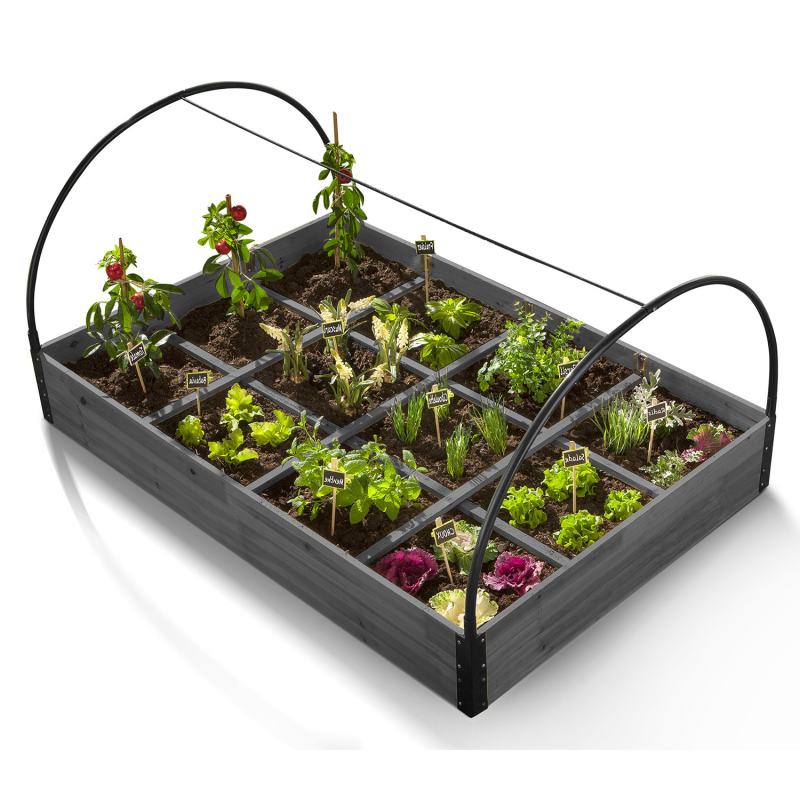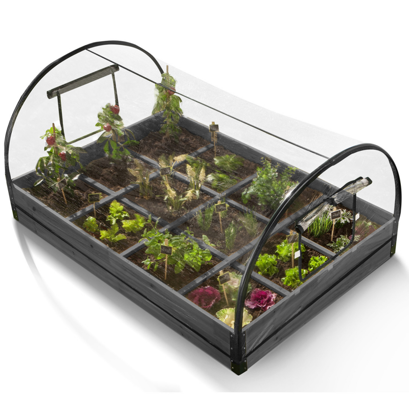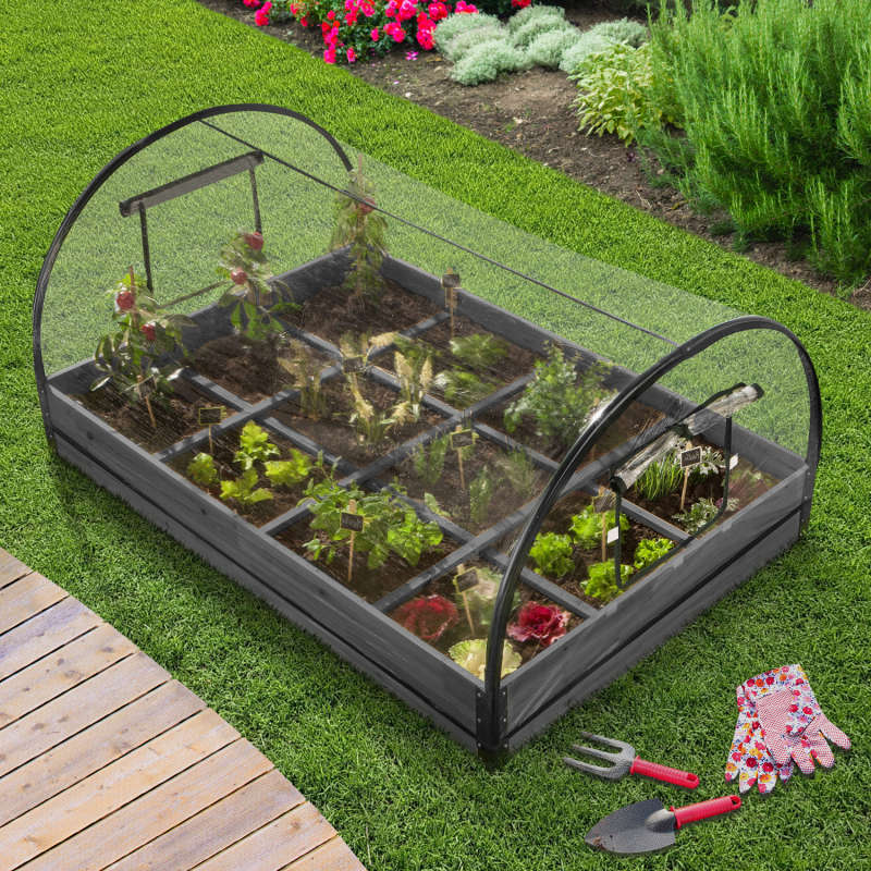 Cultivez facilement vos salades, petits légumes et autres herbes aromatiques grâce à ce carré potager compartimenté en bois gris et sa housse amovible ! Ce potager d'appoint ultra complet vous permet de prendre soin de vos cultures en les ayant à portée de main. Équipé de 2 barres en bois dans la longueur et de 3 barres en bois dans la largeur, le carré potager vous offre 12 compartiments L. 30 cm x l. 27 cm qui permettent d'organiser vos plantations, leur irrigation ainsi que leur traitement. Grâce à cette délimitation, vous pouvez répartir vos pousses selon leur variété ou simplement selon vos envies !Également muni d'une bâche PVC transparente amovible avec liseré noir, le potager d'appoint protège vos jeunes pousses des gelées tardives, l'idéal pour récolter plus tôt en saison ! Comptez sur ses larges fenêtres à scratchs, situées latéralement, pour vous faciliter l'accès à l'intérieur de la serre (arrosage, entretien, etc.) et pour optimiser l'aération intérieure et disposer une température contrôlée. Protégées des limaces, des oiseaux, du froid ou encore d'autres petits nuisibles, vos cultures peuvent pousser en toute tranquillité, de quoi vous ravir les papilles ! Dimensions du carré potager 12 compartiments - Dimensions globales : Longueur 115 cm x largeur 80 cm x Hauteur 54 cm- Structure : bois gris avec renforts dans les coins en acier peints en noir - Dimensions des 2 barres (dans la longueur) : Longueur 115 cm x largeur 2 cm- Dimensions des 3 barres (dans la largeur) : Longueur 80 cm x largeur 2 cm- Dimensions d'un compartiment : Longueur 30 cm x largeur 27 cm- Hauteur de la structure en bois (hors bâche) : 13.5 cm- Matière bâche : PVC transparent avec liserés noirs sur les rebords - 4 tubes de 1.6 cm de diamètre pour soutenir la bâche- 2 ouvertures à scratchs sur les 2 largeurs - 10 soutiens en fer pour les barres- Non équipé d'un fond