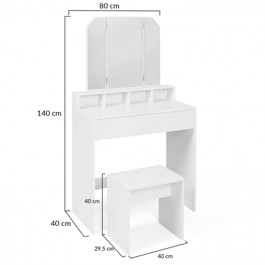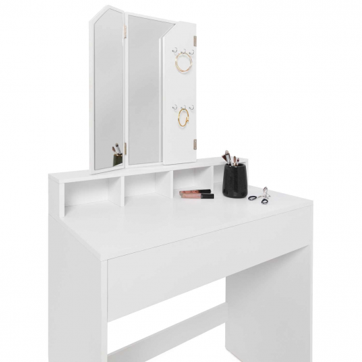 Aménagez dans votre chambre ou votre dressing, l'espace idéal pour vous apprêter au quotidien avec la coiffeuse ZELIA et son miroir tryptique.Pratiques et fonctionnels les 3 miroirs faciliteront vos séances de coiffure et de maquillage pour une mise en beauté réussie !Le grand tiroir situé sous le plateau vous permettra de ranger tout votre maquillage, vos ustensiles de coiffure ou encore produits de beauté ! Profitez également des 4 niches situées sous le miroir pour exposer vos vernis, parfums et soins du quotidien. Vous pouvez également choisir d'y installer quelques éléments de décoration comme une plante ou un petit cadre photo pour un effet encore plus cocooning ! De plus, les 12 crochets situés à l'arrière des 2 volets rabattables vous permettront d'accrocher vos bijoux préférés : bracelets, colliers ou encore sautoirs et de les conserver ordonnés et à portée de main. Terminé les affaires qui trainent, soyez assurés d'avoir un espace coiffure et maquillage toujours bien ordonné. La coiffeuse ZELIA est aussi composée d'un tabouret blanc assorti. Ajoutez-y un coussin moelleux en harmonie avec votre décoration intérieure et le tour est joué ! Vous êtes désormais assurée de passer vos séances beauté quotidiennes, en étant toujours confortablement installée.Alors n'hésitez plus et craquez pour la coiffeuse ZELIA 3 miroirs et prenez soin de vous en toute sérénité. Dimensions de la coiffeuse ZELIA 3 miroirsDimensions globales : Longueur 80 x largeur 40 x Hauteur 140 cmDimension tabouret : L. 40 x l. 29,5 x H. 40,5 cm1 tiroir de dimensions : L. 76,5 x l. 29 x H. 14 cm4 niches de dimensions : L. 18,5 x l. 10 x H. 10 cmDimensions partie miroir fermée : L. 30 x H. 54 cmDimensions partie miroir ouverte : L. 61 x H. 54 cmDimension miroir centrale : L. 30 x H. 54 cmDimensions miroir latéral : L. 15 x H. 54 cm12 crochets en métal argentéMatériaux : panneaux de particules de bois (PB) - épaisseur 15 mmColoris : blancÀ monter soi-mêmeLa coiffeuse ZELIA existe également dans d'autres versions : - Coiffeuse ZELIA blanche 4 étagères, miroir LED et tabouret- Coiffeuse ZELIA blanche 4 niches, miroir LED et tabouretDécouvre également l'ensemble de nos coiffeuses sur notre boutique en ligne !