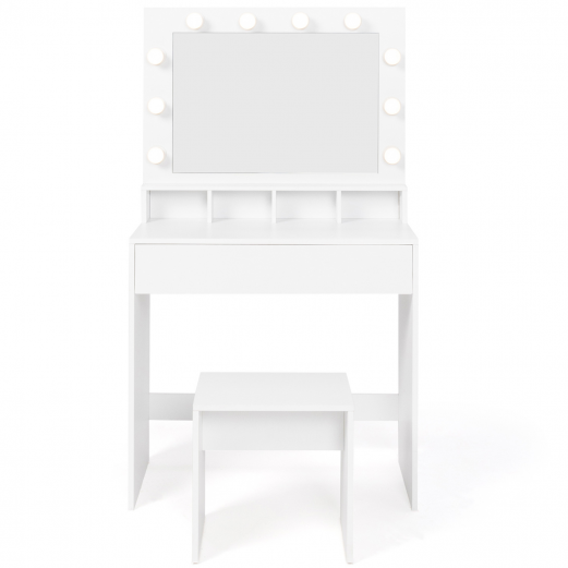 Vous avez toujours rêvé d'une coiffeuse tendance et moderne avec un grand miroir LED pour vous apprêter au quotidien ? Craquez pour la coiffeuse ZELIA et créez, chez vous, un espace coiffure et maquillage semblable à ceux des professionnels de la beauté ! Grâce à son miroir composé de 10 LEDS, vous maquiller n'aura jamais été aussi simple ! Soyez désormais assuré d'avoir le teint parfait et un maquillage réussi en tout occasion ! Profitez de son grand tiroir coulissant pour y entreposer vos ustensiles de coiffure, palettes de maquillage et produits de beauté et ainsi les avoir à portée de main tout en gardant votre espace beauté toujours ordonné.De plus, les 4 niches situées sous le tiroir vous permettent d'y exposer vos vernis à ongles, parfums et soins du quotidien. Vous pouvez également choisir de simplement y déposer une petite plante ou quelques éléments de déco pour une coiffeuse plus cocooning et en harmonie avec votre décoration intérieure. Le coloris blanc de la coiffeuse ZELIA s'intègrera parfaitement à tous types de décoration et apportera une touche de modernité.Prenez place sur son tabouret assorti et profitez de longs moments de détente pour vous apprêter au quotidien. Vous pourrez ranger aisément le tabouret sous la coiffeuse lorsque vous n'en aurez plus besoin. N'hésitez pas à y ajouter un coussin moelleux en harmonie avec votre décoration intérieure pour un espace beauté personnalisé. Vous êtes désormais assurée de passer vos séances beauté quotidiennes, toujours confortablement installée.Craquez pour la coiffeuse ZELIA, et prenez soin de vous en toute sérénité.Dimensions de la coiffeuse ZELIA 4 nichesDimensions globales : Longueur 80 cm x largeur 40 cm x Hauteur 140 cm Dimension tabouret : L. 40 x l. 29.5 x H. 40.5 cm1 tiroir de dimensions : L. 76.5 x l. 29 x H. 14 cm4 niches de dimensions : L. 18.5 x l. 10 x H. 10 cmDimensions miroir : L. 63 x H. 43 cm10 LEDS : branchés sur prise avec interrupteur ON/OFF Matériaux : panneaux de particules de bois (PB)Coloris : blancÀ monter soi-mêmeLa coiffeuse ZELIA existe également dans d'autres versions : - Coiffeuse ZELIA blanche 3 miroirs avec 4 niches et tabouret- Coiffeuse ZELIA blanche 4 étagères, miroir LED et tabouretRetrouvez l'intégralité de nos coiffeuses sur notre boutique en ligne !