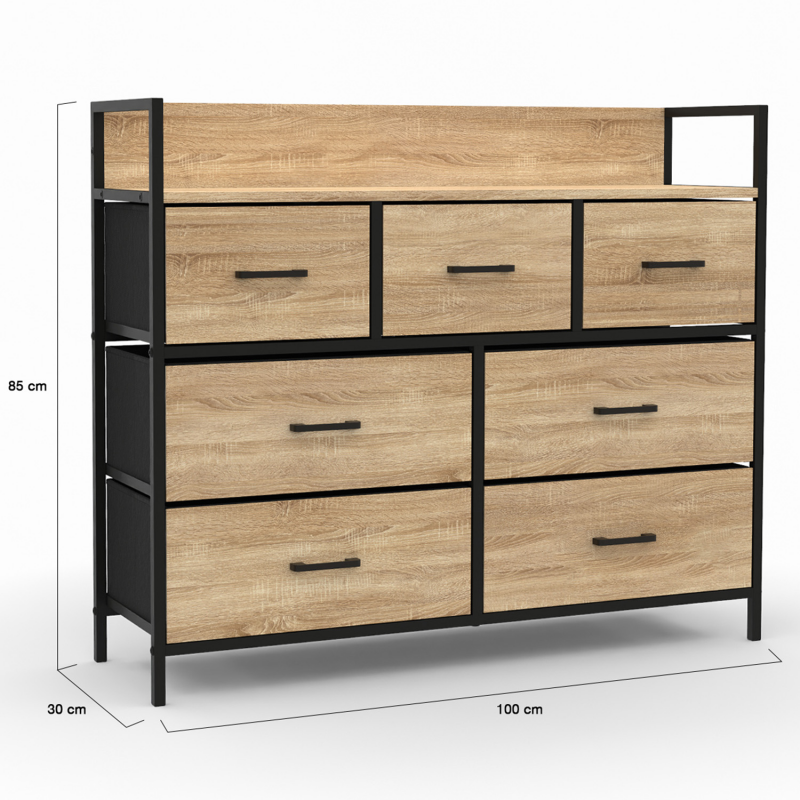 Optez sans plus attendre pour la commode UTAH au design industriel bi-matière.Sa maxi capacité de rangement vous permettra d'organiser tous vos vêtements et d'y ranger même les linges plus volumineux, tout en étant à l'abri de la poussière et de l'humidité. Profitez dès à présent de ses 7 tiroirs, dont 4 grands et 3 plus petits, de 18 cm de hauteur pour ranger tous vos pulls, votre linge de lit et vos serviettes de bain les plus encombrantes. Grâce à sa structure au coloris noir et ses tiroirs dotés d'une façade effet bois rigide, votre commode apportera un côté chaleureux et s'accordera avec n'importe quelle décoration.Sa structure en métal est recouverte par un plateau en PB effet bois. N'hésitez pas à vous servir de ce large plateau pour y déposer de la décoration ou même une lampe. Avec son look industriel, entreposez votre nouvelle commode dans n'importe quelle pièce, elle y trouvera facilement sa place. Pour une totale harmonie dans votre chambre à coucher, optez pour une association commode et chiffonnier UTAH, design assuré ! Alors n'hésitez plus, craquez pour sa maxi capacité de rangement et son joli look industriel ! Dimensions de la commode 7 tiroirs UTAHDimensions globales : Longueur 100 x largeur 30 x Hauteur 85 cmDimensions intérieures grands tiroirs : L. 46.5 x l. 29 x H. 18 cmDimensions façades grands tiroirs : L. 47 x H. 19 cmDimensions intérieures petits tiroirs : L. 30 x l. 29 x H. 18 cmDimensions façades petits tiroirs : L. 30.5 x H. 19 cmHauteur rebord tablette : 13 cmDimensions des poignées : L. 10 x l. 2 cmHauteur des pieds : 7 cmTiroirs en fibre non tissée et façades en particules de bois (PB)Coloris : noir et effet boisÀ monter soi-mêmeDécouvrez notre commode UTAH en version 6 tiroirs et 9 tiroirs.Retrouvez également l'ensemble de nos commodes sur notre boutique en ligne.
