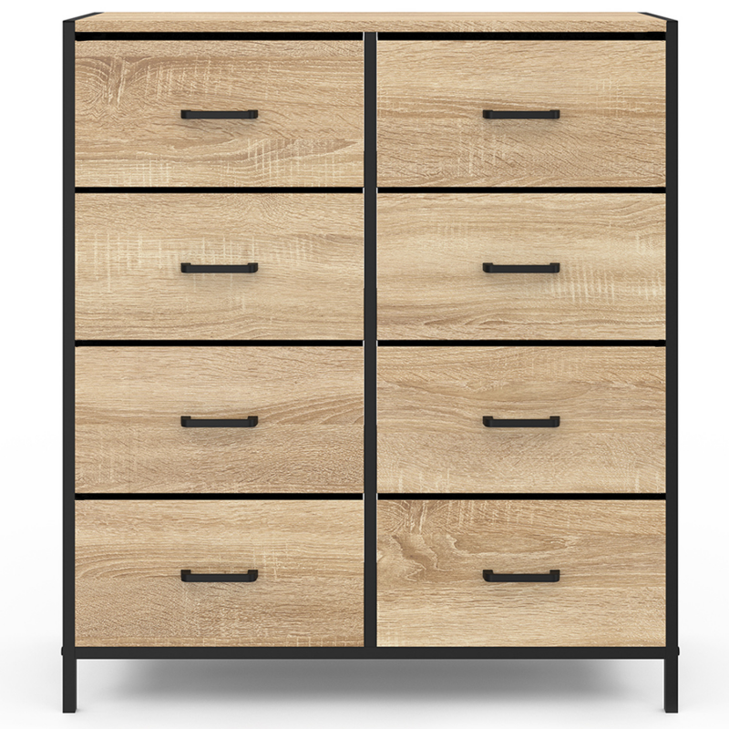 Optez sans plus attendre pour la commode UTAH au design industriel bi-matière.Sa maxi capacité de rangement vous permettra d'organiser tous vos vêtements et d'y ranger même les linges plus volumineux, tout en étant à l'abri de la poussière et de l'humidité. Profitez dès à présent de ses 8 tiroirs de 18 cm de hauteur pour ranger tous vos pulls, votre linge de lit et vos serviettes de bain les plus encombrantes. Grâce à sa structure au coloris noir et ses tiroirs dotés d'une façade effet bois rigide, votre commode apportera un côté chaleureux et s'accordera avec n'importe quelle décoration.Sa structure en métal est recouverte par un plateau en PB effet bois. N'hésitez pas à vous servir de ce large plateau pour y déposer de la décoration ou même une lampe. Avec son look industriel, entreposez votre nouvelle commode dans n'importe quelle pièce, elle y trouvera facilement sa place. Pour une totale harmonie dans votre chambre à coucher, optez pour une association commode et chiffonnier UTAH, design assuré ! Alors n'hésitez plus, craquez pour sa maxi capacité de rangement et son joli look industriel ! Dimensions de la commode 8 tiroirs UTAHDimensions globales : Longueur 80 x largeur 30 x Hauteur 90 cmDimensions intérieures d'un tiroir : L. 37 x l. 28.5 x H. 18 cmDimensions façade d'un tiroir : L. 37.5 x H. 19 cmDimensions des poignées : L. 10 x l. 2 cmHauteur des pieds : 7 cmTiroirs en fibre non tissée et façades en particules de bois Coloris : noir et effet boisÀ monter soi-mêmeDécouvrez notre commode UTAH en version 6 tiroirs et 9 tiroirs.Retrouvez également l'ensemble de nos commodes sur notre boutique en ligne.