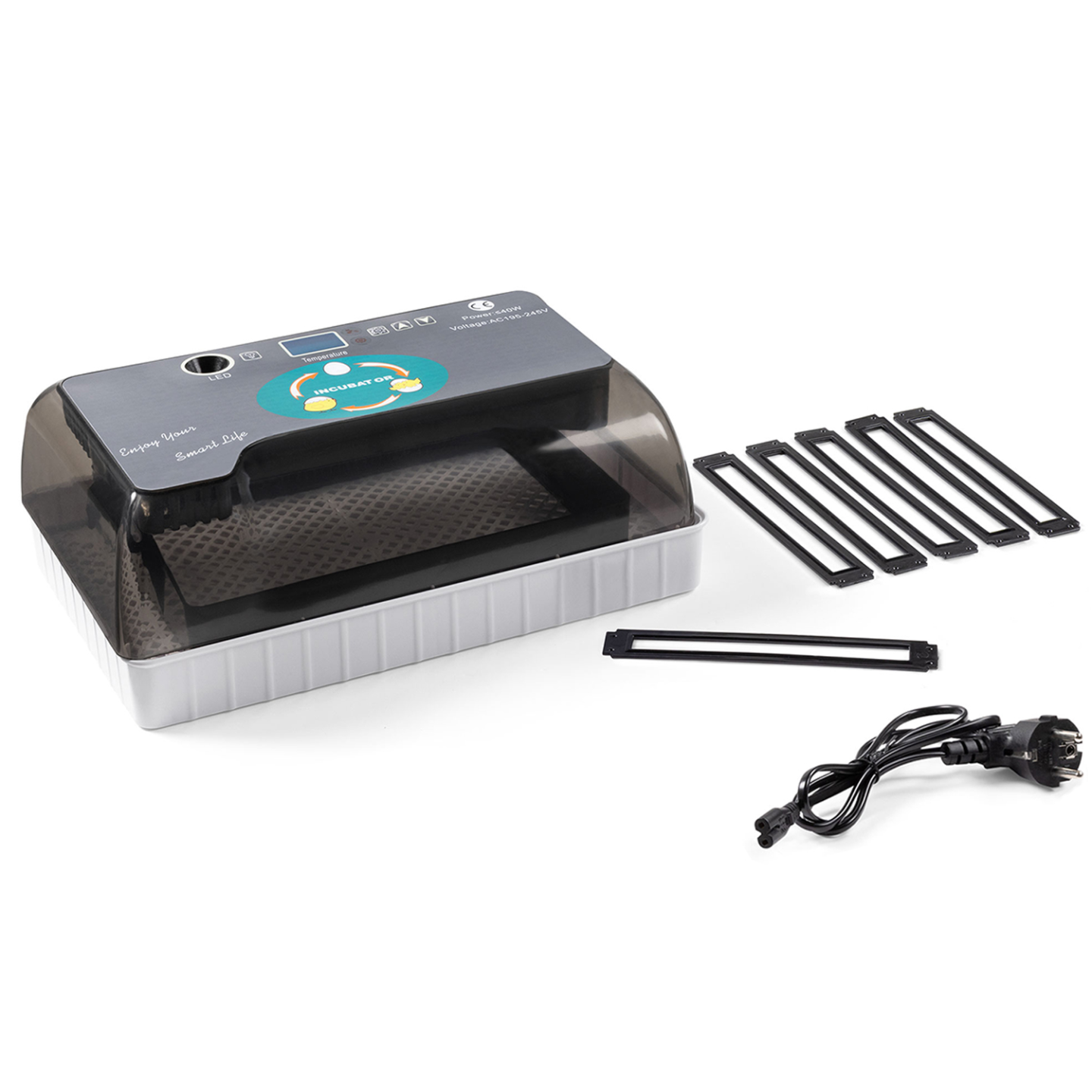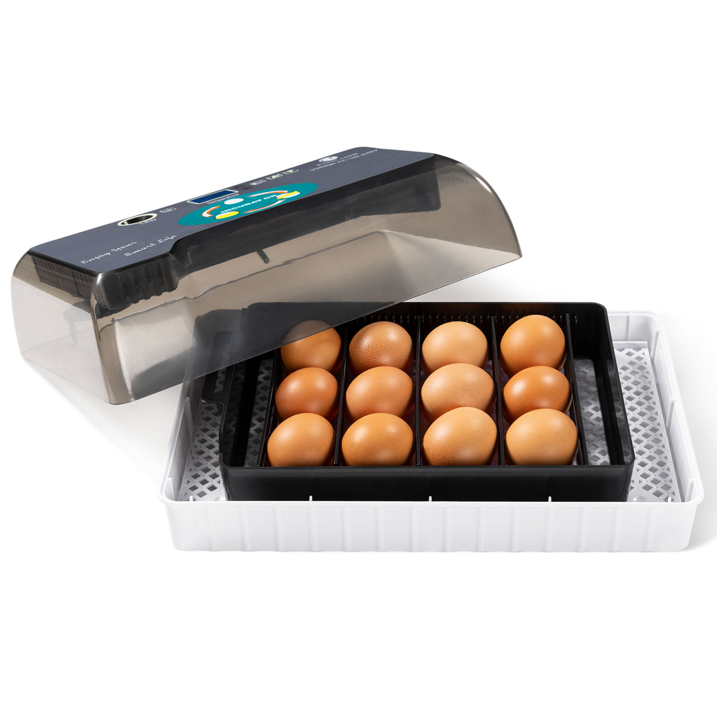 Améliorez votre taux d'éclosion grâce à la couveuse 12 œufs idéale pour tous types de gallinacés. La couveuse est munie d'un mire-œufs pour vous permettre de voir si vos œufs sont fécondés ou non avant de les mettre dans la couveuse. Optimisez ainsi vos chances d'éclosion de poussins.L'incubateur toutes volailles vous permet de faire couver jusqu'à 12 œufs de poule, 9 œufs de canard, 4 œufs d'oie, 24 œufs de pigeon ou 35 œufs de caille. Vous disposez de 6 réglettes pour organiser votre couveuse en fonction de la taille des œufs.Avec cette couveuse automatique, vous pouvez très rapidement agrandir votre élevage en gagnant du temps. Idéal pour une meilleure couvaison, l'incubateur vous permet d'obtenir un taux d'éclosion plus sûr grâce à un suivi plus précis et minutieux. Le couvercle transparent de l'incubateur vous permet de vérifier l'évolution de la couvaison et leur condition sans avoir à l'ouvrir. Parfaite pour tous les éleveurs, la couveuse dispose d'un écran numérique afin de suivre certains réglages selon la catégorie d'œufs couvés : - Affichage de la température allant de 20 à 50°- Affichage du taux d'humidité (hygrométrie) - Affichage du décompte avant rotation automatique- Affichage du jour d'incubationGrâce à ces paramètres, les conditions de couvaison de la mère sont parfaitement reproduites.Comme son nom l'indique, la couveuse gère seule le retournement des œufs sans que vous ayez à vous en inquiéter. Ainsi, toutes les 2H, les œufs seront oscillés de droite à gauche afin que l'embryon ne se colle pas à la membrane de l'œuf. Grâce à ce système de couvaison artificielle, vos petits poussins naîtront après les 21 jours d'incubation. Laissez-les encore une journée dans leur couveuse afin de laisser sécher leur plumage et qu'ils prennent quelques forces avant de rejoindre vos autres poules.Conseil IDMarket : En fonction du type d'œuf, la durée d'incubation n'est pas la même, ne mélangez donc pas différentes typologie d'œufs pendant la même couvaison. Dimensions de la couveuse toutes volailles Dimensions totales : Longueur 32,2 cm x largeur 21 cm x Hauteur 12 cmCapacité : 12 œufs de poule - 9 œufs de canard - 4 œufs d'oie - 24 œufs de pigeon - 35 œufs de cailleSystème d'alarme en cas d'écart de température ou humidité6 réglettes fourniesPuissance 140W – Tension 220VCertifications CE - EMC - RoHS – LVDDécouvrez nos autres modèles de couveuses à œufs disponibles sur notre boutique en ligne :- Couveuse automatique 48 œufs incubateur autonome intelligent- Couveuse automatique 112 œufs incubateur autonome intelligent- Couveuse PRO automatique 56 œufs éclairés incubateur autonome avec LED mire œufs