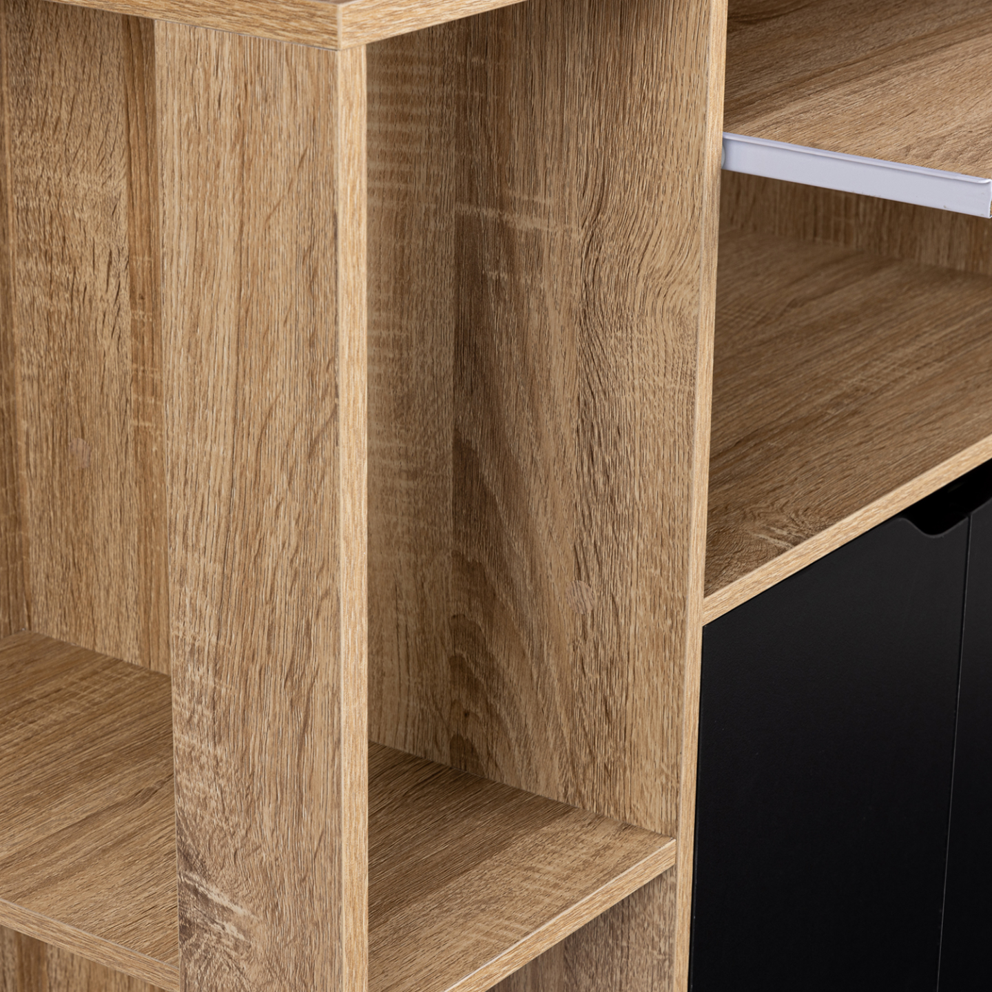 Vous venez de tomber sur le rangement idéal pour votre intérieur ! Grâce à votre nouvelle desserte, vous allez pouvoir aménager votre cuisine comme bon vous semble ! Outre toutes ses fonctions vous venez de trouver un produit design et pratique. Profitez de ses deux rangements sur le côté pour y stocker vos huiles, vinaigres et épices. Gardez ainsi tous vos condiments à portée de main pendant que vous cuisinez !Mobile grâce à ses 4 roulettes, vous pourrez la déplacer à votre guise pour trouver la configuration parfaite ! Son design soigné et contemporain s'adapte à tout type de cuisine. Ouvrez les portes noires design du meuble et découvrez son large rangement ! Quoi de mieux pour pouvoir empiler des montagnes de vaisselles, de torchons, de conserves ou de produits d'entretien.Ses multifonctions ne s'arrêtent pas là ! Relevez votre tête : une grande niche de rangement se trouve juste au-dessus du placard. Il vous offre l'espace parfait pour entreposer des denrées périssables.Le meuble est recouvert d'un large plateau ainsi que d'une tablette coulissante. Utilisez cette surface pour cuisiner ou continuer votre rangement.En plus de toutes ces solutions de rangement et ces avantages, vous choisissez une desserte élégante et moderne, idéale avec votre déco intérieure.Alors n'hésitez plus et alliez praticité et esthétisme en un clin d'œil grâce à cette belle desserte de cuisine COSI ! Dimensions de la desserte façon hêtre portes noires- Dimensions totales : Longueur 76 cm x Profondeur 39,5 cm x Hauteur 85 cm- Dimensions du placard fermé : L. 50 x P. 38 x H. 48 cm- Dimensions des étagères de gauche : L.21.5 x H. 38 cm- Dimensions des portes noires : L. 24,5 x H. 48 cm- Dimensions du plateau coulissant sur rail : L. 48 x P. 35 x H. 74.5 cm- 4 roulettes dont 2 avec frein- Panneaux de particules - Fond de placard en MDF de 2 mm- Coloris : bois façon hêtre et portes noires- À monter soi-mêmeCe modèle COSI est disponible en différents coloris sur notre boutique en ligne :- Desserte de cuisine COSI bois noir et plateaux façon hêtre- Desserte de cuisine COSI bois blanc et plateaux façon hêtreRetrouvez l'ensemble de nos meubles et éléments de cuisine sur notre boutique en ligne !