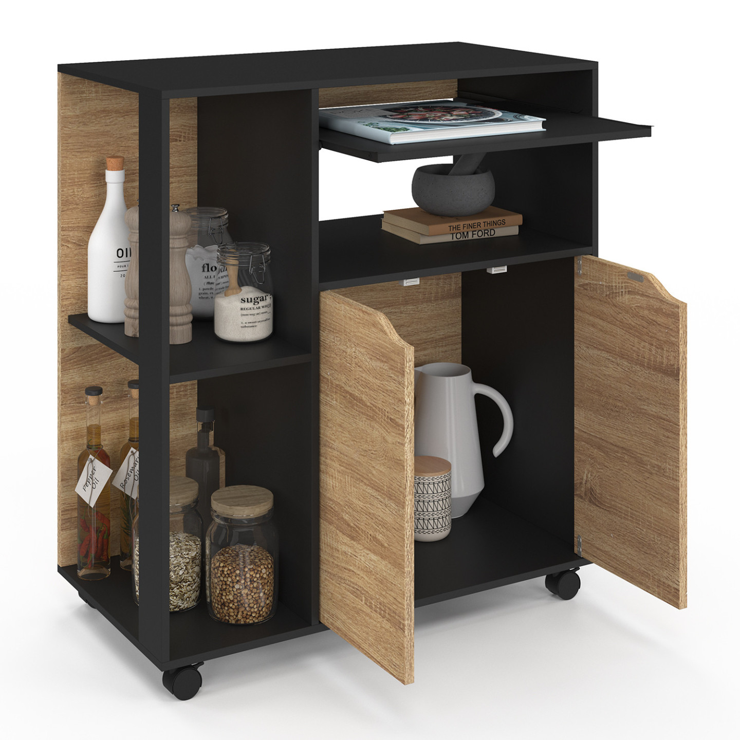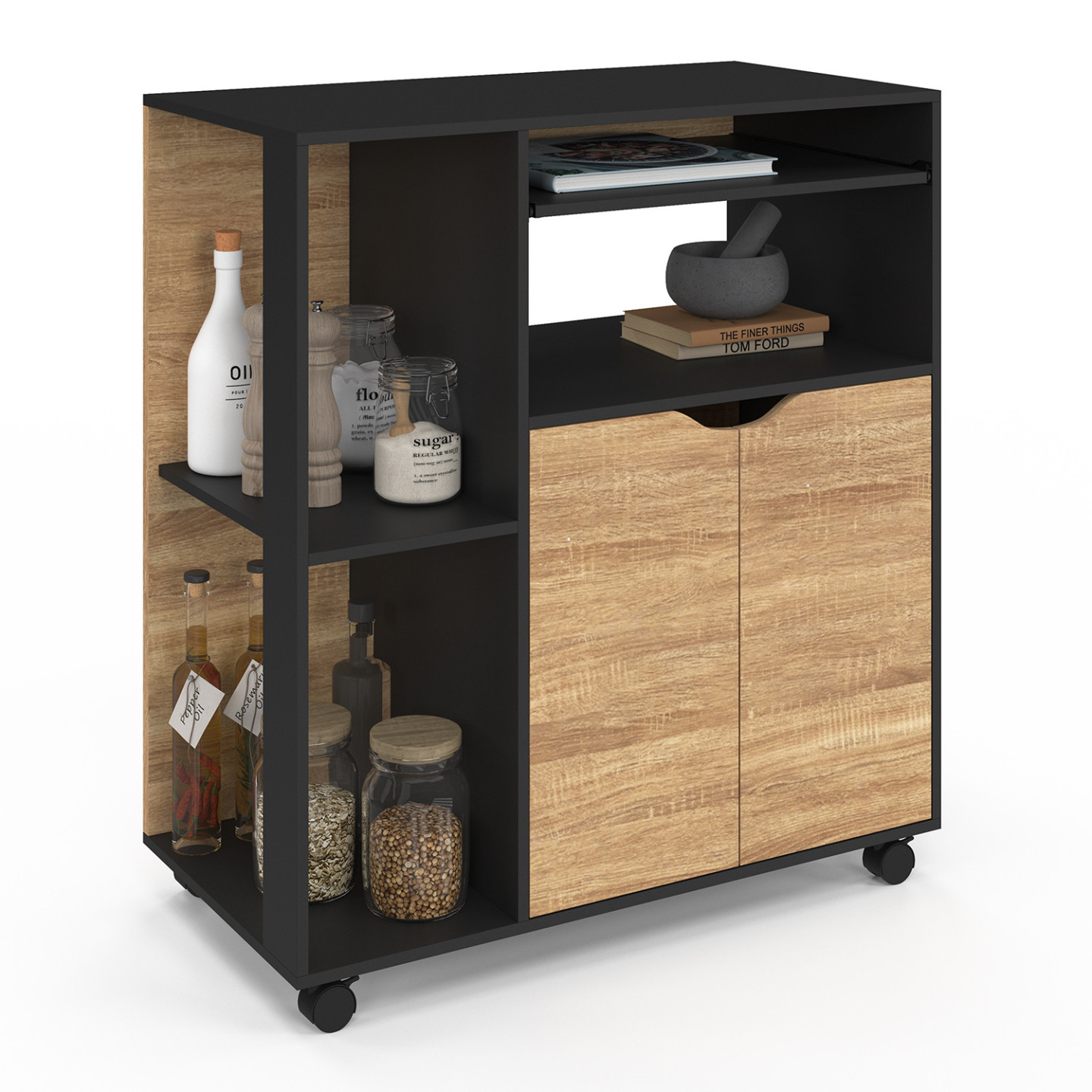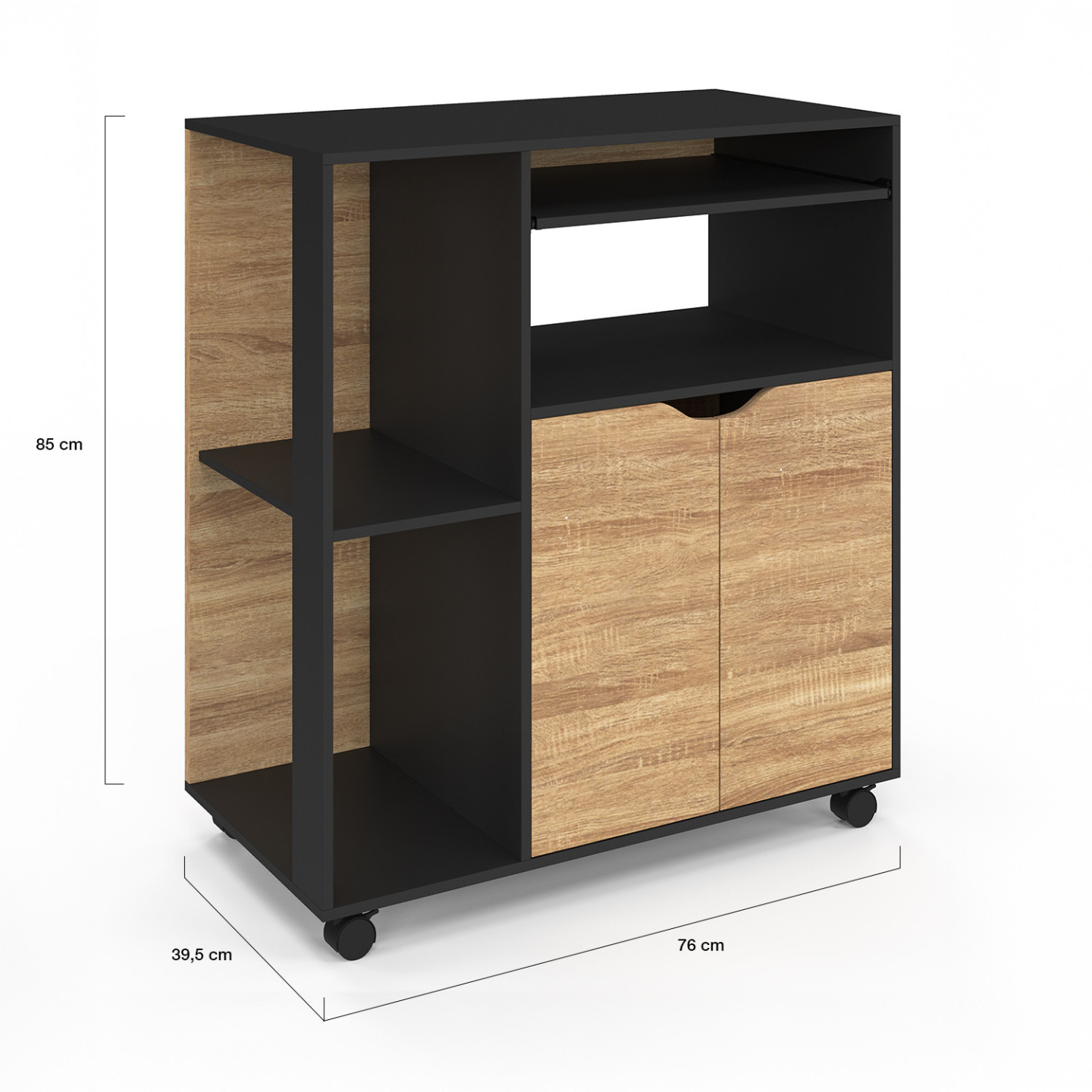 Voilà le meuble parfait pour l'optimisation de votre espace ! Organisez votre cuisine comme vous rêviez grâce à votre nouvelle desserte. Quoi de plus tendance que le mélange noir et bois ? La desserte de cuisine COSI vous offre de nombreux rangements ! Stockez vos huiles, vinaigres, épices et bouteilles dans les deux rangements latéraux prévus à cet effet. Ses 4 roulettes, dont 2 avec frein, vous permettent de déplacer la desserte à votre guise tout en gardant à portée de main vos condiments pendant que vous cuisinez.Derrière les portes façon hêtre ultra-design de votre meuble, se cachent encore un large rangement ! Empilez toute votre vaisselle, torchons, conserves ou produits d'entretien dans cet espace fermé, très pratique pour dissimuler votre petit bazar de cuisine. Ses multifonctions ne s'arrêtent pas là ! Juste au-dessus du placard, vous trouverez une grande niche de rangement, idéal pour y entreposer vos denrées périssables.Ce meuble possède également un large plateau ainsi qu'une tablette coulissante que vous pouvez utiliser pour cuisiner ou continuer votre rangement. Outre toutes les solutions de rangement proposées, cette desserte de cuisine apporte une touche élégante et moderne à votre cuisine grâce à son côté bicolore noir et bois. Besoin de gagner de l'espace dans votre cuisine ? Laissez-vous séduire par cette desserte roulante, ultra design et fonctionnelle, qui ravivera votre déco intérieure en un tour de main !Dimensions de la desserte bois noir et plateaux façon hêtreDimensions globales : Longueur 76 cm x largeur 39,5 x Hauteur 85 cmDimensions étagère gauche : L. 21,5 x H. 38 cmDimensions placard fermé : L. 50 x l. 38 x H. 48 cmDimensions plateau coulissant : L. 48 x l. 35 x H. 74.5 cmDimensions portes : L. 24.5 x H. 48 cmHauteur au-dessus du sol (roulettes) : 5 cm4 roulettes dont 2 avec freinPlateau coulissant sur railMatériaux : Panneaux de particules et MDFColoris : Noir et plateaux façon hêtreÀ monter soi-même Retrouvez l'ensemble de nos meubles et éléments de cuisine sur notre boutique en ligne !