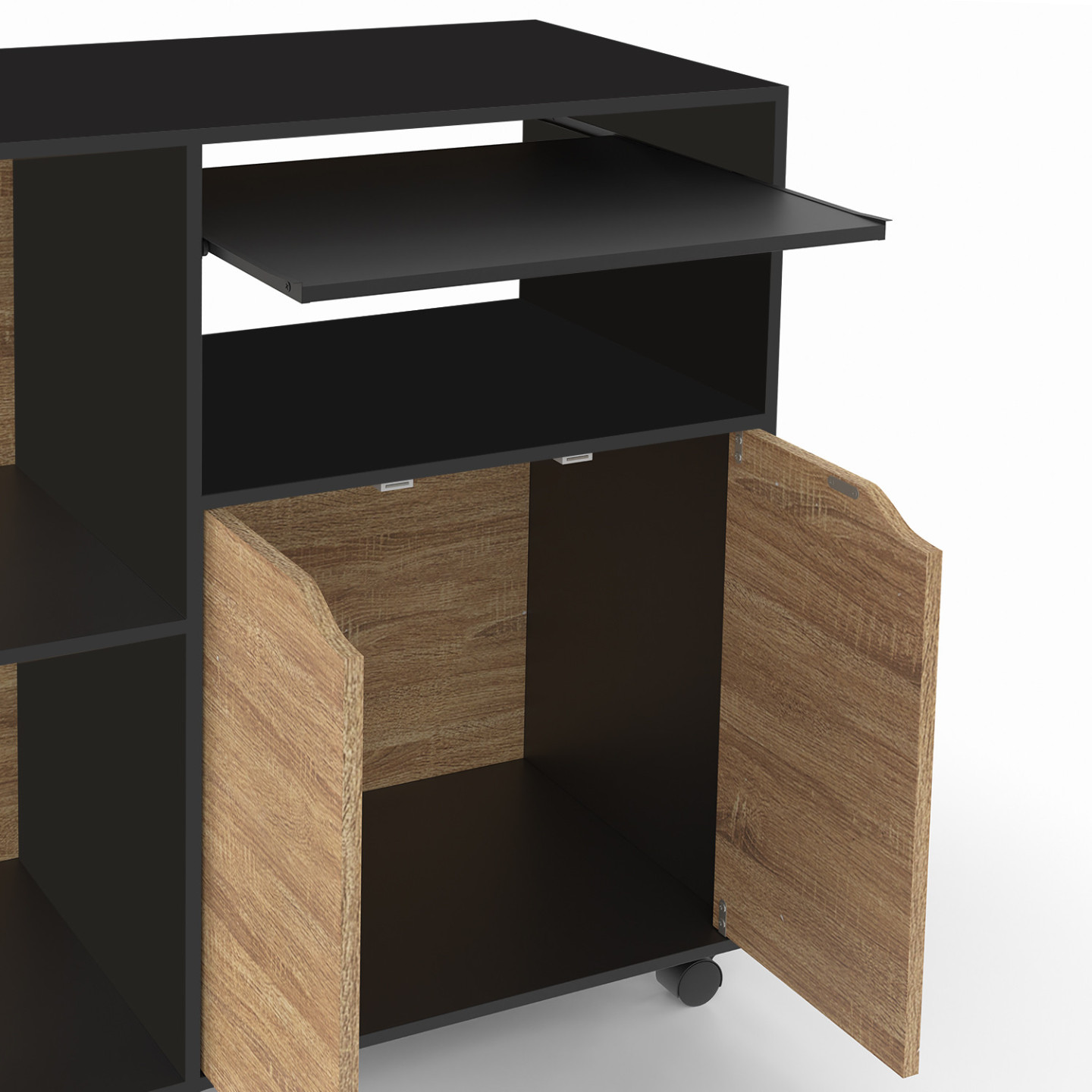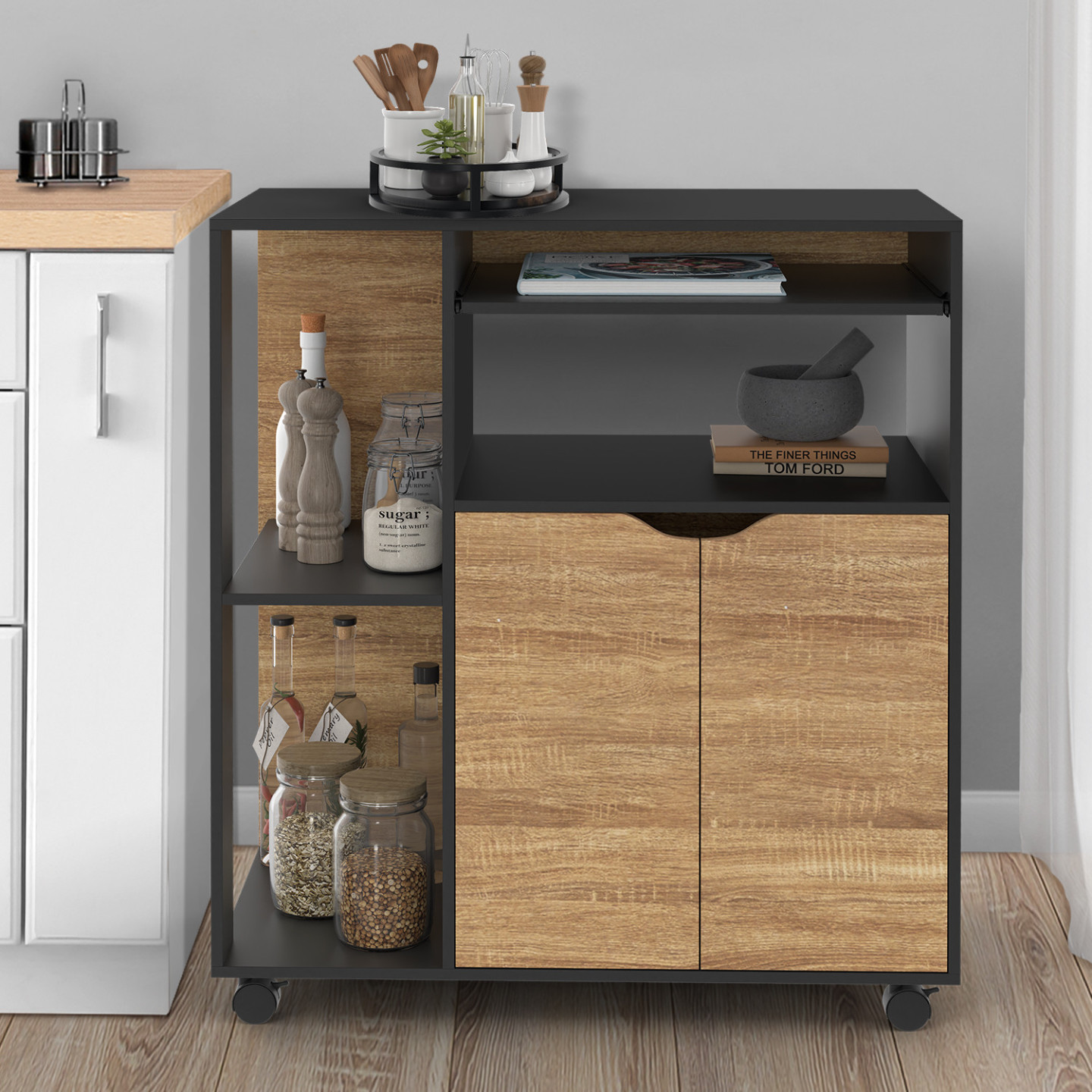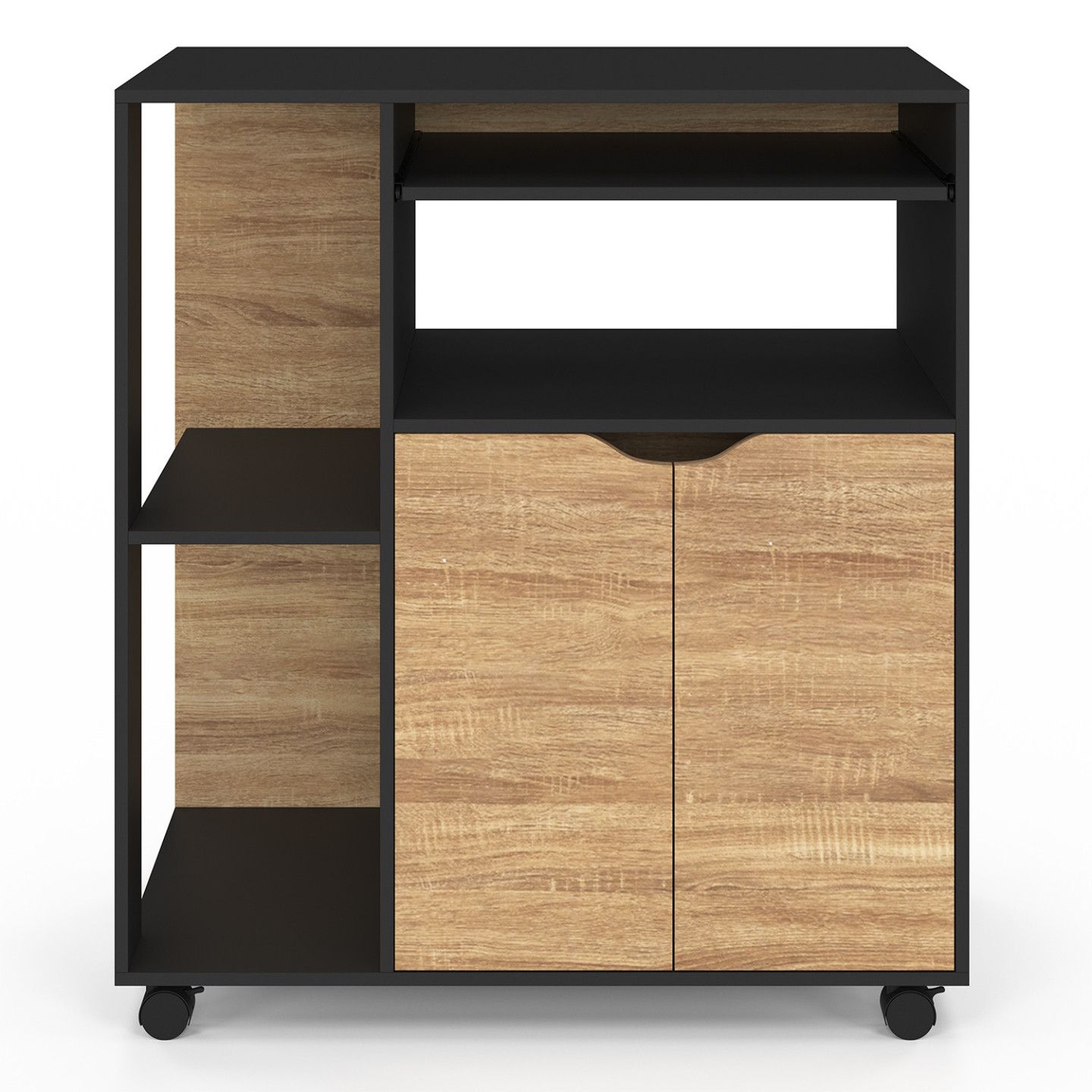 Voilà le meuble parfait pour l'optimisation de votre espace ! Organisez votre cuisine comme vous rêviez grâce à votre nouvelle desserte. Quoi de plus tendance que le mélange noir et bois ? La desserte de cuisine COSI vous offre de nombreux rangements ! Stockez vos huiles, vinaigres, épices et bouteilles dans les deux rangements latéraux prévus à cet effet. Ses 4 roulettes, dont 2 avec frein, vous permettent de déplacer la desserte à votre guise tout en gardant à portée de main vos condiments pendant que vous cuisinez.Derrière les portes façon hêtre ultra-design de votre meuble, se cachent encore un large rangement ! Empilez toute votre vaisselle, torchons, conserves ou produits d'entretien dans cet espace fermé, très pratique pour dissimuler votre petit bazar de cuisine. Ses multifonctions ne s'arrêtent pas là ! Juste au-dessus du placard, vous trouverez une grande niche de rangement, idéal pour y entreposer vos denrées périssables.Ce meuble possède également un large plateau ainsi qu'une tablette coulissante que vous pouvez utiliser pour cuisiner ou continuer votre rangement. Outre toutes les solutions de rangement proposées, cette desserte de cuisine apporte une touche élégante et moderne à votre cuisine grâce à son côté bicolore noir et bois. Besoin de gagner de l'espace dans votre cuisine ? Laissez-vous séduire par cette desserte roulante, ultra design et fonctionnelle, qui ravivera votre déco intérieure en un tour de main !Dimensions de la desserte bois noir et plateaux façon hêtreDimensions globales : Longueur 76 cm x largeur 39,5 x Hauteur 85 cmDimensions étagère gauche : L. 21,5 x H. 38 cmDimensions placard fermé : L. 50 x l. 38 x H. 48 cmDimensions plateau coulissant : L. 48 x l. 35 x H. 74.5 cmDimensions portes : L. 24.5 x H. 48 cmHauteur au-dessus du sol (roulettes) : 5 cm4 roulettes dont 2 avec freinPlateau coulissant sur railMatériaux : Panneaux de particules et MDFColoris : Noir et plateaux façon hêtreÀ monter soi-même Retrouvez l'ensemble de nos meubles et éléments de cuisine sur notre boutique en ligne !
