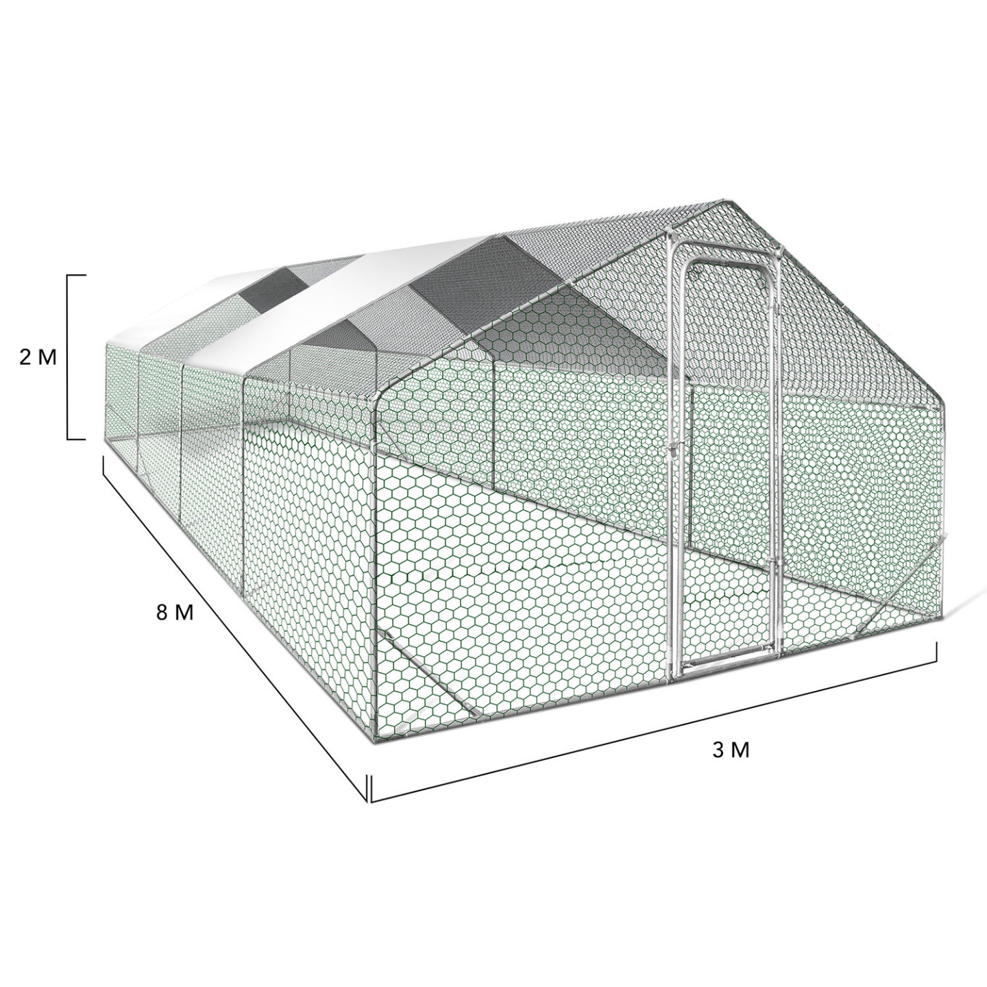 Vous disposez d'un grand nombre de poules ou d'animaux de basse-cour ? Vous souhaitez protéger tout votre élevage en leur offrant un nouvel espace pour qu'ils se sentent à l'aise dans un grand espace ? Avec cet enclos de 24M², profitez d'une zone de promenade très étendue tout en restant sécurisée.Avec cette clôture grillagée vous mettez l'ensemble de vos poules et autres animaux de basse-cour à l'abri des prédateurs. Renards, chiens, chats et oiseaux de proie seront incapables d'attaquer vos volailles.Grâce à une bâche de toit imperméable en polyester et anti-UV, vos gallinacés sont protégés non seulement de la pluie, mais également du soleil l'été. Offrez à la fois une très grande aire de détente et un abri pour vos poules et autres oiseaux de basse-cour où ils pourront s'ébattre en toute sécurité.Cet enclos grillagé pour poules peut accompagner vos poulaillers en bois ce qui permet d'offrir un cadre de vie naturel à vos animaux. Accédez facilement à l'enclos des poules grâce à sa porte sécurisée avec loquet et allez ainsi récupérer les œufs de vos volatiles sans risquer de les voir s'échapper.Facile à monter et d'une très grande superficie de 24m², la volière en acier vous permet d'élever une vingtaine de poules dans votre jardin.Astuce : pensez à ancrer votre enclos avec des sardines pour qu'aucun intrus ne puisse creuser et passer par dessous sous votre grillage.N'hésitez plus, protégez toutes vos poules ou animaux de basse-cour et offrez leur un très grand espace ! Nous vous conseillons en cas d'intempéries de retirer la bâche afin de prévenir le risque de stagnation d'eau.Dimensions de l'enclos poulailler 24 m² parc grillagéDimensions totales hors tout : Longueur 800 cm x largeur 300 cm x Hauteur 200 cmDimensions de la porte : Longueur 60 cm x Hauteur 170 cmMatériaux : Structure et grillage en acier galvanisé, filet, brise-soleil en polyéthylèneColoris : Structure grise, grillage vert ou gris selon arrivage, filet noir, brise-soleil blancDiamètre des tubes de la structure : 19 mm – D. 0.6 mmConnecteurs : 22 mmGrillage triple torsion sur les côtés + filet sur le toit1 brise-soleil en tissu imperméable et protection anti-UV : 340 x 190 m6 barres de force 14 piquets d'ancrageÀ monter soi-mêmePour plus de facilité de montage, nous vous conseillons d'être 2 personnes (temps estimé : 120 min).Poulaillers en bois vendus séparément sur notre boutique en ligne.Découvrez également toute notre gamme d'enclos poulaillers sur notre boutique en ligne !