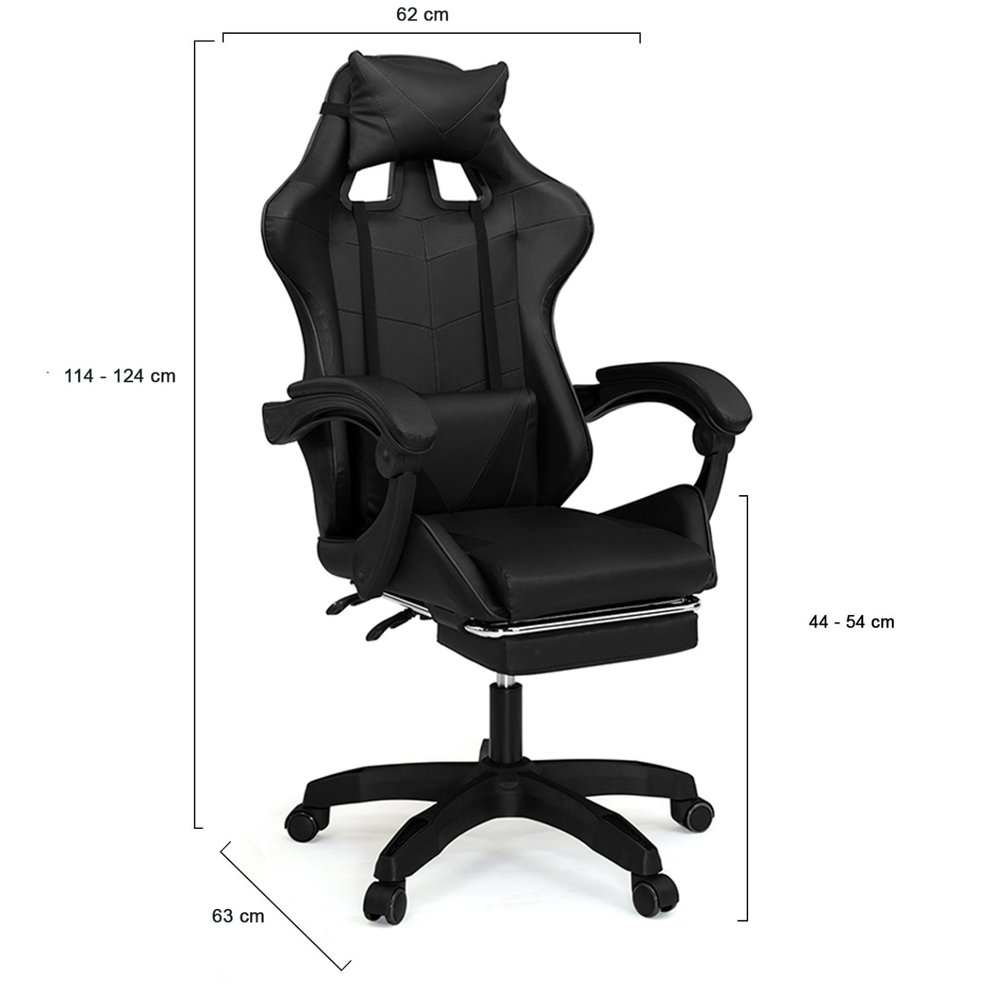 2-en-1, le fauteuil gaming ALEX noir sera l'allié de vos journées de télétravail et de vos soirées jeux ! Son design moderne s'associera facilement à une ambiance de gamer avec des lumières LED mais aussi à un intérieur plus contemporain ou industriel.Ce fauteuil de bureau est doté d'une assise large et confortable dont la hauteur est réglable de 44 à 54 cm ainsi que d'un dossier inclinable jusqu'à 135° pour s'ajuster au mieux à vos besoins et vous permettre de varier votre position au fil du temps. Réglez la hauteur et l'inclinaison du fauteuil sans effort grâce aux deux leviers disposés sous l'assise !Les coussins appui-tête et dorsal sont ajustables à la hauteur de votre choix pour soutenir votre tête et votre colonne vertébrale. Les accoudoirs vous permettront de conserver une position optimale pour vos bras.Le repose-pied télescopique se déplie en un clin d'œil pour vous offrir un moment de détente entre deux parties de jeu ou deux réunions ! Avec le dossier incliné et le repose-pied sorti, vous serez également très bien installé pour regarder un film ou une série ! Grâce au siège pivotant de cette chaise de bureau à roulettes, saisissez vos dossiers ou votre café sans avoir à vous lever !Son revêtement déperlant et ses coussins déhoussables sont faciles à nettoyer et ne craignent pas les tâches !N'attendez plus pour profiter du confort de la chaise de gaming-fauteuil de bureau ALEX pour enrichir votre mobilier de bureau !Dimensions du fauteuil de gaming ALEXDimensions globales : Longueur 63 cm x largeur 62 cm x Hauteur 114 à 124 cmDimensions de l'assise : L. 51 x l. 49 x H. 44 à 54 cmHauteur du dossier : 78 cmDimensions des accoudoirs : L. 48 x l. 7 x H. 20 cm Dimensions du repose-pied : L. 32 x l. 20 cmDimensions de l'appui-tête : L. 28 x H. 18 cmDimensions du coussin dorsal : L. 31 x H. 20 cmAppui-tête et coussin dorsal ajustables et déhoussables5 rouesÀ monter soi-mêmeCe modèle de chaise gaming est également disponible en noir et gris, noir et rouge, noir et blanc ainsi que noir et bleu.