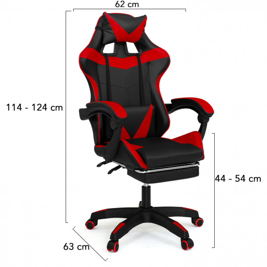 2-en-1 le fauteuil gaming ALEX noir et rouge sera l'allié de vos journées de télétravail et de vos soirées jeu ! Son design moderne s'associera facilement à une ambiance de gamer avec des lumières LED mais aussi à un intérieur plus contemporain ou industriel.Ce fauteuil de bureau est doté d'une assise large et confortable dont la hauteur est réglable de 44 à 54 cm ainsi que d'un dossier inclinable jusqu'à 135° pour s'ajuster au mieux à vos besoins et vous permettre de varier votre position au fil du temps. Réglez la hauteur et l'inclinaison de la chaise sans effort grâce aux deux leviers disposés sous l'assise !Les coussins appui-tête et dorsal sont ajustables à la hauteur de votre choix pour soutenir votre tête et votre colonne vertébrale. Les accoudoirs vous permettront de conserver une position optimale pour vos bras.Le repose-pied télescopique se déplie en un clin d'oeil pour vous offrir un moment de détente entre deux parties de jeu ou deux réunions ! Avec le dossier incliné et le repose-pied sorti, vous serez également très bien installé pour regarder un film ou une série ! Grâce au siège pivotant de cette chaise de bureau à roulettes, saisissez vos dossiers ou votre café sans avoir à vous lever !Son revêtement déperlant et ses coussins déhoussables sont faciles à nettoyer et ne craignent pas les tâches !N'attendez plus pour profiter du confort de la chaise de gaming-fauteuil de bureau ALEX !Dimensions du fauteuil de gaming ALEXDimensions globales : Longueur 63 cm x largeur 62 cm x Hauteur 114 à 124 cmDimensions de l'assise : L. 51 x l. 49 x H. 44 à 54 cmHauteur du dossier : 78 cmDimensions des accoudoirs : L. 48 x l. 7 x H. 20 cm Dimensions du repose-pied : L. 32 x l. 20 cmDimensions de l'appui-tête : L. 28 x H. 18 cmDimensions du coussin dorsal : L. 31 x H. 20 cmAppui-tête et coussin dorsal ajustables et déhoussables5 rouesÀ monter soi-mêmeD'autres modèles de chaises gaming sont également disponible en ligne.