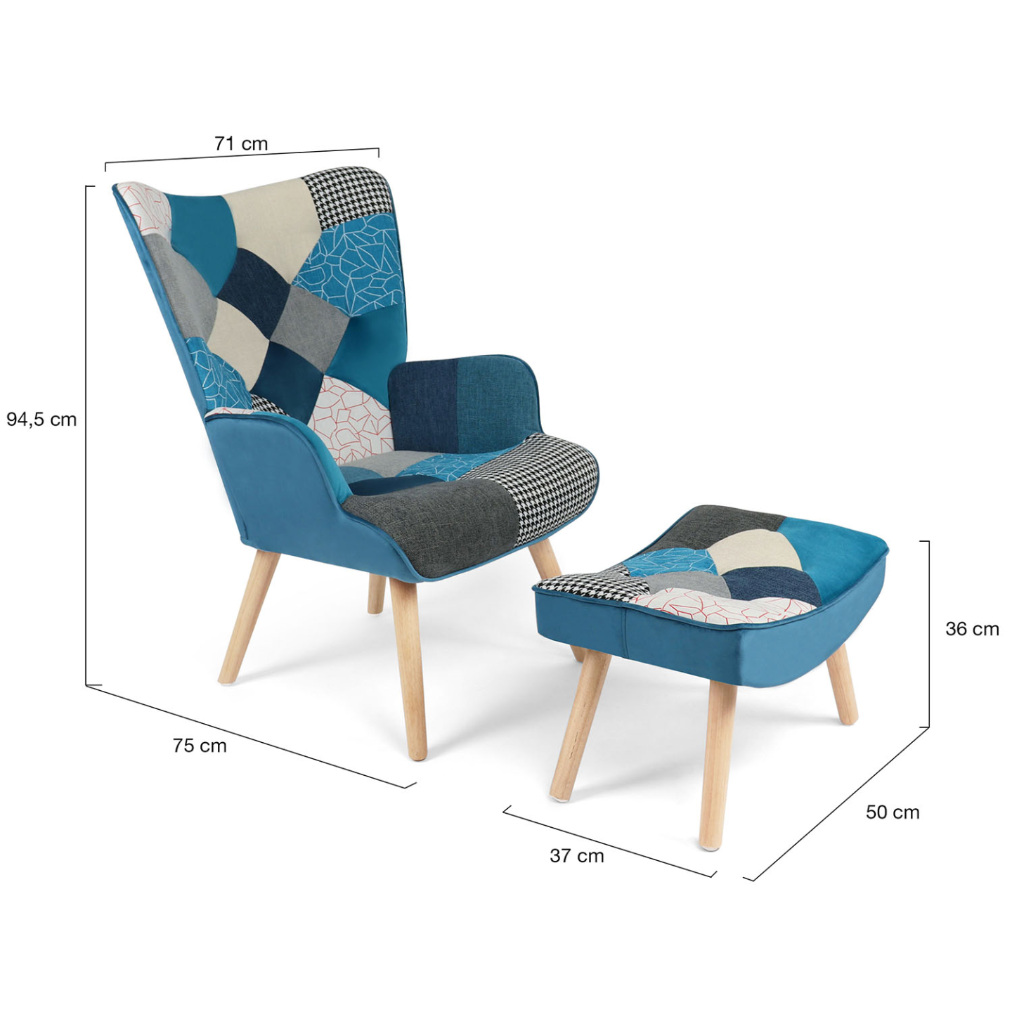 IDMARKET Fauteuil scandinave IVAR avec repose pieds en tissu patchwork et velours bleu
