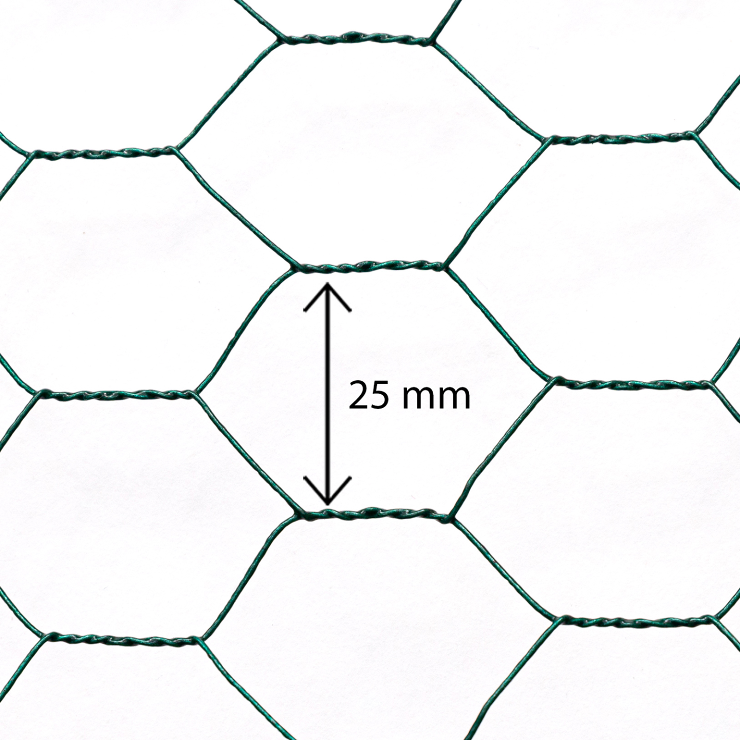 Ne cherchez plus, nous avons trouvé la solution idéale pour augmenter le terrain de vos animaux et protéger vos cultures des prédateurs ! Le grillage en acier galvanisé de 1x25M vous permet de créer l'espace que vous souhaitez grâce à ses larges dimensions et à sa maniabilité. Avec ses 25M de longueur, le grillage triple torsion en revêtement PVC vert est idéal pour l'extérieur. Vous pouvez sécuriser de grands espaces, afin de protéger vos animaux comme vos cultures.Parfaitement adapté aux animaux, ce grillage souple et ses mailles de 25mm sont parfaites pour accueillir vos animaux. Conseil : pour une protection optimale de vos animaux, pensez à les rentrer chaque soir dans leur poulailler ou abri. Robuste et facile à installer, vous pouvez découper et ajuster à votre guise ce grillage hexagonal, selon vos envies et vos besoins. Fabriqué en acier galvanisé, sa surface est recouverte d'un revêtement en PVC de coloris vert. Multifonction, ce grillage de 25M peut vous servir dans de nombreuses occasions : pour protéger vos cultures des animaux, pour clôturer votre potager, pour créer une clôture extérieure ou encore comme support pour des plantes grimpantes ! Alors n'hésitez plus et optez pour ce grillage 1x25M vert qui sera parfait pour délimiter un espace de jeux pour vos animaux ou pour vos cultures ! Dimensions de la clôture souple de jardin acier galvanisé revêtement PVC- Dimensions totales hors tout : Longueur 25 M x Hauteur 1 M- Maille de 25 mm triple torsion hexagonale- Epaisseur : 0,7 mm- Matière : acier galvanisé + revêtement PVC vertDécouvrez nos autres coloris et tailles de maille disponibles sur ce grillage : - Grillage pour poules vert 1x25M maille 13mm triple torsion clôture souple jardin animaux- Grillage pour poules 1x25M maille 13mm triple torsion clôture souple jardin animaux- Grillage pour poules 1x25M maille 25mm triple torsion clôture souple jardin animaux