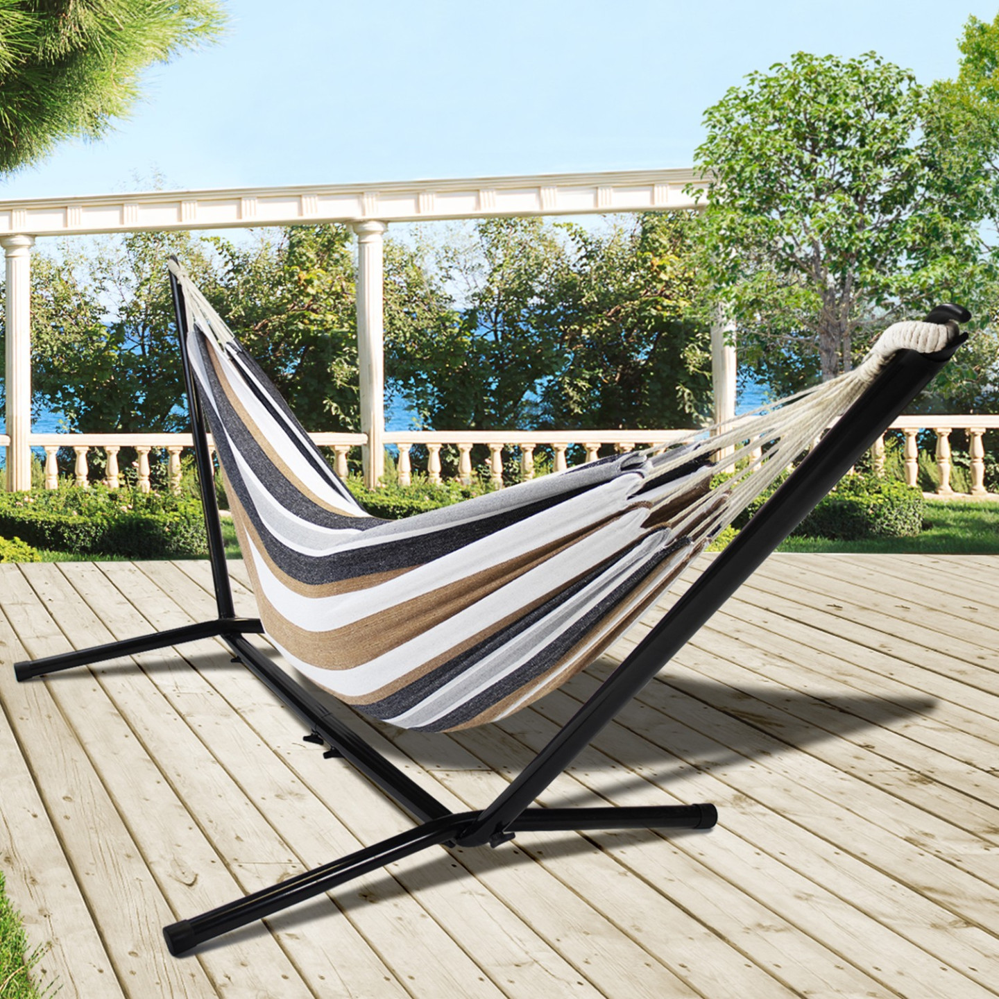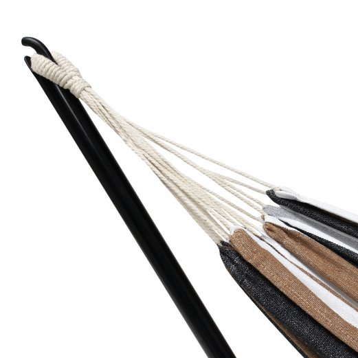 | Libellé | IDMARKET Hamac avec support métal et toile rayée noire, blanche et chocolat |