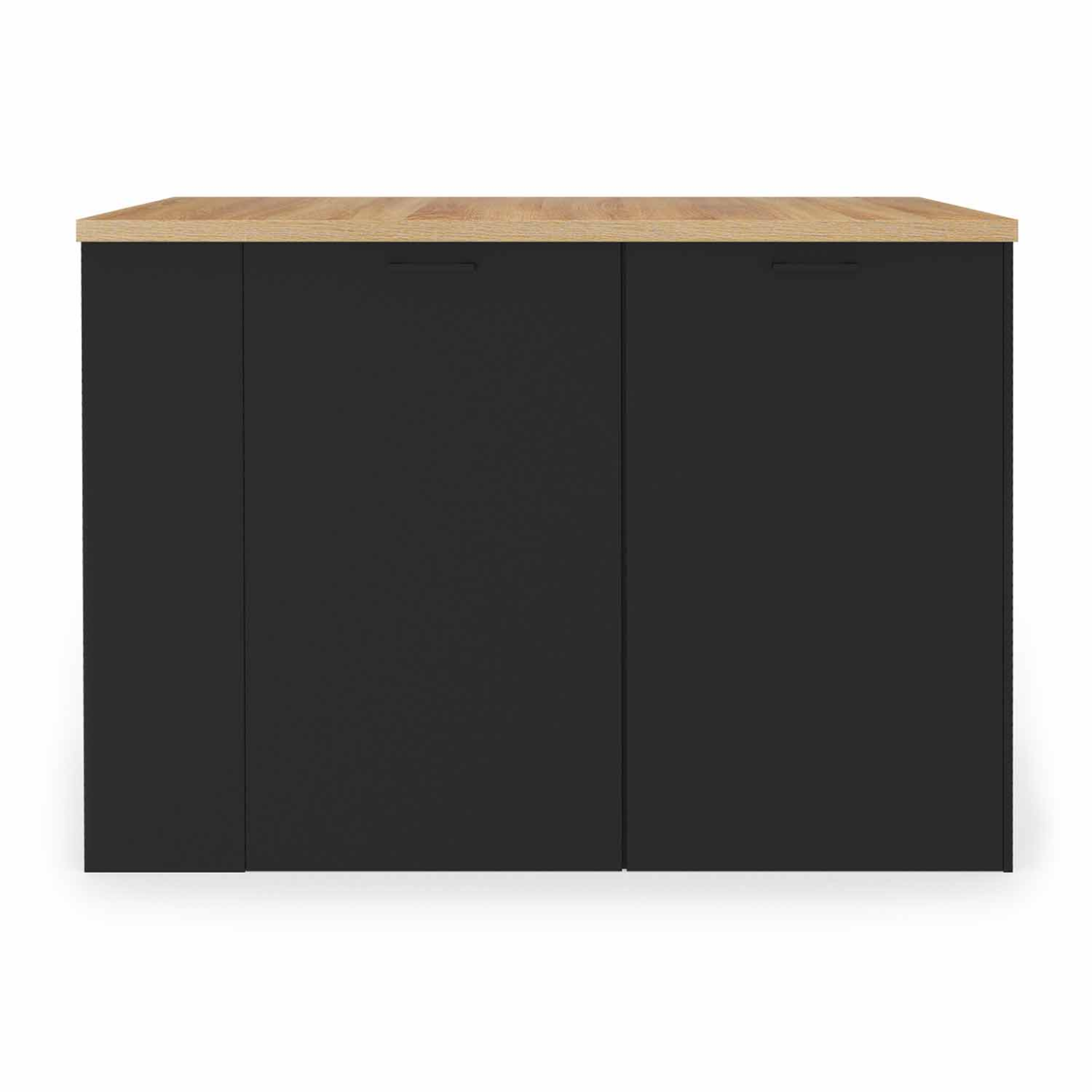 L'espace de votre intérieur, de votre cuisine sera optimisé grâce à notre îlot central bois noir avec plan de travail et étagères assorties façon hêtre !Le design moderne de cet îlot central, ses lignes droites et épurées, ses couleurs sobres tout en contraste, et ses finitions mates lui permettent de s'adapter idéalement à tout type d'intérieur ! Il conférera un aspect net et rangé à votre cuisine !Son format généreux mais néanmoins compact, peu encombrant, facilite la circulation tout en évitant les pas inutiles au quotidien dans votre pièce de vie. Il structure l'espace de votre cuisine ! Parfait pour les pièces de vie ouvertes et aérées !Cet îlot central de forme rectangulaire classique est idéalement conçu pour recevoir 2 couverts grâce à son renfoncement latéral. Ambiance cosy pour des petits-déjeuners à 2 !Son plateau d'une épaisseur de 3 cm offre un solide plan de travail large et profond pour poser plats, bouteilles, etc.Pratique et fonctionnel, il dispose de 2 portes latérales aux jolies poignées noires, donnant sur 2 compartiments dotés d'une étagère intermédiaire ajustable en hauteur pour organiser votre rangement !Sur le côté, les 3 étagères latérales seront parfaites pour garder à portée de main condiments, verres ou encore bouteilles. De quoi optimiser au maximum votre espace !Sa structure en PB (panneaux de particules) épaisseur 1,5 cm lui apporte stabilité et robustesse.Tantôt coin repas, tantôt coin cuisine, avec sa triple fonction table haute/plan de travail/meuble de rangement, il vous fera gagner du temps et de l'espace, et apportera un look contemporain à votre intérieur !Optez sans tarder pour cet îlot tendance à la fois fonctionnel et décoratif !Dimensions de l'îlot central de cuisine TIBODimensions globales : Longueur 120 cm x largeur 70 cm x Hauteur 90 cmDimensions intérieur placard : L. 48,5 x l. 31,5 x H. 79,6 cmEtagère ajustable en hauteur à l'intérieurEtagères latérales : 62 x 18,5 x 25,4 cmEspace pour le côté bar : 98 x 30 x 87 cmPoignées : 11 x 2 cmEpaisseur du plan de travail : 3 cmDébord du plan de travail : 2,4 cm sur l'avant et l'arrière de l'îlotMatériaux : Panneaux en particules de bois mélaminés (3 mm)Nettoyage rapide et entretien facile avec chiffon humide douxÀ monter soi-mêmeProduit vendu seul, sans les tabouretsL'îlot de cuisine TIBO se mariera parfaitement avec le lot de 2 tabourets DETROIT. Ce modèle est également disponible dans d'autres coloris : - Ilot central TIBO 120 cm bois blanc avec plan de travail façon hêtre- Ilot central TIBO 120 cm bois blanc avec plan de travail gris anthraciteDécouvrez également l'ensemble de nos meubles et éléments de cuisine sur notre boutique en ligne !