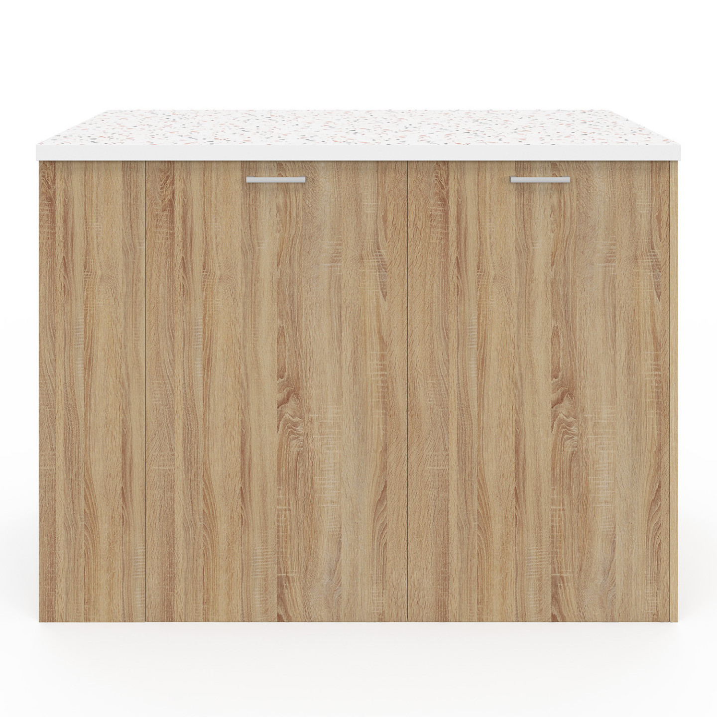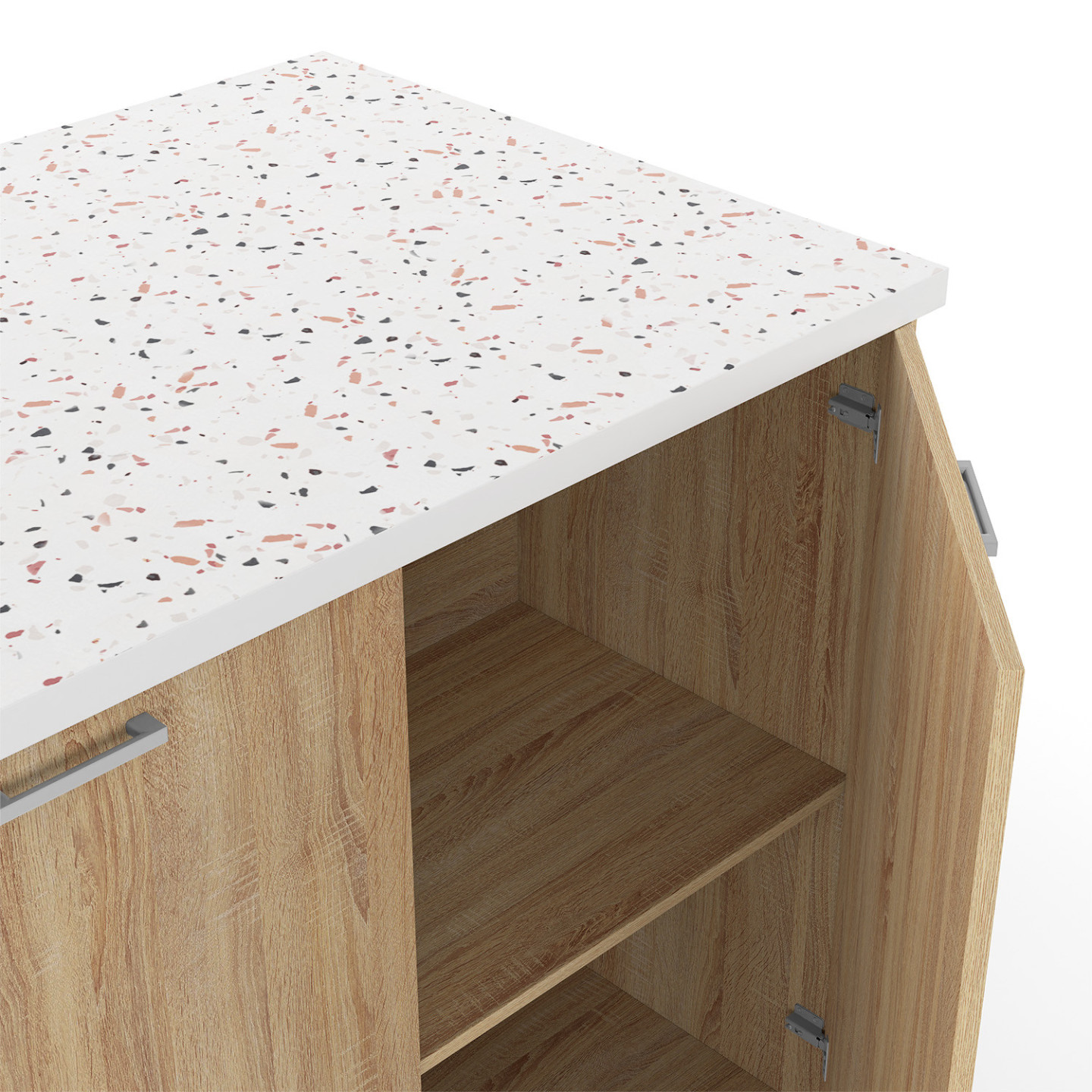 L'espace de votre cuisine sera optimisé grâce à notre îlot bois façon hêtre et effet terrazzo SIMONE !Le design moderne de cet îlot central avec rangements lui permet de s'adapter à tout type d'intérieur tout en gardant un aspect net et rangé !Son format généreux mais néanmoins compact, peu encombrant, facilite la circulation tout en évitant les pas inutiles au quotidien dans votre pièce de vie. Il structure l'espace de votre cuisine ! Parfait pour les pièces de vie ouvertes et aérées !Son plateau original au coloris terrazzo ultra tendance d'une épaisseur de 3 cm offre un solide plan de travail large et profond pour poser plats, bouteilles, etc.Pratique et fonctionnel, il dispose de 2 portes latérales aux jolies poignées, donnant sur 2 compartiments dotés d'une étagère intermédiaire ajustable en hauteur pour organiser votre rangement !Sur le côté, les 3 étagères latérales seront parfaites pour garder à portée de main condiments, verres ou ustensiles. De quoi optimiser au maximum votre espace !Sa structure en panneaux de particules lui apporte stabilité et robustesse.Optez sans tarder pour cet îlot tendance à la fois fonctionnel et décoratif !Dimensions de l'îlot central de cuisine TIBODimensions globales : Longueur 120 cm x largeur 70 cm x Hauteur 90 cmDimensions intérieur placard : L. 48,5 x l. 31,5 x H. 79,6 cmEtagère ajustable en hauteur à l'intérieurEtagères latérales : 62 x 18,5 x 25,4 cmEspace pour le côté bar : 98 x 30 x 87 cmEpaisseur du plan de travail : 3 cmDébord du plan de travail : 2,4 cm sur l'avant et l'arrière de l'îlotMatériaux : Panneaux en particules de bois mélaminés (3mm)Nettoyage rapide et entretien facile avec chiffon humide douxÀ monter soi-mêmeProduit vendu seul, sans les tabouretsDécouvrez également l'ensemble de nos meubles et éléments de cuisine sur notre boutique en ligne !