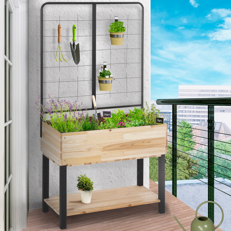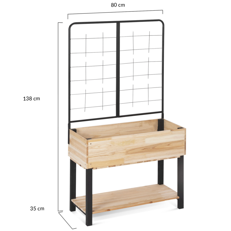 Cette jolie jardinière de 80 x 35 cm aux pieds peints en noir et au treillis en métal apporte un effet industriel très tendance à votre potager.Profitez de son large bac de plantation pour vous essayer au jardinage. Plantez un ensemble d'aromates, que vous serez fier de présenter dans vos salades d'été. Vous préférez une ambiance florale ? Optez pour un mélange de fleurs grimpantes et rampantes pour créer une composition unique. Les fleurs bénéficient du treillis pour se développer selon leur besoin et vous offrir le spectacle de leur éclosion. Le bac de la jardinière de 20 cm de hauteur et situé à 60 cm du sol, cela vous permet de cultiver sans avoir à vous agenouiller, mais aussi d'intéresser les plus jeunes aux bienfaits du jardinage. Que vous soyez team plantes, aromates ou légumes, la jardinière en bois sur pieds saura répondre à votre besoin. N'hésitez-plus et foncez dès maintenant pour un printemps fleuri et des plats d'été goûtus.Dimensions de la jardinière sur pied CHARLYDimensions hors tout : Longueur 80 cm x largeur 35 cm x Hauteur 138 cmDimensions du bac de plantation : L.80 x l.35 x H.20 cmDimensions sans treillis : L.80 x l.35 x H.60 cmDimensions du treillis : L.80 x H.78 cmStructure en bois de pin épaisseur 1,2 cm et treillis en acier D. 13 mmEpaisseur des pieds : 4 x 3 cmÀ monter soi-mêmeRetrouvez l'ensemble de nos carrés potager sur notre boutique en ligne !