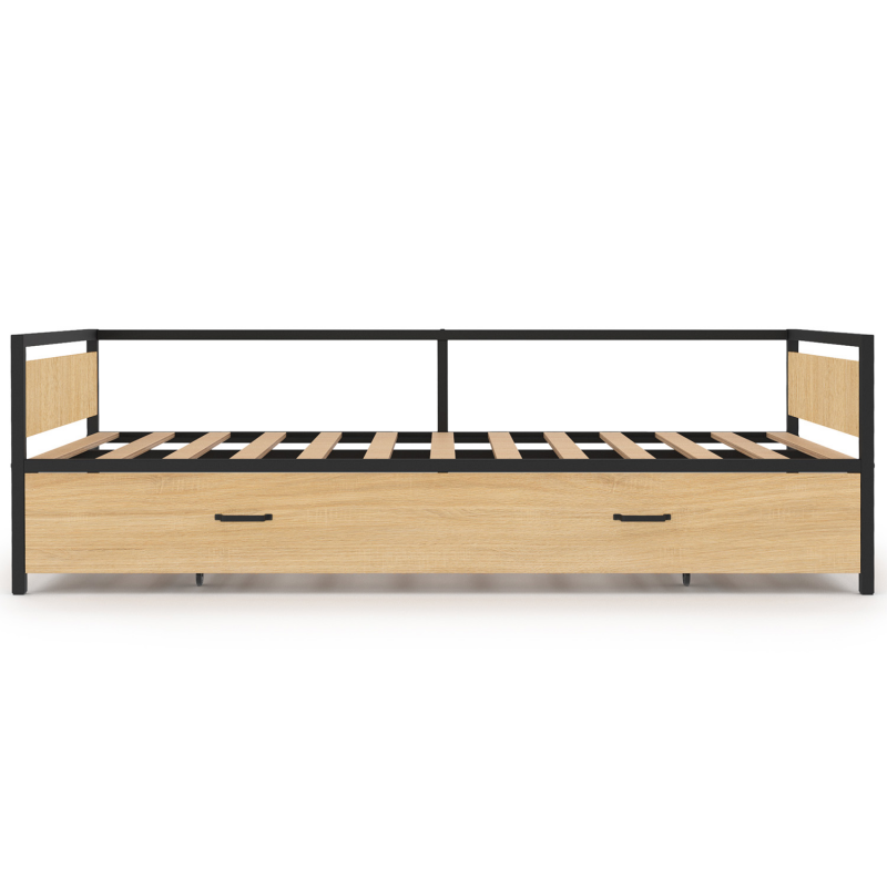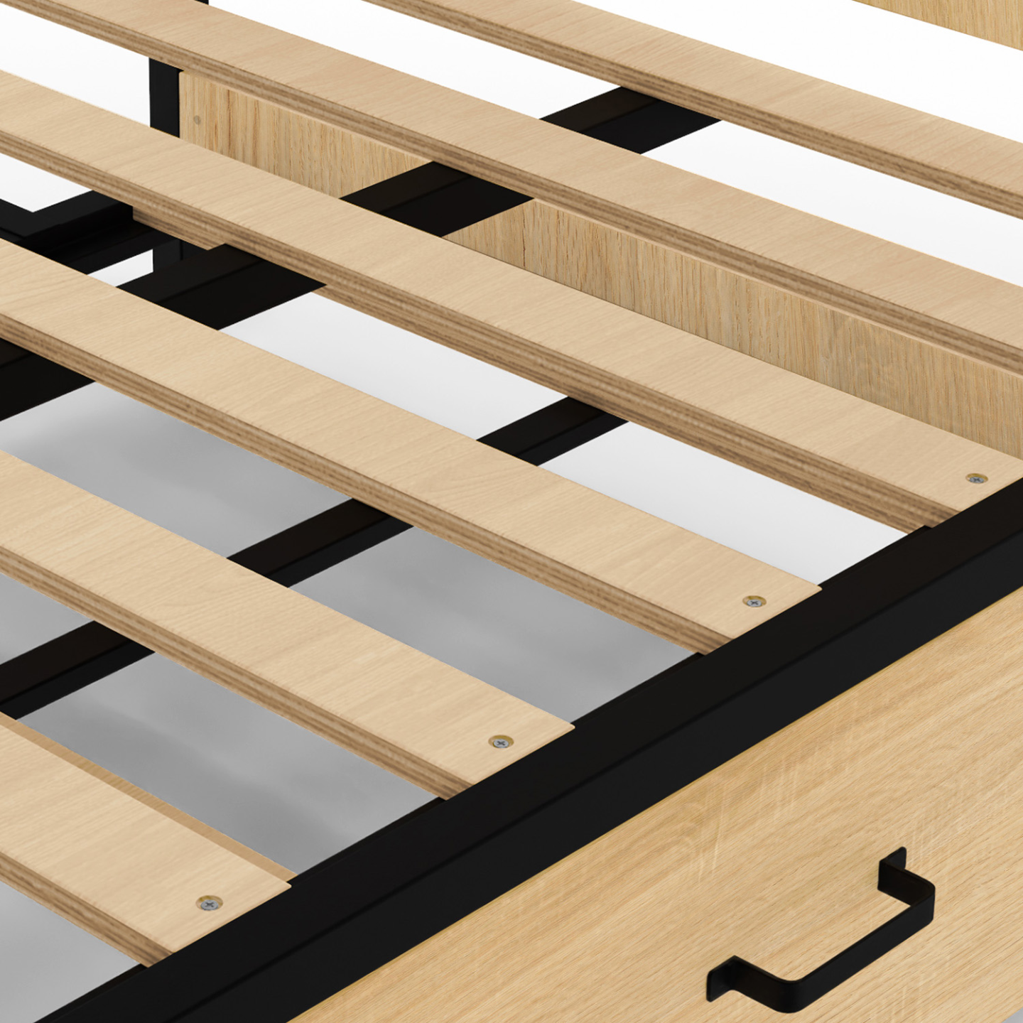 À la recherche d'une banquette convertible, à la fois esthétique et pratique ? Optez pour le lit gigogne DETROIT de 90 x 190 cm au coloris bois et noir. Ce lit gigogne au style industriel et aux lignes épurées ne manquera pas d'apporter du caractère à votre intérieur, tout en offrant un couchage supplémentaire, grâce à son option gigogne. Couchage 2 en 1, cette banquette convertible est idéale pour une chambre d'amis, un appartement étudiant ou même dans votre salon en guise de banquette, en la plaçant contre un mur avec quelques coussins.Grâce à cette banquette convertible, vous pouvez optimiser l'agencement de la pièce : un lit 2 places une fois déplié et un lit indépendant ou banquette lorsque vous le repliez. Une solution gain de place qui ne risque pas d'envahir les petits espaces ! Le sommier du couchage principal se compose de 13 lattes et le sommier du couchage secondaire, 11 lattes. Pour déplier votre couchage, c'est très simple, il vous suffit de tirer sur le sommier du second couchage grâce à son système de roulettes et de déplier ses pieds. Vous bénéficiez ainsi d'un véritable lit double à compléter d'un matelas. Alors n'hésitez plus et craquez pour le lit gigogne DETROIT, la solution idéale pour optimiser l'espace de votre pièce !Matelas non vendu avec la banquette convertible.La banquette peut accueillir un matelas jusqu'à 25 cm d'épaisseur. Dimensions du lit gigogne DETROIT 90 x 190 cmDimensions globales du lit plié : Longueur 201 cm x largeur 95.5 cm x Hauteur 61 cmDimensions intérieures du lit principal : L. 195 x l. 92.5 cmCouchage lit plié : 90 x 190 cmDimensions globales du lit déplié : L.201 cm x l.184 cm x H.61 cmCouchage lit déplié : 180 x 190 cmHauteur des pieds : 29.5 cmDimension poignée : 9.5 cmNombre de lattes : 13Distance entre chaque latte : 10 cmÉpaisseur des lattes : 1.5 cmÉpaisseur bois rebords : 1.5 cmHauteur sommier : 31 cmDimensions banquette : L. 192.5 x l. 88.5 cm - 4 roulettesNombre de latte banquette : 11Matériaux : Particules de bois 15 mm + métal 30 x 30 mmColoris : bois / noirVisserie incluseÀ monter soi-même : ouiRetrouvez également toute la collection de meubles industriels sur notre boutique en ligne !