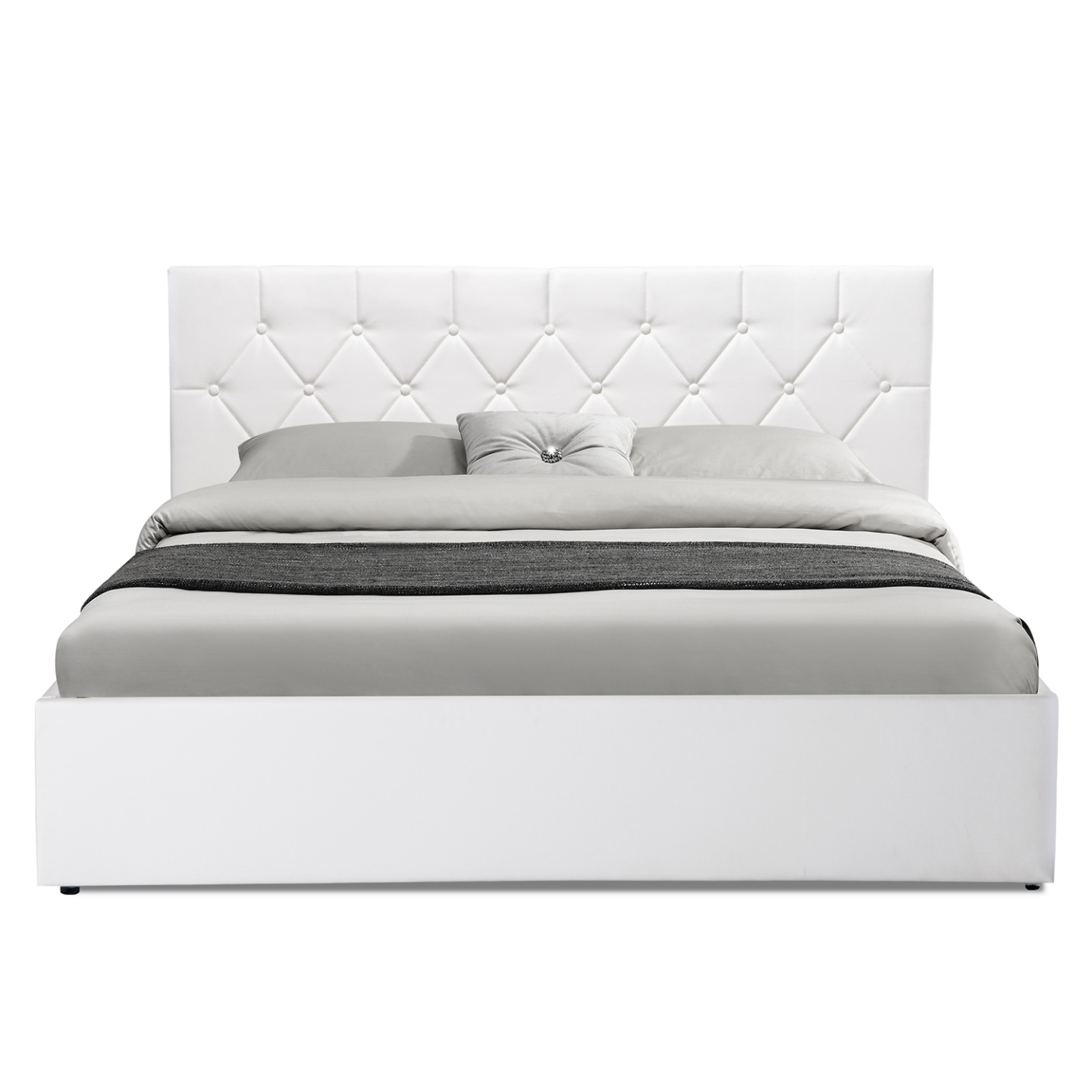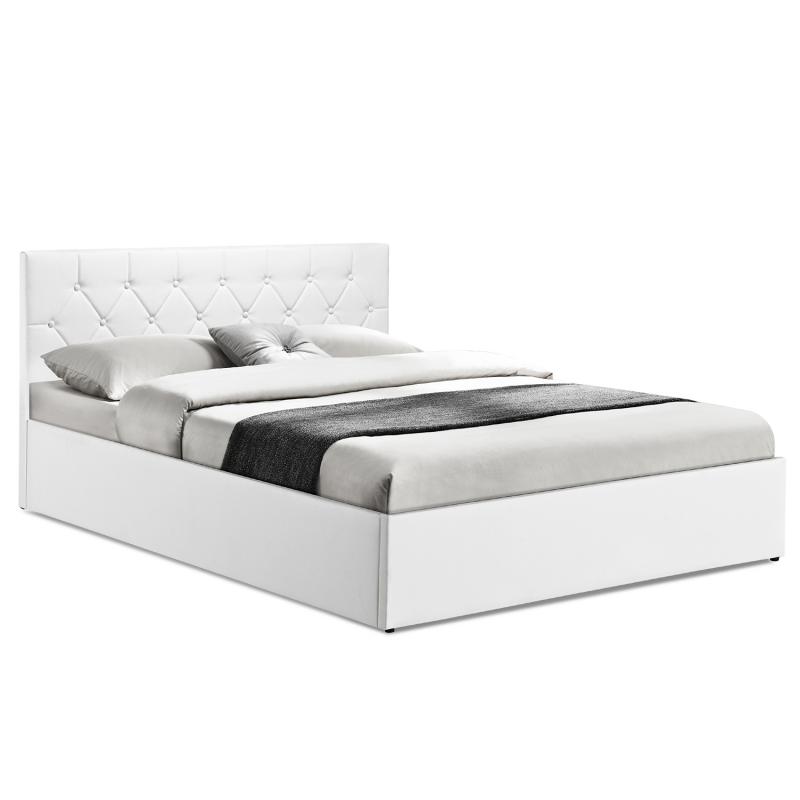 Optez pour ce lit coffre 2 en 1 en PU blanc avec sommier 160 x 200 CM et ravivez votre chambre avec une décoration chic et moderne. Pratique et fonctionnel, son coffre accueille couettes, traversins et oreillers. Les vérins de levage permettent d'y accéder en un instant! Un gain de place pour votre penderie !Pratique et fonctionnelle, la structure du lit abrite sous son sommier un grand coffre de rangement. Aussi, son revêtement résistant coloris blanc et ses finitions soignées apportera une touche contemporaine à votre chambre !Grâce à sa jolie tête de lit travaillée et capitonnée en forme de losange, votre mur sera habillé avec élégance tout en vous apportant le confort et le soutien nécessaires à la qualité de votre repos et de votre sommeil.Pour votre chambre à coucher ou la chambre d'amis, ce lit s'adaptera à sa fonctionnalité et vous permettra de recevoir famille ou invités avec simplicité dans une chambre ordonnée. Stable et robuste grâce aux pieds intégrés à la structure, à sa barre transversale sous le sommier et ses 2 pieds en métal centraux, ce lit a tout pour plaire ! Un gain de temps et d'espace ! Fini les oreillers empilés, laissez place à une chambre rangée en toute circonstance avec le lit AUSTIN à rangement intégré. Le coffre, de la dimension du lit, est facile à ouvrir et à fermer en un instant : le sommier est relevable en un tour de main grâce au mécanisme de vérins de levage.Sommier à 24 lattes en bois tout confort. Zone lombaire renforcée grâce au resserrement des lattes pour garantir un confort optimal - Facilite l'aération du matelas, et apporte flexibilité au couchage.Cet ensemble sommier coffre et tête de lit vous offre un couchage confortable et esthétique pour une chambre contemporaine qui s'adaptera à tous les intérieurs.Dimensions du lit coffre AUSTIN blanc 160 x 200 CM- Dimensions hors tout : Longueur 210 CM x largeur 170,5 CM x Hauteur 88,5 CM environ- Dimensions tête de lit : Longueur 151 x Hauteur 89 x Épaisseur 7 CM- Hauteur du cadre de lit : 31,5 CM - Épaisseur 3,5 CM- 6 pieds : 4 en bois et 2 en métal- Hauteur des pieds : 1,5 CM- Dimensions standard pour un matelas 160 x 200 CM 2 places- Nettoyage facile avec chiffon humide- Matelas non fourni*Produit non livrable en CorseCe modèle de lit AUSTIN est disponible dans d'autres coloris et d'autres dimensions :- Lit coffre AUSTIN PVC gris avec sommier 140 x 190 CM- Lit coffre AUSTIN PVC gris avec sommier 160 x 200 CM- Lit coffre AUSTIN PVC blanc avec sommier 140 x 190 CM- Lit coffre AUSTIN PVC noir avec sommier 140 x 190 CMRetrouvez l'ensemble de notre gamme de lits sur notre boutique en ligne !