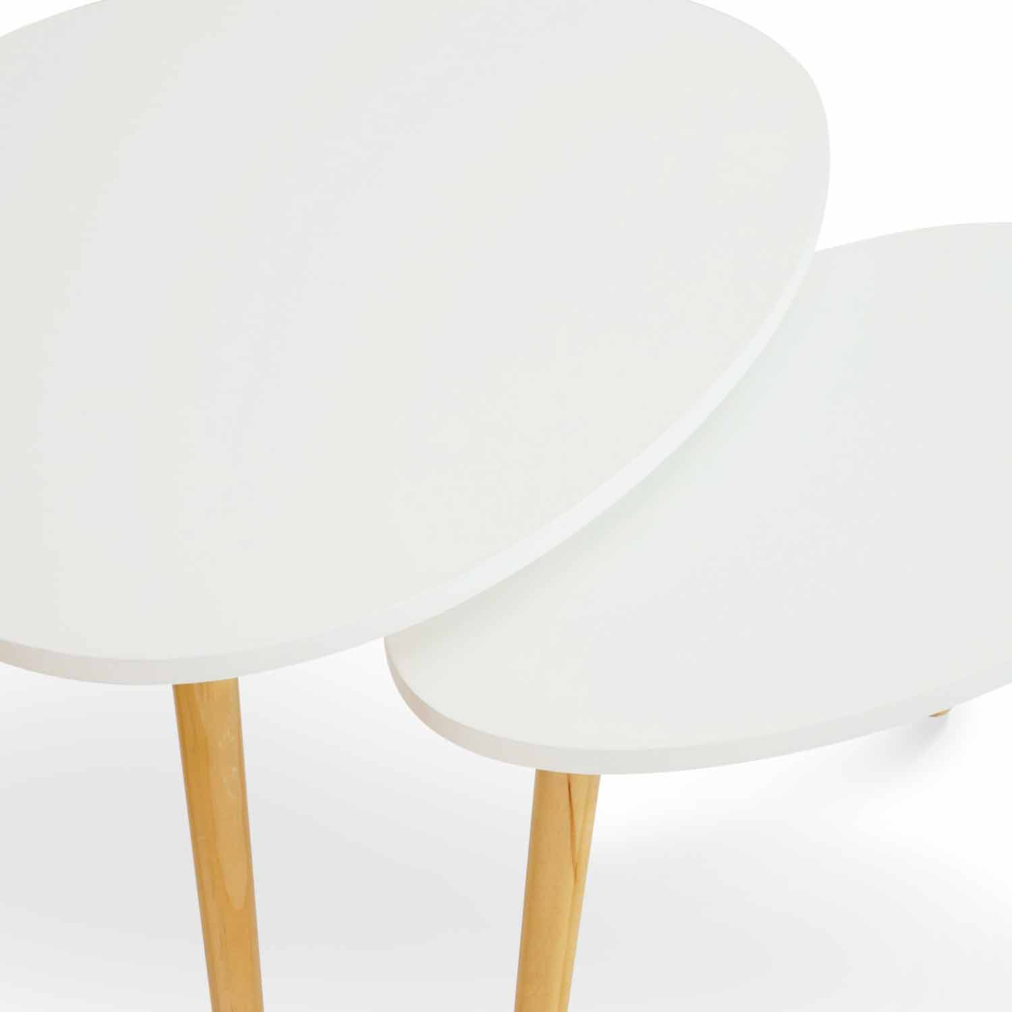 Apportez une vraie touche contemporaine à votre séjour grâce à ce lot de 2 tables basses gigognes aux finitions laquées blanches qui s'accorderont parfaitement à votre intérieur. Leur design, d'inspiration nordique, est à la fois ultra-tendance, simple et sophistiqué.À la fois pratiques et jolies, libre à vous d'agencer ces tables basses gigognes de la manière dont vous le souhaitez pour créer l'intérieur qui vous ressemble. Elément déco ou tables de rangement pour vos magazines, télécommandes ou petites plantes d'intérieur, chacune aura son utilité ! Idéales pour vos soirées télé ou apéritifs entre amis, vous pourrez également les placer facilement les unes sous les autres pour un rangement optimal permettant de gagner de l'espace !Véritables éléments de décoration, les tables basses gigognes apporteront un certain cachet à votre intérieur. Grâce à leur forme ovale et à leurs pieds en bois solides, ces tables de salon originales donneront un côté chaleureux à votre pièce de vie.La surface laquée brillante des tables offre quant à elle une touche contemporaine à votre intérieur et une finition raffinée. Enfin, le coloris blanc associé au bois clair des pieds créera à la fois de la luminosité et du contraste, pour un design épuré, chic et moderne.Que votre espace salon soit relativement petit ou très spacieux, ces deux tables basses GAIA y trouveront forcément leur place. À utiliser seules ou bien par 2, créez une atmosphère cocooning à petit prix grâce à ce lot au style scandinave !Dimensions des 2 tables basses gigognes GAIADimensions de la grande table basse : Longueur 80 cm x largeur 60 cm x Hauteur 40 cmDimensions de la petite table basse: L. 60 x l. 38 x H. 35 cmMatériaux : MDF et pieds en boisColoris : Blanc aux finitions laquéesÀ monter soi-mêmeModèle également disponible en gris et jaune ainsi qu'en gris et blanc.Retrouvez l'ensemble de notre collection scandinave sur notre boutique en ligne.