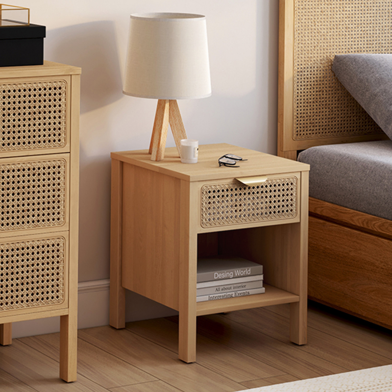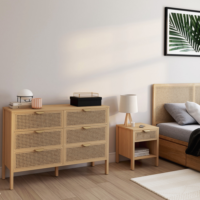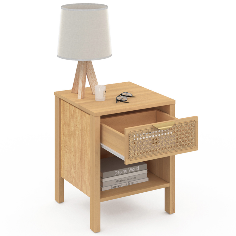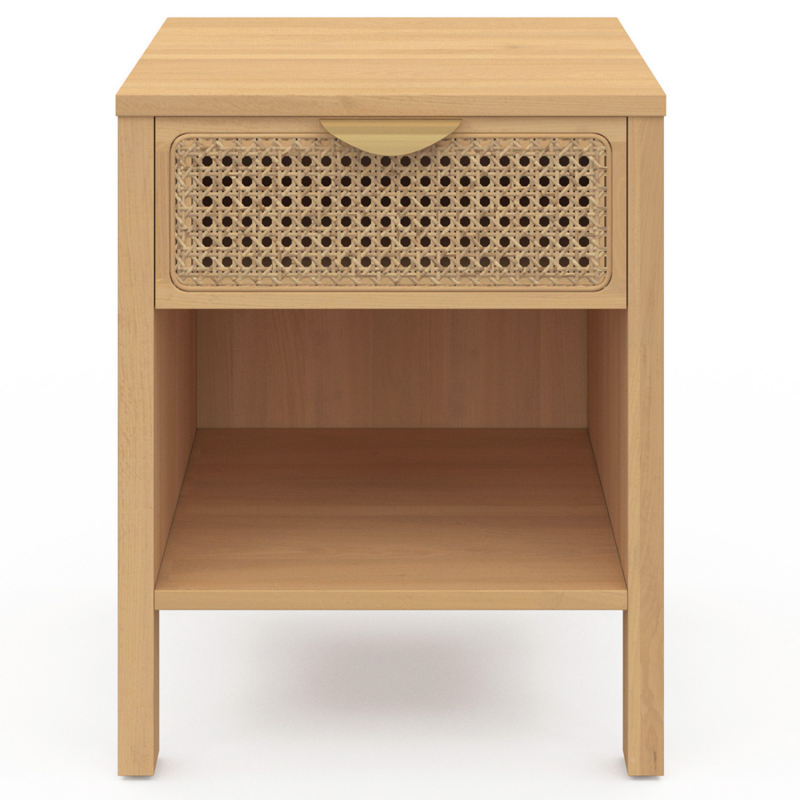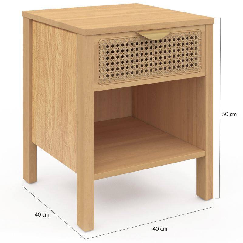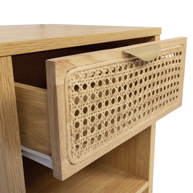 Craquez pour ces 2 tables de chevet EDHEN et apportez une touche naturelle et exotique à votre chambre.Le design du lot de 2 chevets esprit naturel en véritable cannage est épuré, ils se fondront tout naturellement dans le décor de votre pièce ! Le mélange de la couleur du bois associé au cannage apportera chaleur et modernité à votre intérieur. Créez facilement une ambiance naturelle et vintage en ajoutant un chevet EDHEN de chaque côté de votre lit ! Pratique et très fonctionnel, votre chevet vous permet de ranger vos livres dans sa niche du bas, d'organiser certaines de vos affaires dans votre tiroir, tout en posant une lampe de chevet sur le dessus de la tablette. Avec ses généreuses dimensions, vous pouvez cacher certains objets dans le tiroir de 30 x 30 x 12 cm, tout en exposant vos magazines ou vos livres sur la tablette basse de 35 x 38 x 20,5 cm !En plus du design naturel et de son utilité, la stabilité de votre chevet est assurée grâce à ses quatre pieds de 12.5 cm de hauteur. N'hésitez plus et apportez la touche de finition idéale à votre chambre à coucher ! Dimensions du lot de 2 chevets EDHENDimensions globales hors tout : Longueur 40 cm x largeur 40 cm x Hauteur 50 cmDimensions du tiroir : L.30 x l.30 x H.12 cmDimensions de l'étagère inférieure : L.35 x l.38 x H.20,5 cmLongueur de la poignée : L.13.3 Dimensions des pieds : L.2.5 x l.4 x H.12.5 cmMatériaux : Panneaux de particules, cannage naturel, poignées en métalColoris : bois, naturel, doréÀ monter soi-mêmeRetrouvez dans la même gamme, notre tête de lit en 140 cm ou en 160 cm et notre commode 6 tiroirs pour équiper votre chambre.Découvrez aussi toutes nos tables de chevet sur notre boutique en ligne !