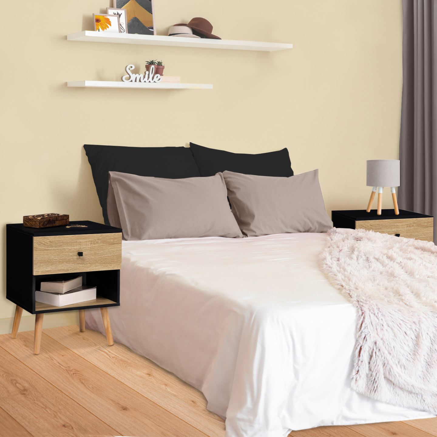 Vous avez envie de remplacer vos tables de chevet ? Optez pour ce lot de 2 tables de chevet EMMIE et apportez un peu d'esprit nordique à votre chambre à coucher en un clin d'œil ! Ingénieuses et fonctionnelles, les tables de nuit sont chacune composée d'un tiroir de L.40 x l.34 x H.14 CM qui vous permet de ranger à l'abri des regards votre pilulier, télécommande ou nécessaire de nuit, tout en les gardant à portée de main. Le large plateau supérieur, quant à lui, peut vous servir pour y poser une lampe de chevet ou votre tasse de thé. Servez-vous de la niche inférieure comme support de décoration ! En effet, ses 14,5 CM de hauteur vous permettent d'entreposer livres de chevet ou un objets de décoration.Outre cet aspect pratique, le design du chevet venu tout droit de Scandinavie offrira une touche élégante et chaleureuse à votre chambre grâce à son coloris noir et façon hêtre.Les lignes épurées des chevets apporteront l'esprit cocooning tant recherché et ses finitions soignées s'accorderont parfaitement avec votre décoration intérieure. Gardez une chambre organisée en toute circonstance et laissez-vous séduire par ces 2 tables de chevet scandinaves bois et noir ! Dimensions du lot de 2 tables de chevet EMMIE bois et noirDimensions hors tout : Longueur 40 cm x largeur 34 cm x Hauteur 50 cmDimensions du tiroir : L.40 x l.34 x H.14 cmDimensions de la niche : L.37 x l.34 x H.14,5 cmMatériaux : particules de bois (PB), épaisseur 15 mmPieds en boisColoris : noir et bois façon hêtreÀ monter soi-mêmeRetrouvez l'ensemble de notre collection EMMIE ainsi que nos tables de chevet sur notre boutique en ligne !