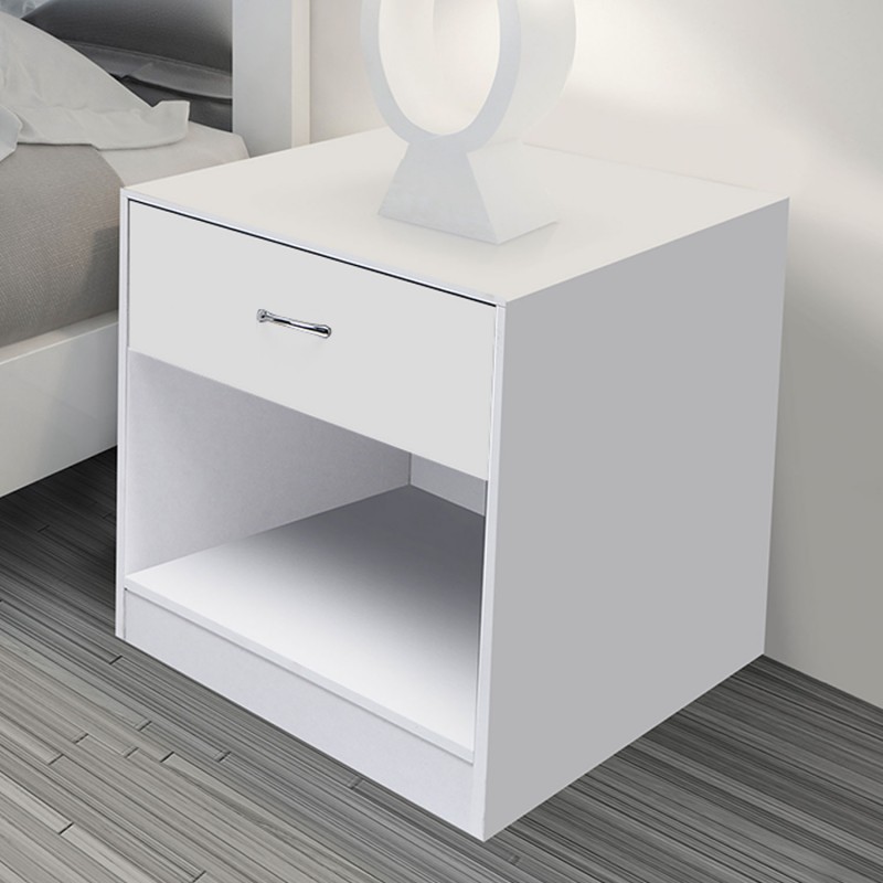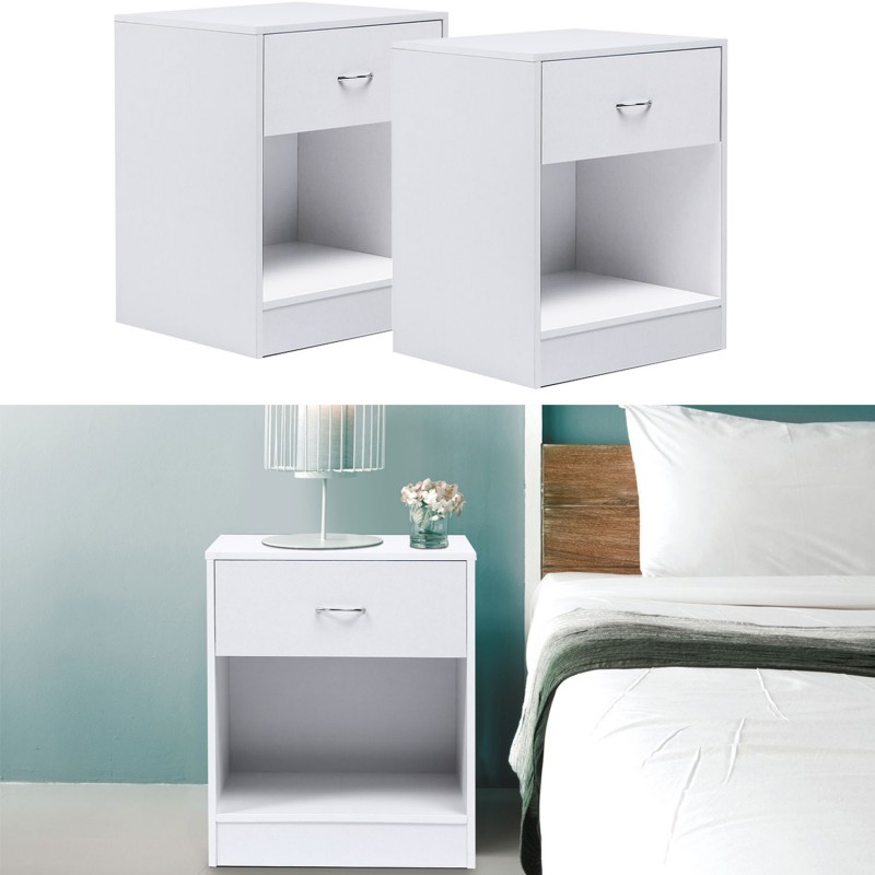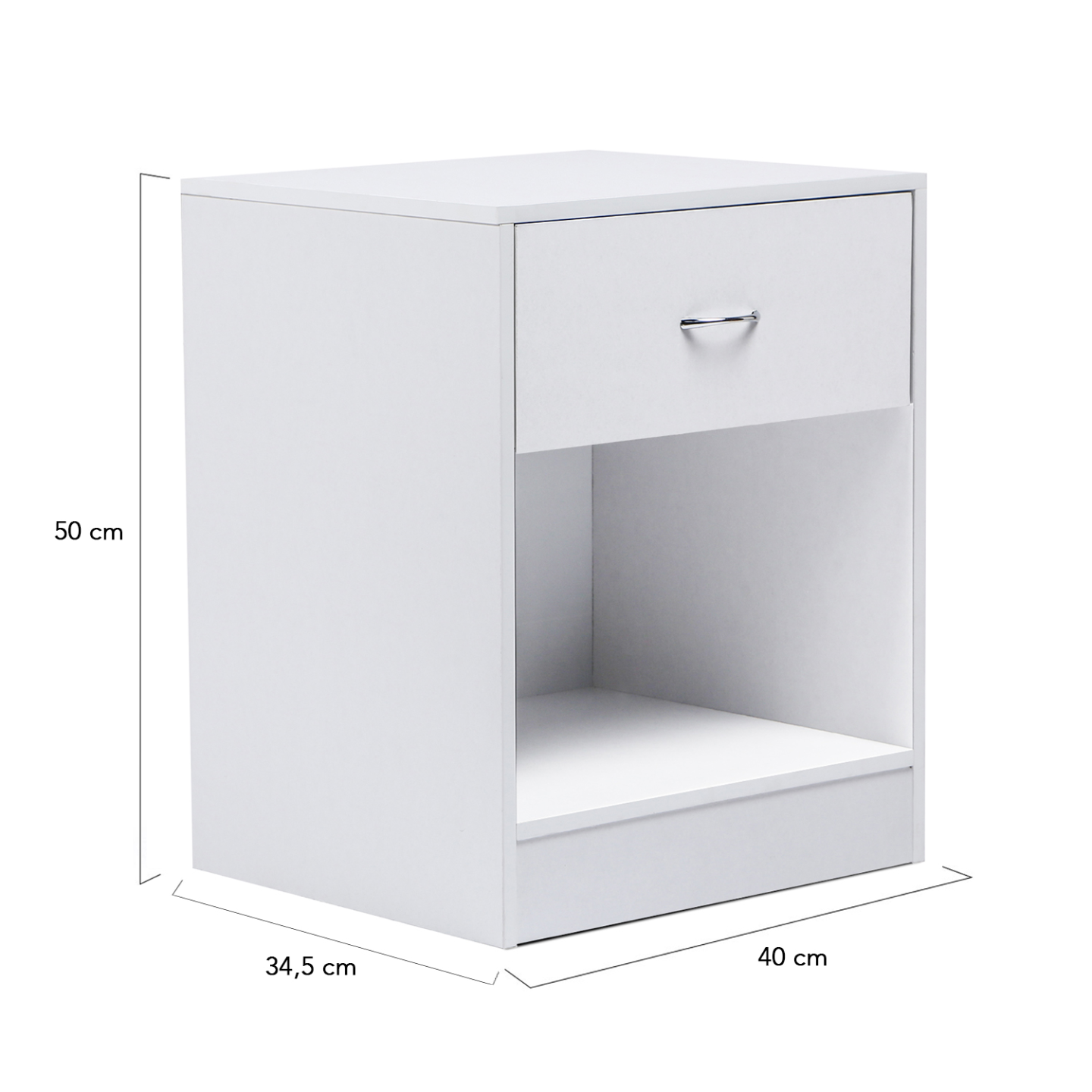 Jouez l'élégance et la modernité avec cet ensemble de 2 tables de chevet OLGA en bois aux finitions soignées.Leur design épuré tout en sobriété leur apporte une vraie touche contemporaine pour meubler avec goût votre chambre à coucher.Pratique avec leur tiroir grande contenance, elles vous permettent de ranger tous vos produits.Venez l'agrémenter d'une jolie lampe, elle mettra en valeur tous vos objets déco. Son compartiment vous permet de ranger tous vos livres du moment !Dimensions du lot de 2 tables de chevet OLGA bois blanc- Dimensions totales hors tout : Longueur 40 CM x largeur 34,5 CM x Hauteur 50 CM- Matériaux : Panneaux de particules de bois 12 MM + MDF 3 MM- Coloris : blanc- Poignée façon chromé - finition mat - À monter soi-mêmeNos tables de chevet OLGA sont également disponibles dans d'autres coloris : - Lot de 2 tables de chevet OLGA bois blanc et tiroir gris- Lot de 2 tables de chevet OLGA bois façon hêtre et tiroir blanc- Lot de 2 tables de chevet OLGA bois noir et tiroir façon hêtreDécouvrez tous nos modèles de tables de chevet ainsi que notre collection contemporaine.