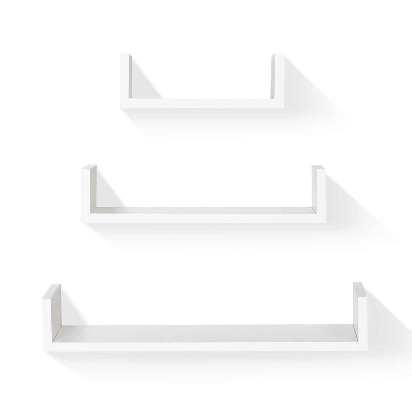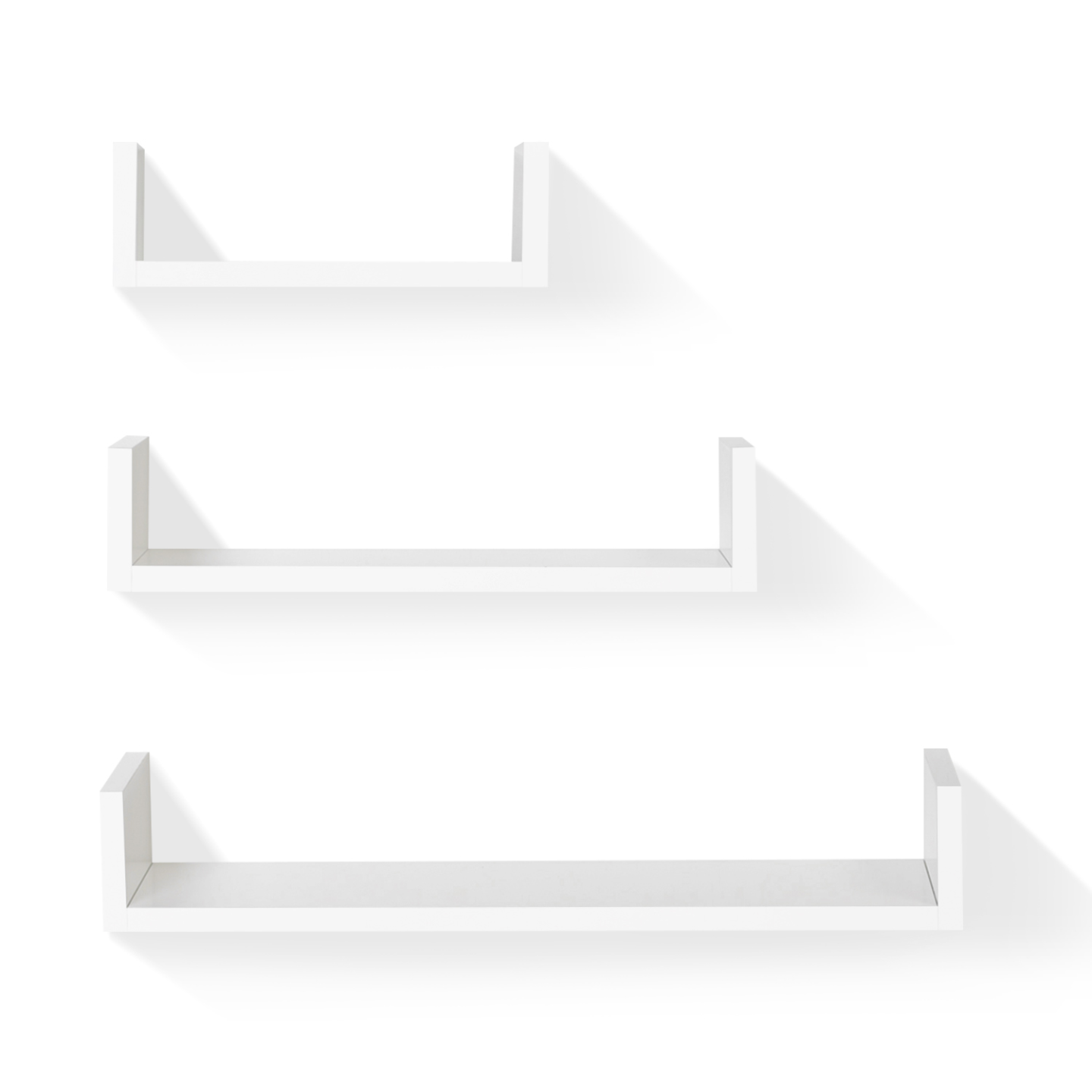 On ne compte jamais assez de rangements dans son intérieur !Pratiques, fonctionnelles, et modulables, les 3 étagères murales suspendues vendues en lot de 3 apporteront une touche design et moderne à votre intérieur, qu'il soit contemporain ou plus classique. Simples, flottantes, grâce à leurs lignes droites et épurées, les tablettes ne surchargeront pas votre lieu de vie et donneront du volume à votre pièce. Avec leur joli coloris blanc brillant lumineux et neutre, et leur finition laquée soignée vos objets de décoration préférés seront mis en valeur. Indépendantes, les étagères peuvent être utilisées dans la même pièce, en continuité ou séparément. Installez-les par 1, par 2 ou par 3 selon vos envies !Leur utilisation est multiple et infinie ! Dans la salle de bain, pour avoir vos produits de beauté et votre parfum à portée de main, les toilettes, la cuisine, le couloir, dans votre chambre à coucher pour y disposer votre réveil et votre livre de chevet, dans la chambre de votre enfant, pour y exposer sa collection de figurines et ses histoires du soir hors d'atteinte, ou dans le salon pour accueillir petites plantes vertes, cadres, bougies, et petits objets de déco fragiles hors de la portée de vos animaux. Avec leur forme en U originale et astucieuse, vos livres, CD, DVD et blue-ray seront maintenus sur les côtés. Installez-les de façon sobre ou combinez-les en forme d'escalier une face vers le bas et une face vers le haut pour un effet design garanti. Multipliez la surface de rangement et donnez de la perspective à la pièce !Faciles d'installation, avec les attaches métalliques fournies, le support est invisible à l'oeil nu !Pratique et déco, ce lot de 3 étagères de rangement à petit prix servira à toute la famille !Kit de fixation inclus Dimensions de la grande étagère : Longueur 60 x largeur 15 x Hauteur 10 cm Dimensions de l'étagère moyenne : Longueur 45 x largeur 15 x Hauteur 10 cm Dimensions de la petite étagère : Longueur 30 x largeur 15 x Hauteur 10 cm