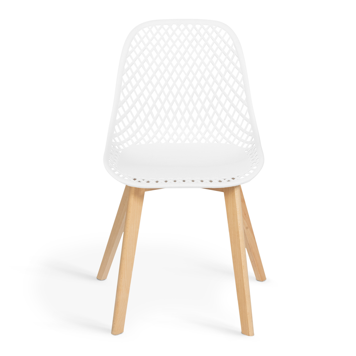 Vous êtes à la recherche de chaises design avec une assise qui soit aussi belle que confortable ? Choisissez notre modèle MANDY ! Le dossier ajouré des chaises apportera au modèle un style graphique très en vogue en ce moment. Que vous choisissiez de les installer dans votre salle à manger, votre cuisine ou encore votre bureau, ces chaises scandinaves blanches trouveront leur place à coup sûr dans n'importe laquelle des pièces de votre maison.En plus d'apporter une touche de modernité à votre pièce, elles offrent un confort des plus agréables. Le dossier de ces chaises en polypropylène apportera flexibilité et solidité au modèle. Très stables, elles disposent de 4 pieds en bois aux finitions travaillées.De couleur blanche, elles s'accorderont à tous les styles d'intérieur, et s'adapteront à votre mobilier. De plus, leur pieds en bois apporteront du cachet à l'ensemble de la chaise.Profitez d'un design tendance et d'un petit prix avec ce joli lot de 4 chaises.Dimensions du lot de 4 chaises MANDY blanchesDimensions globales : Longueur 46 cm x largeur 56 cm x Hauteur 86 cmDimensions assise : L. 46 x l. 46 x H. 46 cmAssise en polypropylènePieds en boisColoris : blancVendues en lot de 4 À monter soi-mêmeDécouvrez tous nos autres modèles de chaises scandinaves sur notre boutique en ligne !