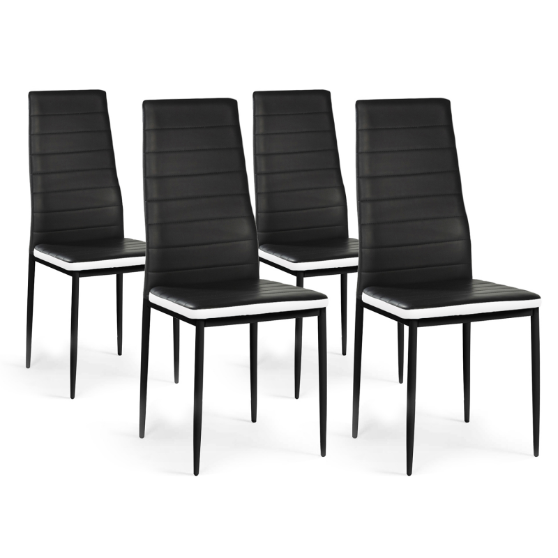 Elégantes et épurées, ces 4 chaises ROMANE confortables apporteront une touche de modernité dans votre salle à manger.Idéal pour votre salon ou votre cuisine, ce lot de 4 chaises noires avec leur assise matelassée entourée d'un bandeau blanc au design contemporain se mariera parfaitement dans votre intérieur.Elles garantissent une assise confortable grâce à leur rembourrage et leur haut dossier. Passez d'agréables moments à table avec votre famille et vos amis.Si vous êtes à la recherche de chaises design pas chères noires bandeau blanc, nous vous proposons un lot à un prix imbattable. Aménagez votre séjour avec ces chaises tendance et design.Vous pouvez également découvrir les chaises ROMANE entièrement noires X6 si vous êtes un amateur de cette couleur.Revêtement en PVC pour un nettoyage facile et pieds étal peint noir.Dimensions des chaises ROMANE noiresDimensions globales : Longueur 42 cm x largeur 48 cm x Hauteur 97 cmRevêtement assise PVCPieds métal peints en noirVendues en lot de 4 chaises À monter soi-même
