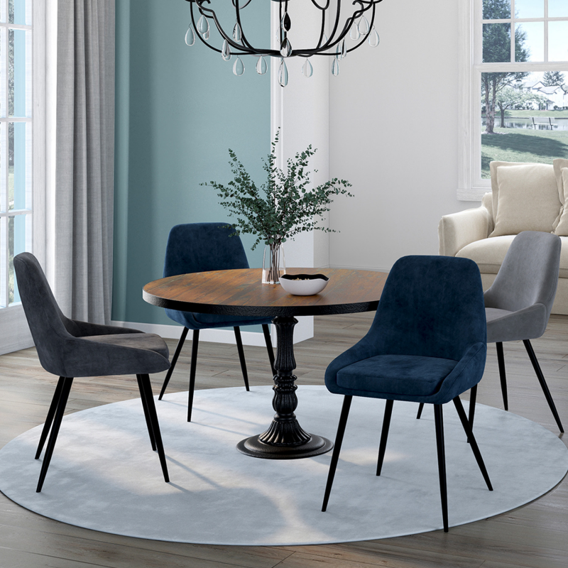 À la recherche de nouvelles chaises pour moderniser votre pièce de vie ? Craquez pour ce lot de 4 chaises en velours mix color THALYA avec demi-accoudoirs ! Leur design vintage et élégant s'adaptera à tous les styles de décoration. Idéales pour apporter une touche sophistiquée à votre intérieur, les chaises THALYA sont dotées d'un design original et tendance qui s'associe à merveille avec ce mélange de coloris intemporel et chaleureux. Profitez de 3 couleurs : bleu, gris foncé et gris clair et mixez-les avec la décoration de votre pièce ! Les nuances grises intemporelles s'accorderont harmonieusement avec le bleu pour une touche peps !Partagez de bons repas en famille ou entre amis confortablement installés grâce à leur coussin en velours qui leur offre un aspect cossu et moelleux. Les demi-accoudoirs de la chaise apportent un look contemporain raffiné à votre salle à manger et proposent une assise enveloppante très agréable. Pratiques et fonctionnelles, les chaises peuvent aussi être dissociées dans d'autres pièces de la maison : donnez du style à votre chambre en disposant une chaise devant votre coiffeuse ou utilisez-la en tant que chaise de bureau pour un coin travail chic et cocooning !Leurs pieds fins en métal noir mettent en valeur les lignes épurées de ces chaises et leur assurent stabilité et robustesse.Sublimez votre coin repas en un tour de main grâce à ce lot de 4 chaises avec accoudoirs THALYA en velours mix color gris et bleu !Dimensions des chaises THALYA en velours mix colorDimensions globales : Longueur 47,5 cm x largeur 54 cm x Hauteur 79 cmDimensions de l'assise : L. 47,5 x l. 39 x H. 49 cmHauteur du dossier : 35,5 cmÉpaisseur du coussin : 5 cmMatériaux : assise en velours et pieds en métalColoris : gris foncé, gris clair et bleu x2Vendues en lot de 4 chaisesÀ monter soi-mêmeCe modèle est également disponible dans d'autres coloris :- Lot de 4 chaises THALYA en velours gris foncé- Lot de 4 chaises THALYA en velours gris clair- Lot de 4 chaises THALYA en velours bleu- Lot de 4 chaises THALYA en velours beige- Lot de 4 chaises THALYA en velours mix color bleu, gris et jauneRetrouvez l'ensemble de nos chaises en velours et de notre collection de meubles vintage sur notre boutique en ligne !