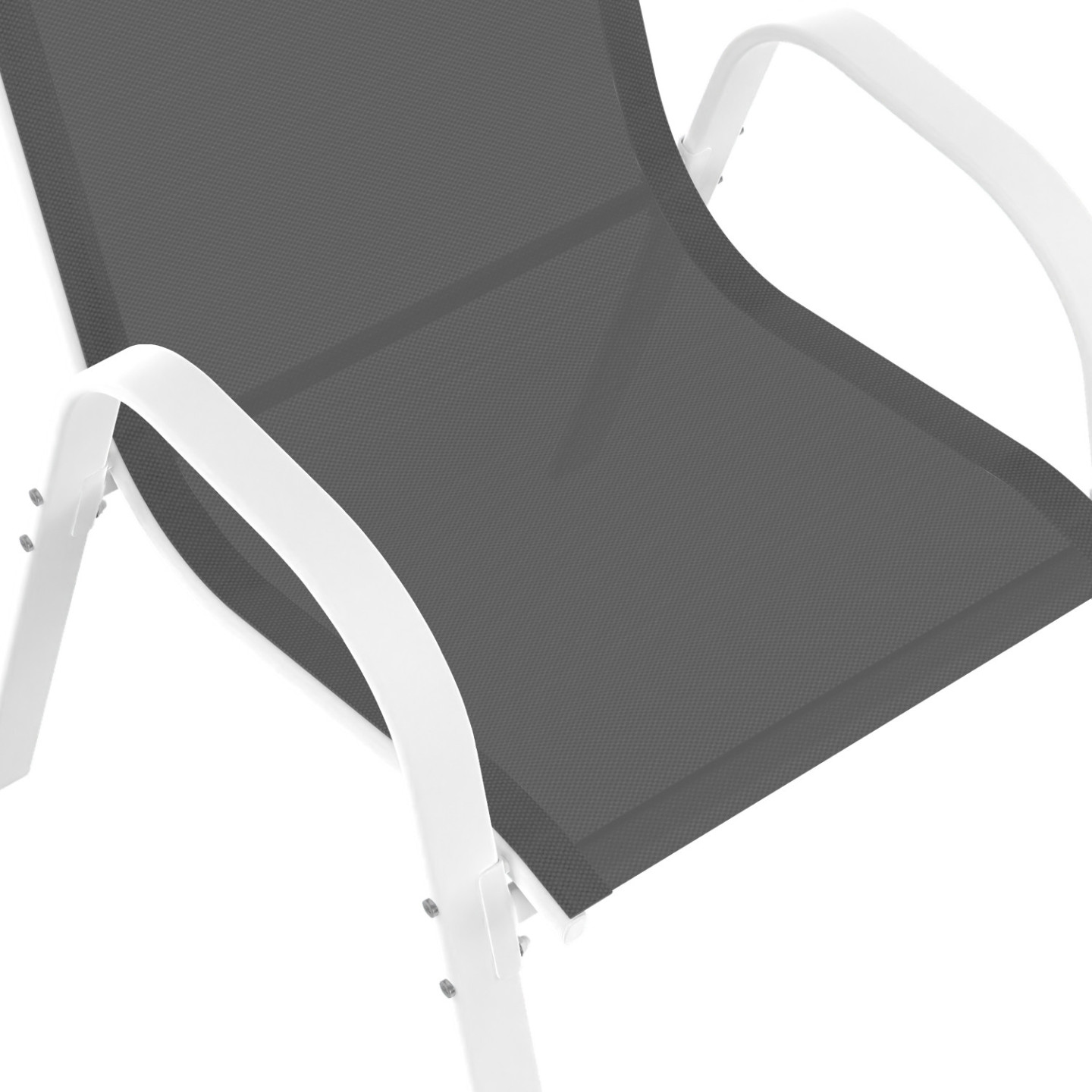 Avec ce lot de 6 chaises de jardin LYMA en métal blanc et textilène gris anthracite, installez-vous dans votre jardin ou sur votre terrasse pour profiter du soleil et faire le plein de vitamine D ! Vous pourrez meubler votre jardin facilement et passer du temps à lire un livre, manger un bon repas ou tout simplement prendre un apéritif entre amis. Très confortable, ce lot de 6 chaises est doté d'une assise en textilène, souple et agréable et d'une structure en acier qui lui confère une grande stabilité et robustesse. De plus, les chaises LYMA disposent d'accoudoirs qui vous permettront de passer un agréable moment en extérieur, comme si vous étiez dans un fauteuil ! Avec son style élégant et moderne, le coloris blanc de la structure associé au textilène gris anthracite de l'assise s'accordera parfaitement avec la plupart de vos meubles de jardin. Idéalement pensées pour s'installer autour d'une table, ces chaises peuvent également se coupler avec tout autre modèle de salon de jardin. Multifonctions, vous pourrez utiliser les chaises de jardin aussi bien en intérieur qu'en extérieur, lorsque vous avez besoin d'assises supplémentaires pendant de grandes réceptions à domicile. De plus, les matériaux utilisés sont la grande force de ce lot de chaises, car ils ne nécessitent presque aucun entretien !Pratiques, ces 6 chaises s'empilent très facilement pour vous permettre de les ranger facilement pour la saison hivernale ou lorsque vous ne les utilisez pas. Et si vous souhaitez les protéger, optez pour une housse pour chaises de jardin.Dimensions du lot de 6 chaises de jardin empilables blanc et grisDimensions d'une chaise : Longueur 51,5 cm x largeur 68 cm x Hauteur 84 cmPoids d'une chaise : 3,8 kgDimensions des accoudoirs : l. 4,2 x ép. 1,3 x H. 58,5 cmDimensions de l'assise : L. 42 x l. 45 x H. 41,5 cmDimensions du dossier : L. 42 x H. 47 cmMatériau de la structure : acierMatériau de l'assise : textilèneColoris : Structure blanche et textilène gris anthraciteÀ monter soi-mêmeRetrouvez les autres lots et coloris de chaises LYMA disponibles sur notre boutique en ligne : - Lot de 4 chaises de jardin LYMA métal et textilène empilables noires- Lot de 4 chaises de jardin LYMA métal et textilène empilables gris anthracite- Lot de 4 chaises de jardin LYMA métal et textilène empilables blanc et gris- Lot de 6 chaises de jardin LYMA métal et textilène empilables noires- Lot de 6 chaises de jardin LYMA métal et textilène empilables gris, noir et bleuDécouvrez aussi nos autres références de salon de jardin sur notre boutique en ligne !