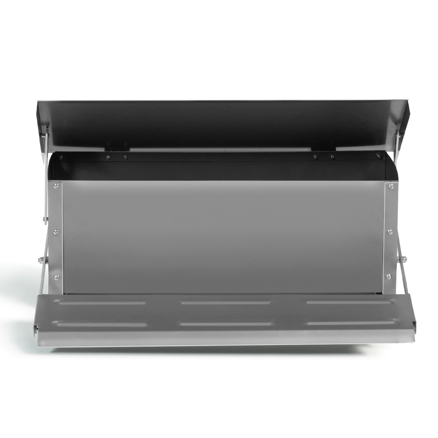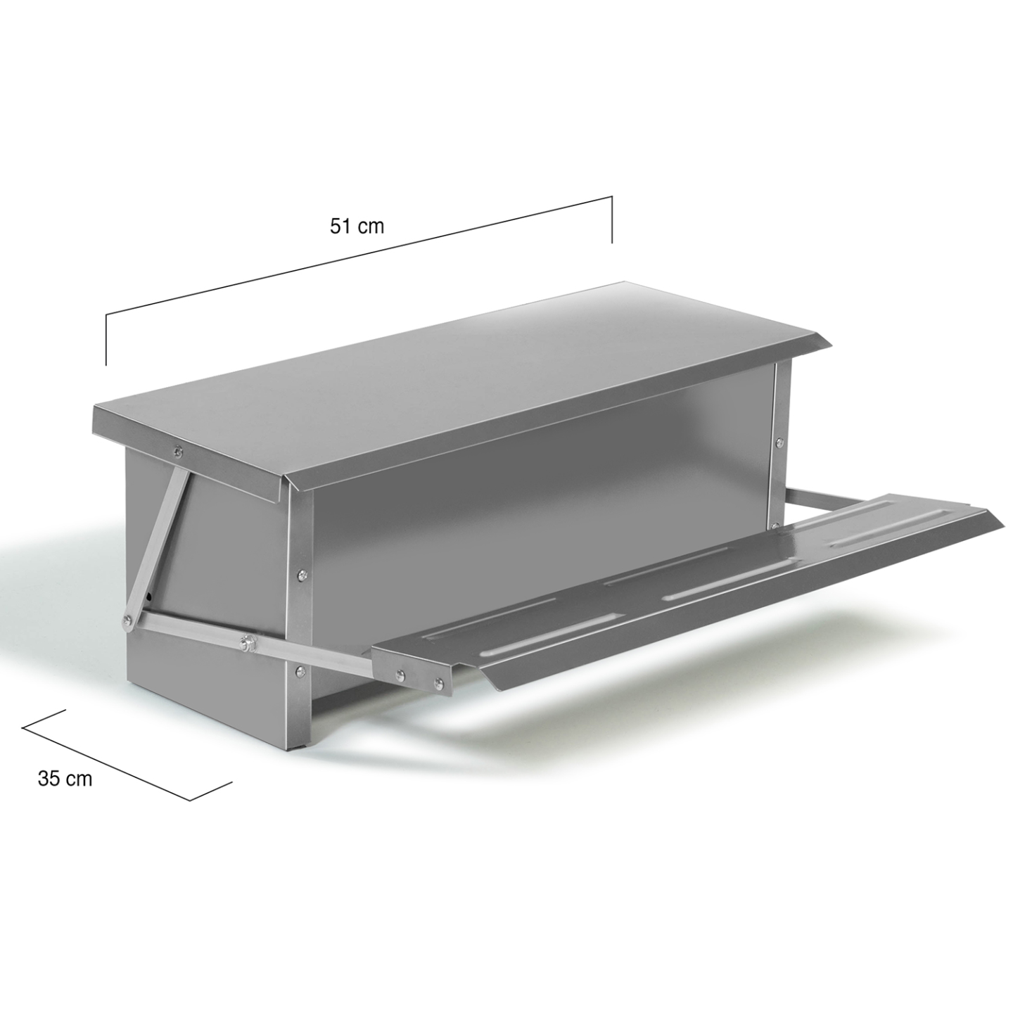 Nourrissez vos poules en toute tranquillité pendant vos absences avec ce distributeur automatique XXL pouvant contenir jusqu'à 10 kg de nourriture.Les poules étant de grandes consommatrices de graines et légumineux, vous n'aurez plus à vous soucier de savoir si elles ont assez de quantité grâce à ce réservoir pour grains XXL. Élément incontournable pour un élevage réussi, la mangeoire est équipée d'un couvercle qui s'ouvre lorsque la poule se positionne sur la plateforme prévue à cet effet. Un poids minimum de 500 gr est nécessaire pour actionner le levier. Une telle conception évite aux oiseaux, rats ou autres nuisibles de voler la nourriture de votre élevage. Ce fonctionnement intelligent joue sur le comportement alimentaire naturel de vos poules en leur permettant d'accéder à leur nourriture, uniquement lorsqu'elles ont faim.Avec sa capacité de réserve XXL, la mangeoire offre de belles dimensions. Profitez d'un bac pouvant accueillir jusqu'à 10 kg de nourriture et mesurant 51 cm de longueur x 21 cm de largeur x 15,5 cm de hauteur. Vous pourrez nourrir plusieurs poules et cela pendant quelques jours selon la taille de votre élevage. Pratique et résistante, ce distributeur automatique innovant permet de conserver de manière optimale la nourriture de vos poules et évite le gaspillage grâce à ses parois fermées. Dimensions de la mangeoire XXL pour poules et volailles- Dimensions totales : Longueur 51 CM x largeur 38 CM x Hauteur 19 CM- Dimensions couvercle : L. 51 x l. 21 CM- Profondeur du bac : 15,5 CM- Dimensions de la plateforme à levier : L. 51 x l. 13 CM- Hauteur du levier : 8 CM- Poids nécessaire sur la plateforme pour ouvrir le couvercle : 500 GR- Capacité de réserve totale : 10 KG- Matériaux : acier galvanisé- Coloris : naturel- À monter soi-mêmeDifférents formats et coloris de mangeoires pour poules sont également disponibles : - Mangeoire XL pour poules distributeur automatique à pédale en acier 5 KG- Lot mangeoire 3 KG et abreuvoir 3L pour poules et volaillesDécouvrez tous nos accessoires pour poulailler disponibles sur notre boutique en ligne !