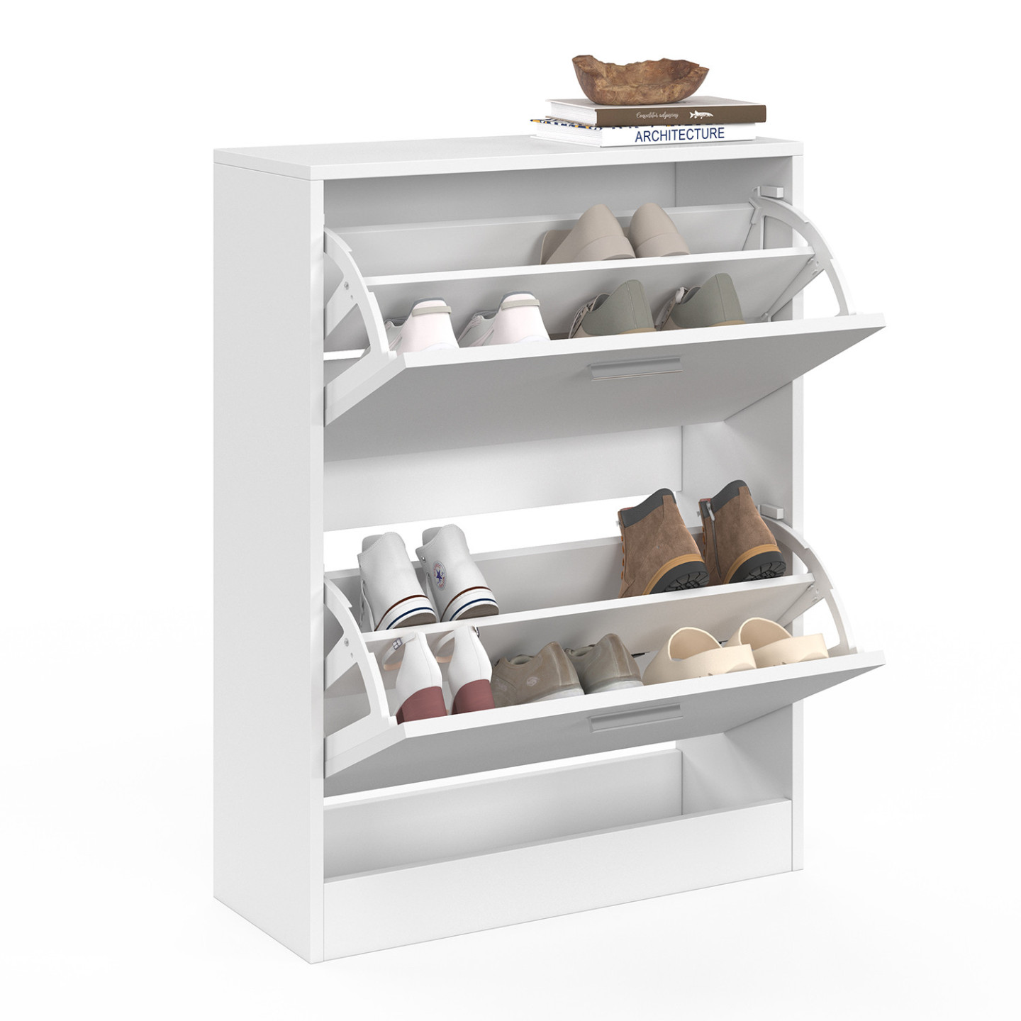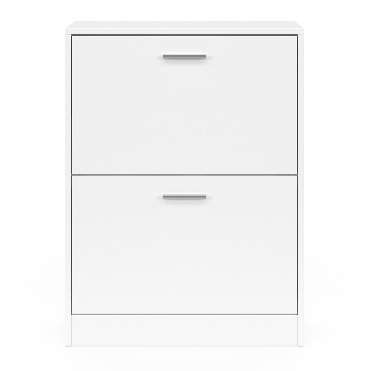 Gagnez de l'espace et du temps dans votre maison, dans votre entrée grâce à notre meuble à chaussures 2 portes blanc. Ce meuble à chaussures s'adaptera parfaitement à votre intérieur grâce à son design fonctionnel, chic et tendance !Ce meuble d'appoint est composé de 2 portes, 2 espaces de rangement. Il optimise et habille tout type de couloir, d'entrée de façon moderne et fonctionnelle ! La structure de ce meuble en panneaux de particules de bois vous garantit solidité et robustesse.Ouvrez chaque espace de rangement à l'aide de la poignée.Ce meuble vous offre une grande capacité de rangement car il peut contenir jusqu'à 12 paires de chaussures (6 paires par espace de rangement).Chaque espace de rangement possède une planche séparant les paires de chaussures modulables. 4 patins sont offerts pour ce meuble.Facile à monter.Pour éviter tout risque de basculement, il est recommandé de le fixer au mur.Dimensions du meuble à chaussures 2 portes blancDimensions globales : Longueur 60 cm x largeur 24 cm x Hauteur 80 cmDimensions portes : L. 59,5 x l. 24,5 cmMatériaux : Panneaux de particules (PB)Coloris : blancNombre de paires par tiroir : environ 6 (12 au total)À monter soi-mêmeModèle disponible en différents coloris sur notre boutique en ligne :- Meuble à chaussures 2 portes blanc- Meuble à chaussures blanc 2 portes grises- Meuble à chaussures imitation hêtre 2 portes blanchesRetrouvez toute notre gamme de meuble à chaussures sur notre boutique en ligne !