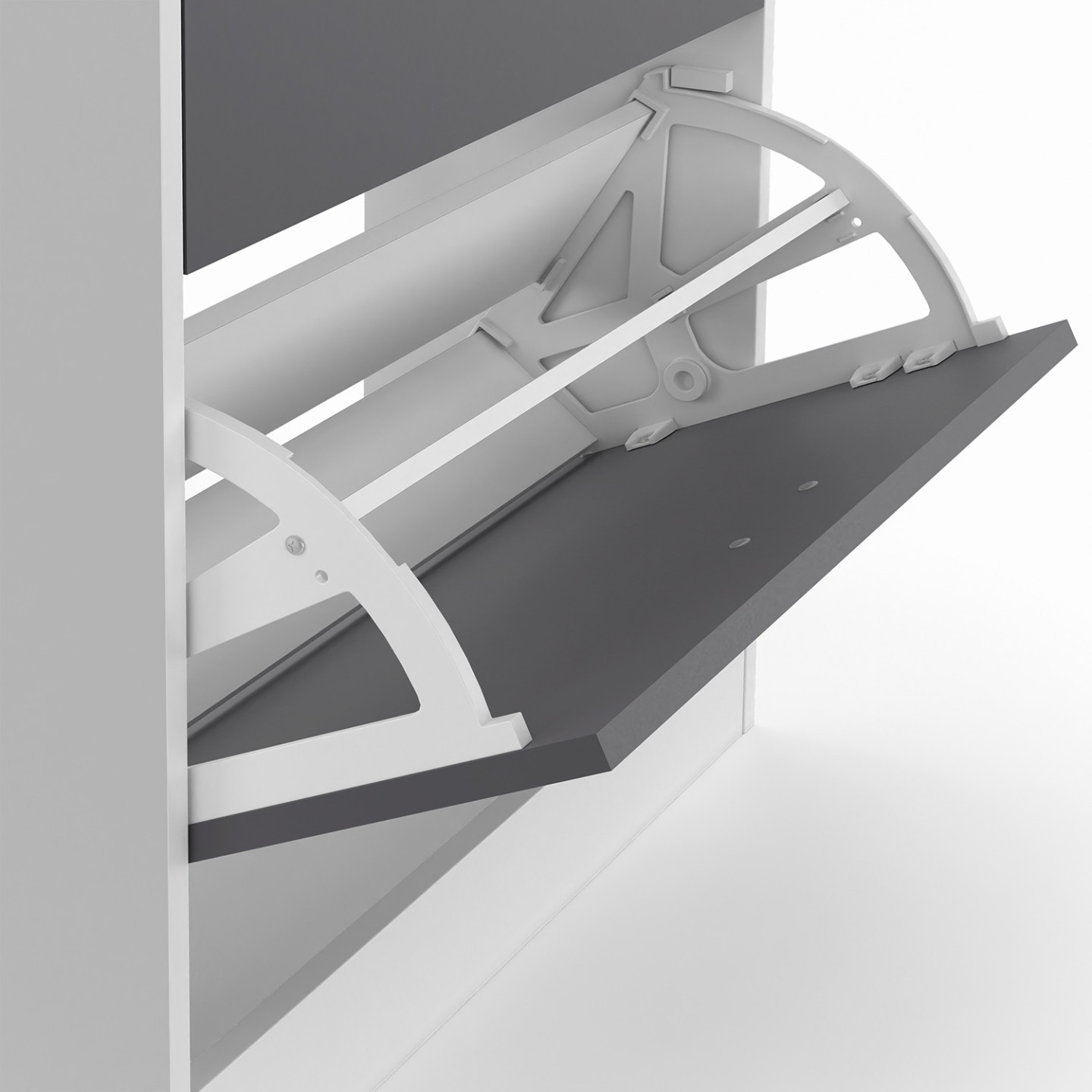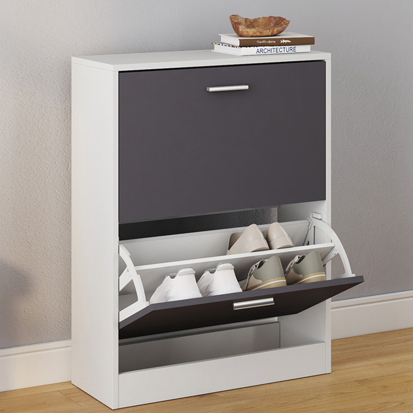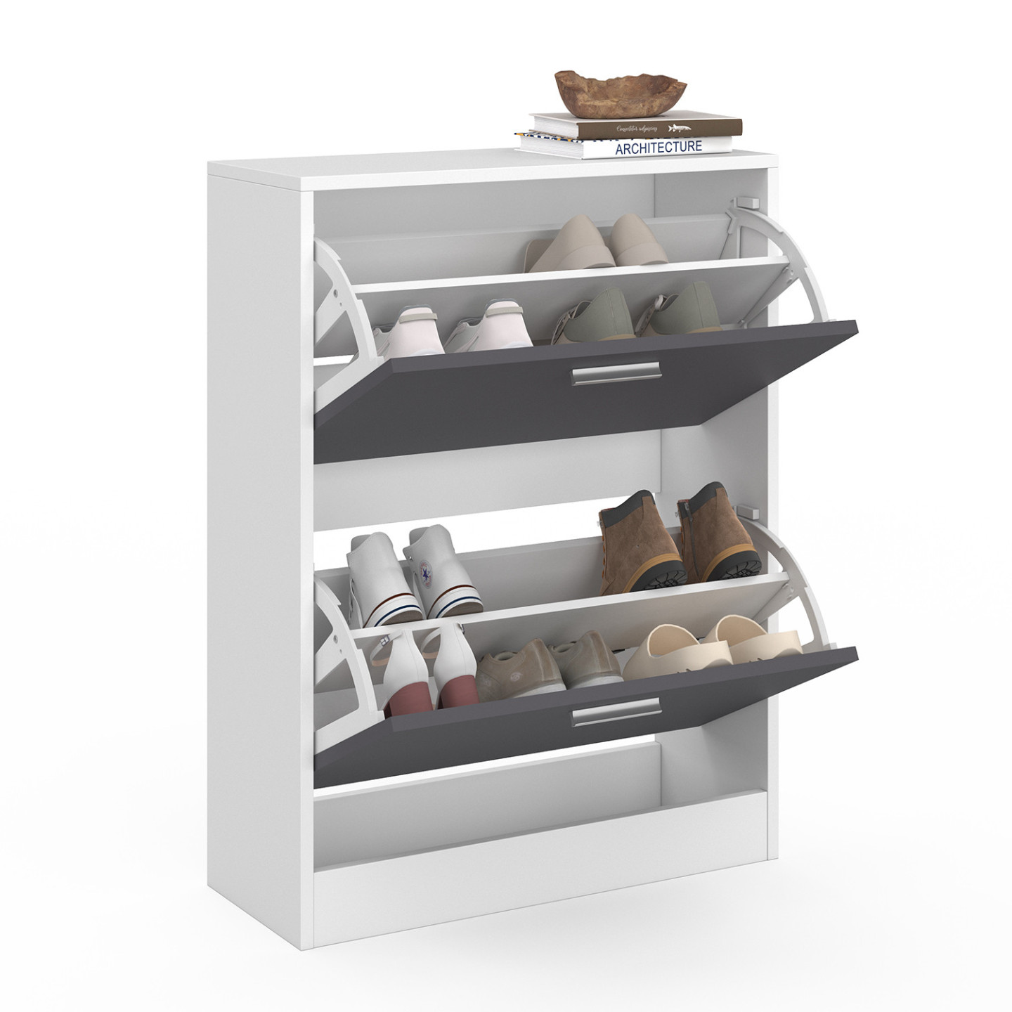Notre meuble à chaussures blanc et ses 2 portes grises vous permet d'optimiser l'espace dans votre maison et gagner du temps.Ce meuble à chaussures s'adaptera idéalement chez vous grâce à son design fonctionnel, moderne et tendance !La structure de ce meuble en panneaux de particules de bois (PB épaisseur 1,5 cm) vous offre une véritable stabilité et une vraie robustesse.Ce meuble d'appoint est composé de 2 portes, 2 espaces de rangement. Il optimise et habille tout type de couloir, d'entrée de façon moderne et fonctionnelle ! Chaque espace de rangement s'ouvre à l'aide de la porte basculant vers l'avant par la poignée.Ce meuble possède une grande capacité de rangement : il peut contenir jusqu'à 12 paires de chaussures (6 paires par espace de rangement).Chaque espace de rangement est séparé par une planche.Ce joli meuble est livré avec 4 patins.Montage facile.Pour éviter tout risque de basculement, il est recommandé de le fixer au mur.Dimensions du meuble à chaussures blancDimensions totales : Longueur 63,5 cm x largeur 24 cm x Hauteur 80,5 cmDimensions de la porte : Longueur 59,5 cm x Hauteur 34,5 cmDimensions de l'espace de rangement : Longueur 59,5 cm x Profondeur 24 cm x Hauteur 34,5 cmDimensions de la poignée de la porte : Longueur 10,5 cm x largeur 2 cmÉpaisseur de la poignée de la porte : 1 cmHauteur du sol à la première poignée : 38,5 cmHauteur du sol à la seconde poignée : 73,5 cmHauteur des portes basculantes : 37 cmMeuble à chaussures prévu pour des pointures allant jusqu'au 41Modèle disponible en différents coloris sur notre boutique en ligne :- Meuble à chaussures 2 portes blanc- Meuble à chaussures blanc 2 portes grises- Meuble à chaussures imitation hêtre 2 portes blanches