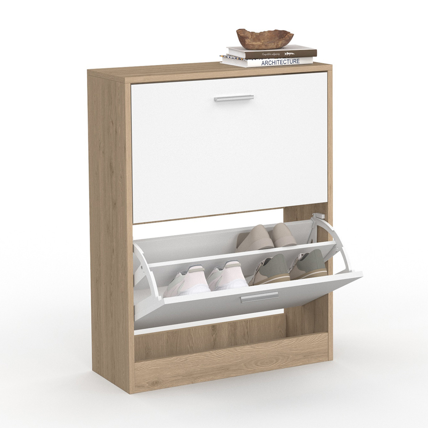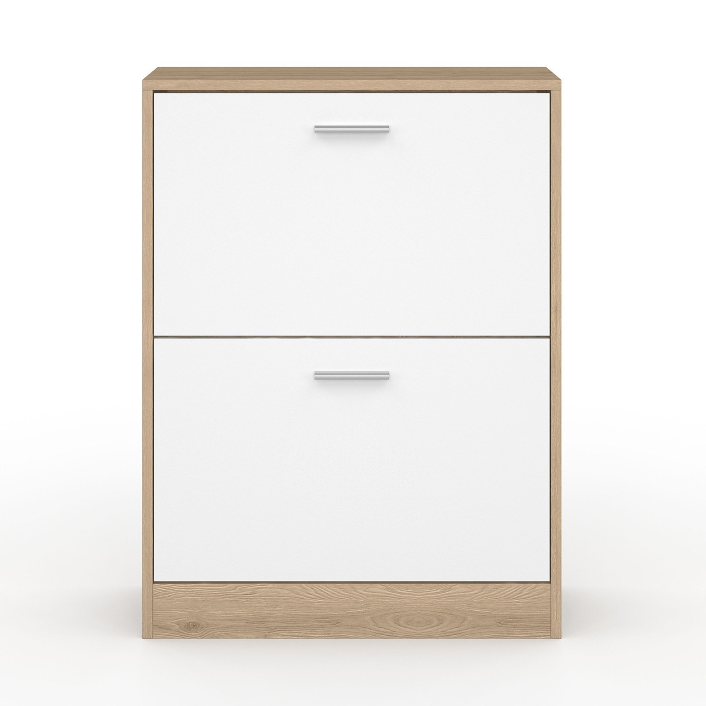 Optimisez l'espace dans votre maison, gagnez du temps grâce à notre meuble à chaussures imitation hêtre et ses 2 portes blanches.Son design fonctionnel, chic et moderne lui permettra de s'adapter idéalement chez vous !Stable et robuste, sa structure est en panneaux de particules de bois (PB épaisseur 1,5 cm).Composé de 2 portes, 2 espaces de rangement, ce meuble d'appoint optimise et habille tout type de couloir, d'entrée de façon moderne et fonctionnelle ! Chaque espace de rangement s'ouvre à l'aide de la poignée.Grâce à sa grande capacité de rangement, ce meuble à chaussures peut contenir jusqu'à 12 paires de chaussures (6 paires par espace de rangement).Chaque espace de rangement est séparé par une planche.4 patins sont fournis.Montage facile.Pour éviter tout risque de basculement, il est recommandé de le fixer au mur.Dimensions du meuble à chaussures imitation hêtre 2 portes blanchesDimensions globales : Longueur 63,5 cm x largeur 24 cm x Hauteur 80,5 cmDimensions de la porte : Longueur 59,5 cm x Hauteur 34,5 cmDimensions de l'espace de rangement : Longueur 59,5 cm x Profondeur 24 cm x Hauteur 34,5 cmDimensions de la poignée de la porte : Longueur 10,5 cm x largeur 2 cmÉpaisseur de la poignée de la porte : 1 cmHauteur du sol à la première poignée : 38,5 cmHauteur du sol à la seconde poignée : 73,5 cmHauteur des portes basculantes : 37 cmMeuble à chaussures prévu pour des pointures allant jusqu'au 41À monter soi-mêmePour éviter tout risque de basculement, il est recommandé de le fixer au mur.Modèle disponible en différents coloris sur notre boutique en ligne :- Meuble à chaussures 2 portes blanc- Meuble à chaussures blanc 2 portes grises- Meuble à chaussures imitation hêtre 2 portes blanchesRetrouvez toute notre gamme de meuble à chaussures sur notre boutique en ligne !