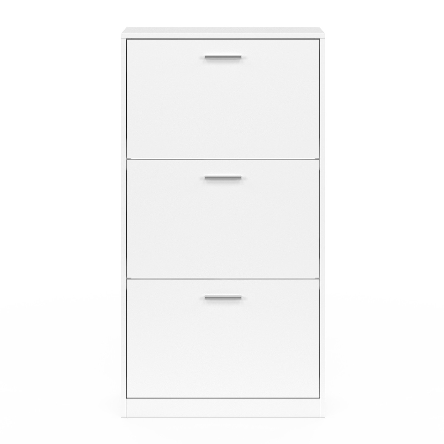 Notre meuble à chaussures 3 portes blanc vous permet de gagner de l'espace et du temps dans votre entrée !Ce meuble à chaussures s'adaptera parfaitement à votre intérieur grâce à son design fonctionnel, chic et moderne ! Il habillera tout type de couloir, tout type d'entrée.Ses 3 portes, ses 3 espaces de rangement vous permettront d'optimiser l'espace dans votre maison et ranger toutes vos chaussures.La structure de ce meuble en panneaux de particules de bois (PB épaisseur 1,6 cm) garantit stabilité et robustesse.Ouvrez chaque espace de rangement à l'aide de la poignée.Ce meuble vous offre une grande capacité de rangement car il peut contenir jusqu'à 18 paires de chaussures (6 paires par espace de rangement).Chaque espace de rangement possède une planche séparant les paires de chaussures modulables. Montage et assemblage faciles.Pour éviter tout risque de basculement, il est recommandé de le fixer au mur.Dimensions du meuble à chaussures 3 portes blancDimensions globales : Longueur 60 cm x largeur 24 cm x Hauteur 113 cmDimensions de la porte : L. 56,5 x H. 34,5 cmDimensions de l'espace de rangement : L. 56,5 x l. 24 x H. 34,5 cmDimensions de la poignée de la porte : L. 10,5 x l. 2 cmÉpaisseur de la poignée de la porte : 1 cmHauteur des portes basculantes : 37 cmMeuble à chaussures prévu pour des pointures allant jusqu'au 41À monter soi-mêmeRetrouvez toute notre gamme de meuble à chaussures sur notre boutique en ligne !