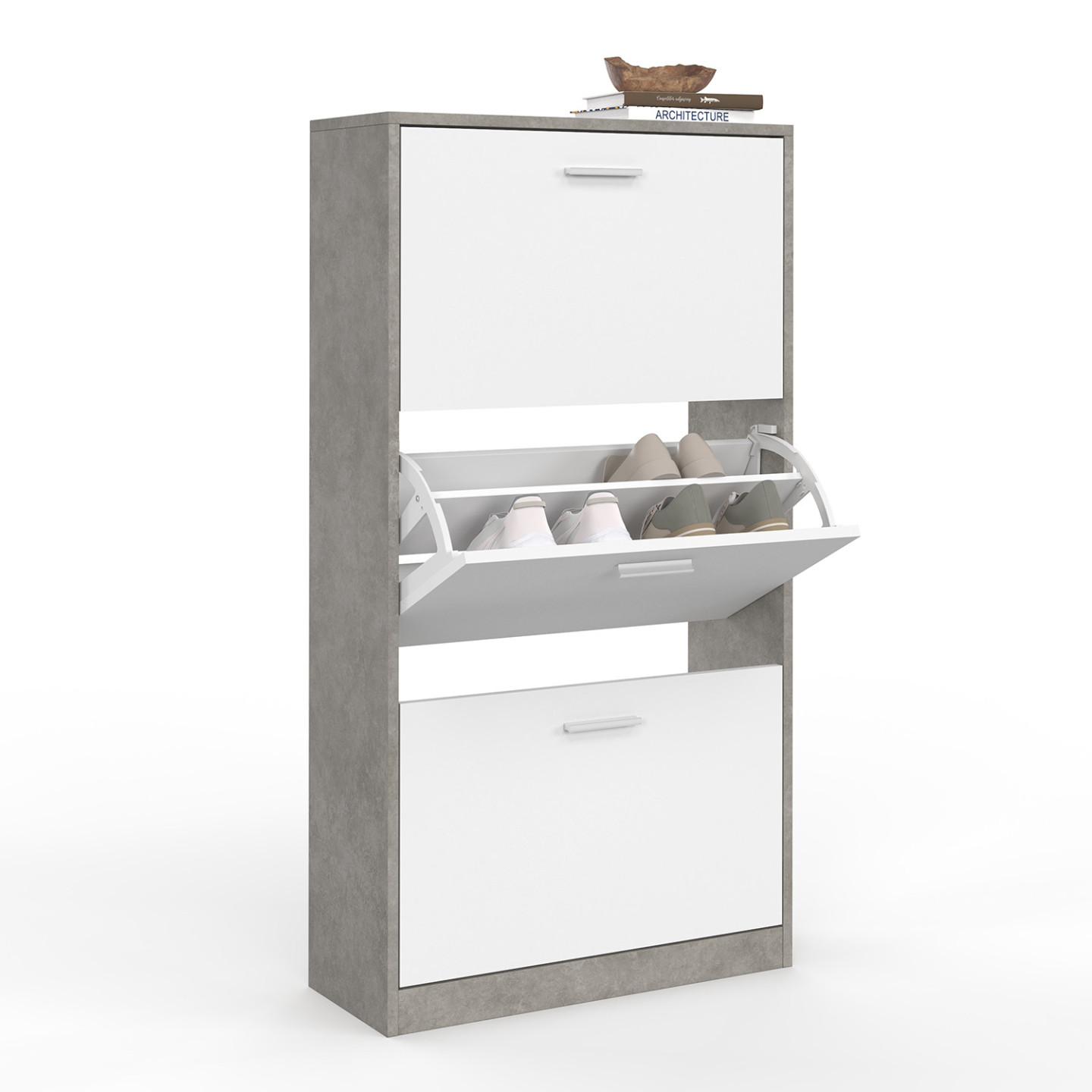 Notre meuble à chaussures effet béton 3 portes blanches vous permet de gagner de l'espace et du temps dans votre entrée !Ce meuble à chaussures s'adaptera parfaitement à votre intérieur grâce à son design fonctionnel, chic et moderne ! Il habillera tout type de couloir, tout type d'entrée.Ses 3 portes, ses 3 espaces de rangement vous permettront d'optimiser l'espace dans votre maison et ranger toutes vos chaussures.La structure de ce meuble en panneaux de particules de bois (PB épaisseur 1,5 cm) garantit stabilité et robustesse.Ouvrez chaque espace de rangement à l'aide de la poignée.Ce meuble vous offre une grande capacité de rangement car il peut contenir jusqu'à 18 paires de chaussures (6 paires par espace de rangement).Chaque espace de rangement possède une planche séparant les paires de chaussures modulables. Montage facile.Pour éviter tout risque de basculement, il est recommandé de le fixer au mur.Dimensions du meuble à chaussures effet béton 3 portes blanchesDimensions globales : Longueur 60 cm x largeur 24 cm x Hauteur 113 cmDimensions de la porte : L. 56,5 x H. 34,5 cmDimensions de l'espace de rangement : L. 56 x l. 24 x H. 34,5 cmDimensions de la poignée de la porte : L. 10,5 x l. 2 cmÉpaisseur de la poignée de la porte : 1 cmHauteur des portes basculantes : 37 cmMeuble à chaussures prévu pour des pointures allant jusqu'au 41À monter soi-mêmeModèle également disponibles dans d'autres coloris dont blanc portes béton.Retrouvez toute notre gamme de meubles à chaussures sur notre boutique en ligne ainsi que l'intégralité de notre collection béton !