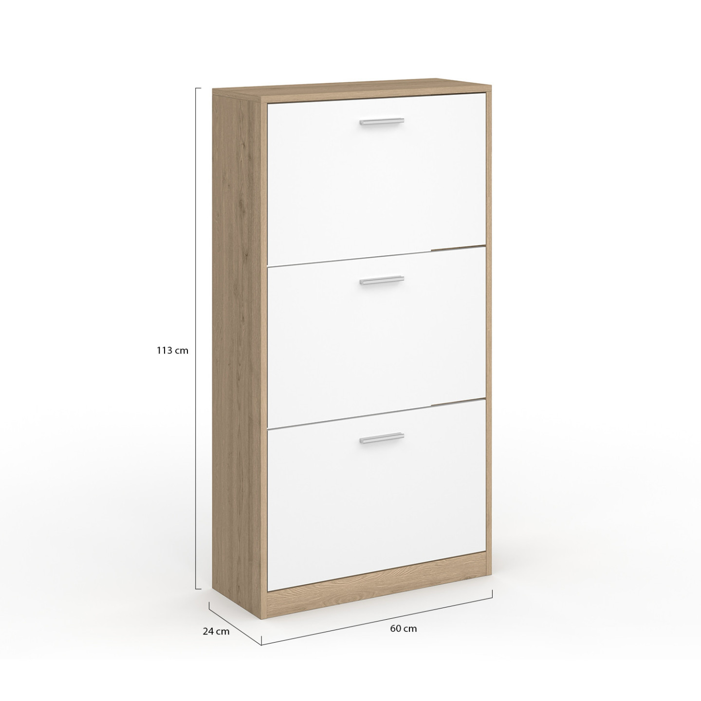 Gagnez du temps et optimisez l'espace dans votre maison avec notre meuble à chaussures imitation hêtre et ses 3 portes blanches.Grâce à son design fonctionnel, chic et moderne, il s'adaptera idéalement chez vous !Sa structure, stable et robuste, est en panneaux de particules de bois (PB épaisseur 1,6 cm).Composé de 3 portes, 3 espaces de rangement, ce joli meuble d'appoint optimise et habille tout type de couloir, d'entrée ! Chaque espace de rangement s'ouvre à l'aide de la poignée.Ce meuble à chaussures peut contenir jusqu'à 18 paires de chaussures (6 paires par espace de rangement). Vous bénéficiez ainsi d'une grande capacité de rangement. Chaque espace de rangement est séparé par une planche.Montage facile.Pour éviter tout risque de basculement, il est recommandé de le fixer au mur.Dimensions du meuble à chaussures 3 portesDimensions globales : Longueur 60 cm x largeur 24 cm x Hauteur 113 cmDimensions de la porte : L. 59,5 cm x H. 34,5 cmDimensions de l'espace de rangement : L. 59,5 cm x l. 24 cm x H. 34,5 cmDimensions de la poignée de la porte : L. 10,5 cm x l. 2 cmÉpaisseur de la poignée de la porte : 1 cmHauteur des portes basculantes : 37 cmMeuble à chaussures prévu pour des pointures allant jusqu'au 41Modèle disponible en différents coloris sur notre boutique en ligne :- Meuble à chaussures 3 portes blanc- Meuble à chaussures blanc 3 portes grises- Meuble à chaussures imitation hêtre 3 portes blanchesRetrouvez toute notre gamme de meuble à chaussures sur notre boutique en ligne !