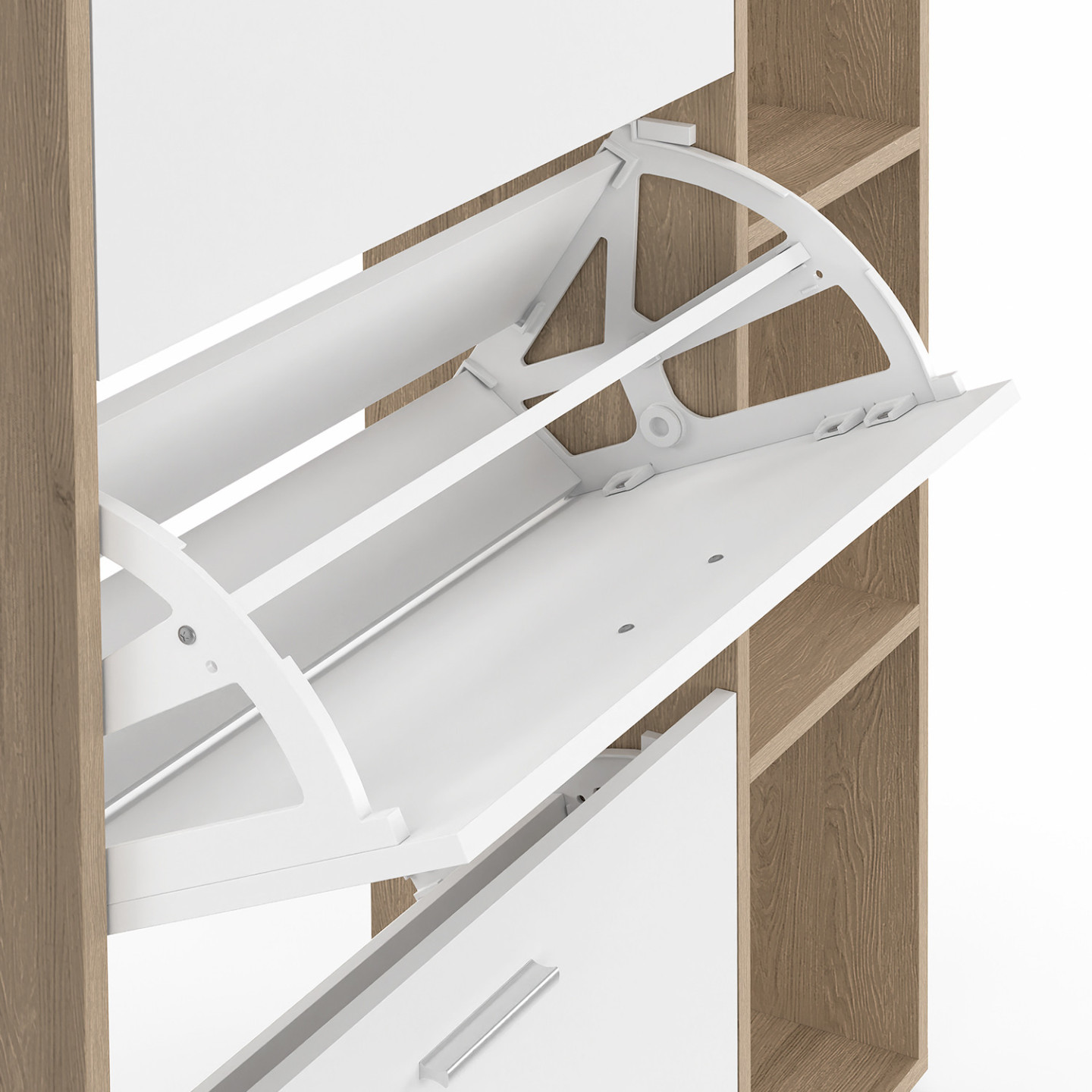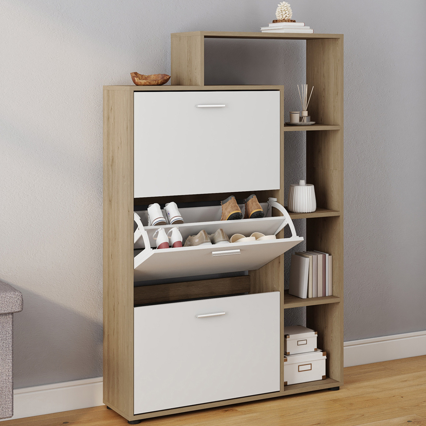 Descriptif du meuble à chaussures imitation hêtre 3 portes blanches avec étagère Vous cherchez un joli meuble à chaussures, vraiment pas cher et facile à monter ? La solution est sur IDMarket.com.Commandez directement sur notre site de vente en ligne et votre produit pourra vous être livré chez vous dans un délai de 48 h. Des objets fous à prix malins, c'est la promesse ID Market.Ce meuble à chaussures imitation hêtre 3 portes blanches avec étagère, maxi capacité, aux couleurs naturelles, s'intègre parfaitement dans n'importe quel type d'intérieur grâce à son design épuré.Ouvrez chaque casier à l'aide de la poignée finition argentée. Le mécanisme type menu déroulant vous permet de choisir rapidement la paire qu'il vous faut. Chaque espace de rangement possède une planche modulable séparant les deux rangées de paires de chaussures.Ce meuble vous offre une grande capacité de rangement, il peut contenir jusqu'à 6 paires de chaussures par espace de rangement, soit 18 paires au total = 36 chaussures, que vous pouvez organiser par rangée et trier par saison!Gain de place au sol assuré avec ce meuble conçu en hauteur! Fini les chaussures qui traînent dans l'entrée ou qui prennent la poussière !L'étagère 5 niveaux, 4 niches et 1 plateau, double la capacité de rangement. Plus besoin de chercher vos clés ou votre courrier ! Vous n'avez plus qu'à y disposer une petite plante verte et des paniers de rangement pour apporter votre petite touche de décoration pour un intérieur chaleureux et personnalisé.La structure de ce meuble en panneaux de particules de bois (PB épaisseur 1,5 cm) vous garantit solidité et robustesse.Pour éviter tout risque de basculement, il est recommandé de le fixer au mur.Meuble à chaussures prévu pour des pointures allant jusqu'au 41Dimensions du meuble à chaussures imitation hêtre 3 portes blanches avec Dimensions totales : Longueur 86,5 cm x largeur 24 cm x Hauteur 133 cmDimensions du meuble à chaussures : L. 60 cm x l. 24 cm x H. 110 cmDimensions des tiroirs : L. 56,5 cm x l. 24 cm x H. 34,5 cmDimensions de la poignée de la porte: L. 10,5 cm x l. 2 cmMeuble à chaussures prévu pour des pointures allant jusqu'au 41Modèle disponible en différents coloris sur notre boutique en ligneÀ monter soi-même Meubles à chaussures