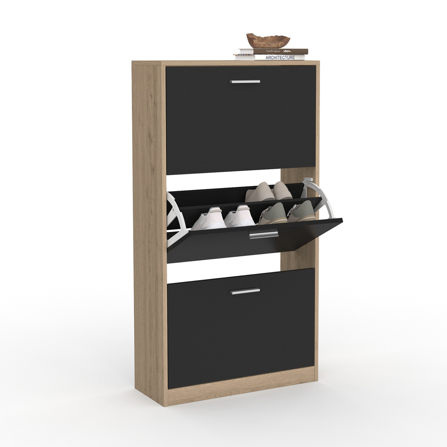Gagnez de l'espace et du temps dans votre maison, dans votre entrée, dressing ou buanderie, avec notre meuble à chaussures 3 portes !Ce range-chaussures s'adaptera parfaitement à votre intérieur grâce à ses dimensions compactes, son design fonctionnel, chic et tendance ! Peu profond, conçu tout en hauteur, il n'encombrera pas votre surface au sol et laissera le passage dégagé !Il habille tout type de couloir, d'entrée, de pièce de façon moderne !Ce meuble d'appoint est composé de 3 espaces de rangement, discrètement cachés derrière 3 portes à abattant, un système d'ouverture et de fermeture rapide, gain de place et pratique.Ouvrez chaque espace de rangement à l'aide de la poignée maniable et pratique à la jolie finition façon chrome !Ce meuble vous offre une grande capacité de rangement car il peut contenir jusqu'à 18 paires de chaussures (6 paires par espace de rangement).Chaque espace de rangement possède une séparation intermédiaire, vous permettant de ranger les paires de chaussures par membre de la famille, par saison, par type de chaussure, comme bon vous semble.La structure de ce meuble en panneaux de particules de bois (PB épaisseur 1,5 cm) vous garantit solidité et robustesse.Vous n'avez plus qu'à ajouter sur le dessus quelques éléments chaleureux comme une bougie, une petite plante verte ou un cadre pour parfaire la décoration de votre intérieur et optimiser votre meuble jusqu'au bout de ses fonctions !4 patins sont offerts pour ce meuble.Facile à monter.Pour éviter tout risque de basculement, il est recommandé de le fixer au mur.Dimensions du meuble à chaussures façon hêtre 3 portes noiresDimensions totales : Longueur 60 cm x largeur 24 cm x Hauteur 113 cmDimensions de la porte : L. 56,5 x H. 34,5 cmDimensions de l'espace de rangement : L. 56,5 x l. 24 x H. 34,5 cmDimensions de la poignée de la porte : L. 10,5 x l. 2 cmÉpaisseur de la poignée de la porte : 1 cmHauteur des portes basculantes : 37 cmMeuble à chaussures prévu pour des pointures allant jusqu'au 41À monter soi-mêmeModèle disponible en différents coloris sur notre boutique en ligne :- Meuble à chaussures 3 portes blanc- Meuble à chaussures blanc 3 portes grises- Meuble à chaussures imitation hêtre 3 portes blanchesRetrouvez toute notre gamme de meuble à chaussures sur notre boutique en ligne !