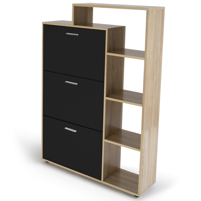 Descriptif du meuble à chaussures imitation hêtre 3 portes noires avec étagère Gagnez de l'espace et du temps dans votre maison, dans votre entrée, dressing ou buanderie, avec notre meuble à chaussures 3 portes avec étagères !Ce range-chaussures, maxi capacité, aux couleurs naturelles, chic et tendance, s'intègre parfaitement dans n'importe quel type d'intérieur grâce à son design épuré. Peu profond, il laissera le passage dégagé !Il habille tout type de couloir, d'entrée, de pièce, de façon moderne !Ouvrez chaque casier à l'aide de la poignée finition argentée. Le mécanisme type menu déroulant vous permet de choisir rapidement la paire qu'il vous faut. Chaque espace de rangement possède une planche modulable séparant les deux rangées de paires de chaussures.Ce meuble vous offre une grande capacité de rangement, il peut contenir jusqu'à 6 paires de chaussures par espace de rangement, soit 18 paires au total = 36 chaussures, que vous pouvez organiser par rangée et trier par saison !Gain de place au sol assuré avec ce meuble conçu en hauteur ! Fini les chaussures qui traînent dans l'entrée ou qui prennent la poussière !L'étagère 5 niveaux, 4 niches et 1 plateau, double la capacité de rangement. Plus besoin de chercher vos clés ou votre courrier ! Vous n'avez plus qu'à y disposer une petite plante verte et des paniers de rangement pour apporter votre petite touche de décoration pour un intérieur chaleureux et personnalisé.La structure de ce meuble en panneaux de particules de bois (PB épaisseur 1,5 cm) vous garantit solidité et robustesse.4 patins sont offerts pour ce meuble.Facile à monter.Pour éviter tout risque de basculement, il est recommandé de le fixer au mur.Meuble à chaussures prévu pour des pointures allant jusqu'au 41.Dimensions du meuble à chaussures façon hêtre 3 portes noires avec étagèresDimensions totales : Longueur 86,5 cm x largeur 24 cm x Hauteur 133 cmDimensions du meuble à chaussures : L. 60 cm x l. 24 cm x H. 110 cmDimensions des tiroirs : L. 56,5 cm x l. 24 cm x H. 34,5 cmDimensions de la poignée de la porte: L. 10,5 cm x l. 2 cmMeuble à chaussures prévu pour des pointures allant jusqu'au 41Modèle disponible en différents coloris sur notre boutique en ligneÀ monter soi-même Meubles à chaussures