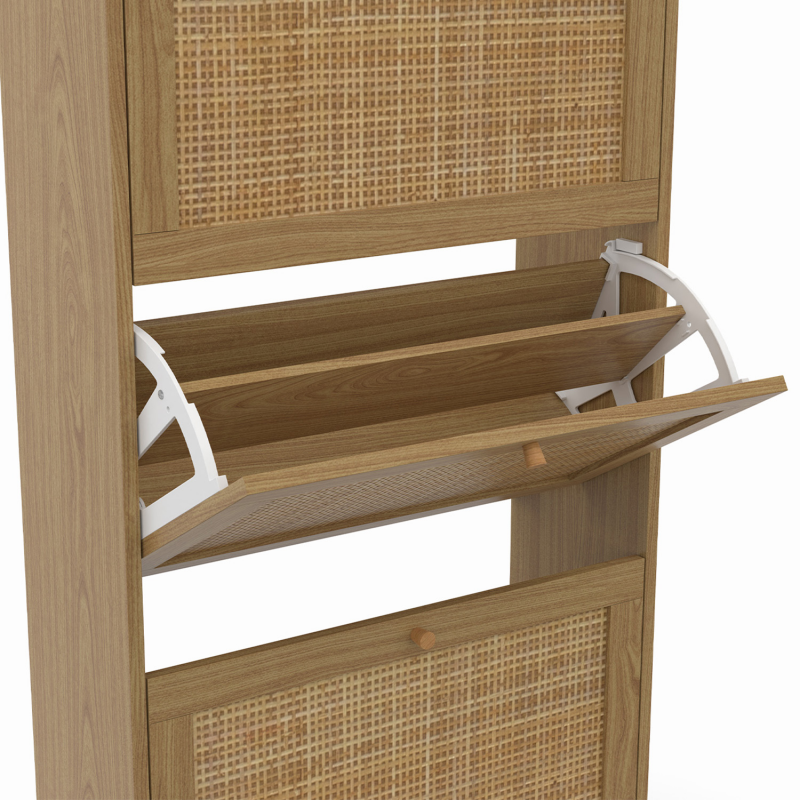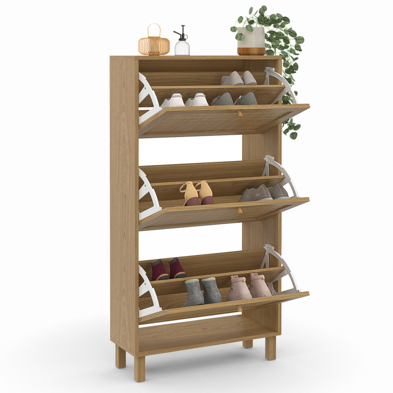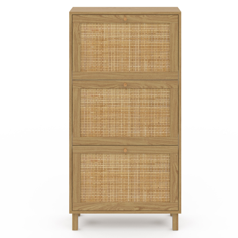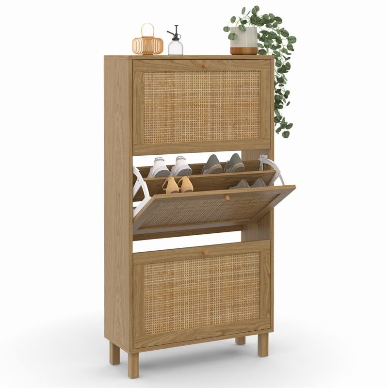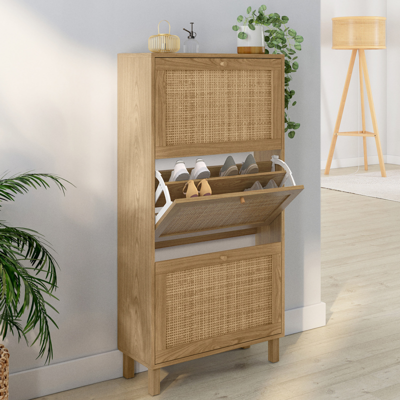 Apportez un esprit naturel et élégant à votre entrée avec ce joli meuble à chaussures HANAE 3 portes effet cannage. Les façades en rotin naturel apporteront une touche chaleureuse et lumineuse dans votre entrée et s'intégreront parfaitement dans tous les types d'intérieurs ! Pratiques et fonctionnels, ses 3 compartiments dotés chacun d'une cloison intermédiaire offrent une grande capacité de rangement et peuvent accueillir jusqu'à 18 paires de chaussures, soit 6 paires par compartiment.De plus, les dimensions compactes de ce meuble seront parfaites pour optimiser votre entrée ou même votre dressing laissant vos chaussures à l'abri des regards et de la poussière pour un espace toujours ordonné !Ses 4 pieds en bois et sa structure en panneaux de particules vous garantissent stabilité et robustesse.Vous n'aurez plus qu'à poser de jolis objets décoratifs ou de petites plantes vertes sur le dessus du meuble et le tour et joué !Dimensions du meuble à chaussures vintage HANAE 3 portes effet cannageDimensions globales : Longueur 60 cm x largeur 23,5 cm x Hauteur 118 cmHauteur pieds : L. 3 x l .3 x H. 10cmDimensions façade portes : L. 34 x H. 56 cmEncadrement porte : 4 cmLongueur poignée : 9 cm3 portes battantesMatériaux : Panneaux de particules et cannage naturelColoris : boisÀ monter soi-même Retrouvez l'ensemble de notre collection cannage ainsi que l'ensemble de nos meubles d'entrée sur notre boutique en ligne !