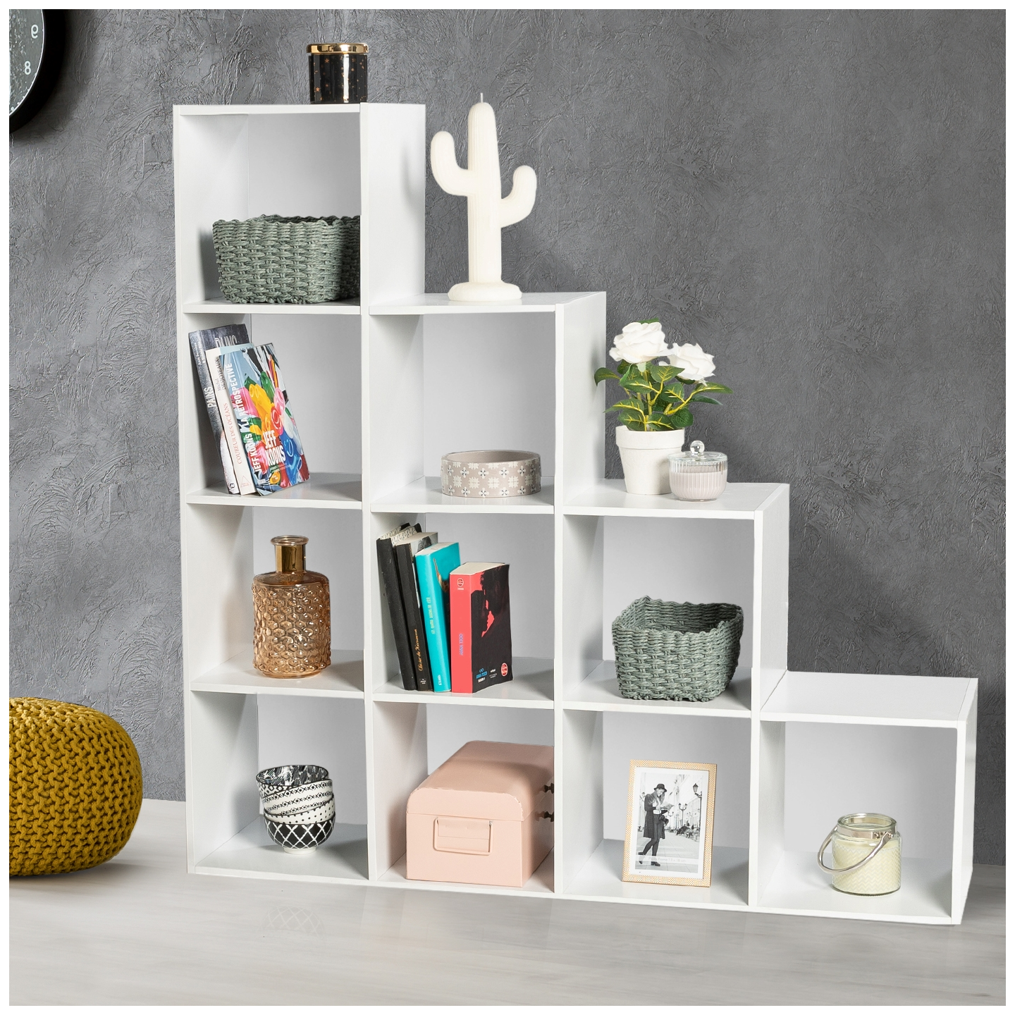 Descriptif de l'étagère escalier 4 niveaux bois blanc Découvrez un charmant meuble en escalier blanc ton sur ton qui s'intégrera à merveille dans votre chambre, bureau ou salon.Ce meuble multicases offre de nombreuses possibilités de rangement, grâce à ses 10 casiers répartis en étagères, sur 4 niveaux. Choisissez de disposer vos objets de déco, vos livres, vos CD comme bon vous semble. Grâce à sa maxi capacité de rangement chaque objet trouvera une place de choix !Avec un design aussi épuré et classique, l'étagère escalier blanc ID Market est le meuble parfait pour votre intérieur. Grâce à sa forme en dégradé, le meuble en escalier est idéal pour créer une séparation artificielle entre différents espaces d'une même pièce. Ainsi ce meuble trouvera sa place dans un studio ou autre logement, faisant office de cloison pour séparer le coin nuit de l'espace de travail, par exemple.En résumé, ce meuble en escalier est l'allié parfait des petits espaces en offrant une grande possibilité de rangements, pour une déco tendance grâce à ce dégradé de hauteurs. Plantes vertes, photos, cadres... tous trouveront leur place et seront mis en valeur sur ce meuble en bois à petit prix.Sa structure en panneau de particules d'une épaisseur de 12 mm lui confère une grande solidité.La couleur blanche du meuble, à la fois chic et intemporelle, donnera de la luminosité à votre intérieur !Découvrez sans plus attendre cette ingénieuse solution de rangement. Profitez-en dès maintenant !Les atouts de ce meuble escalier pas cher n'ont pas fini de vous étonner !Dimensions du meuble escalier multicases bois blanc1 meuble escalier 4 niveaux : dimensions : Longueur 117 cm x largeur 30 cm x Hauteur 117 cm+ Fonds pleins blanc ton sur tonAutres modèles et coloris disponibles sur notre boutique en ligne :Meuble escalier 4 niveaux BLANCMeuble escalier 4 niveaux façon HETREMeuble escalier 4 niveaux BLANC fond GRIS