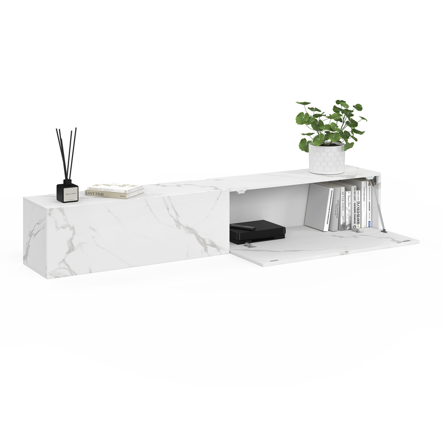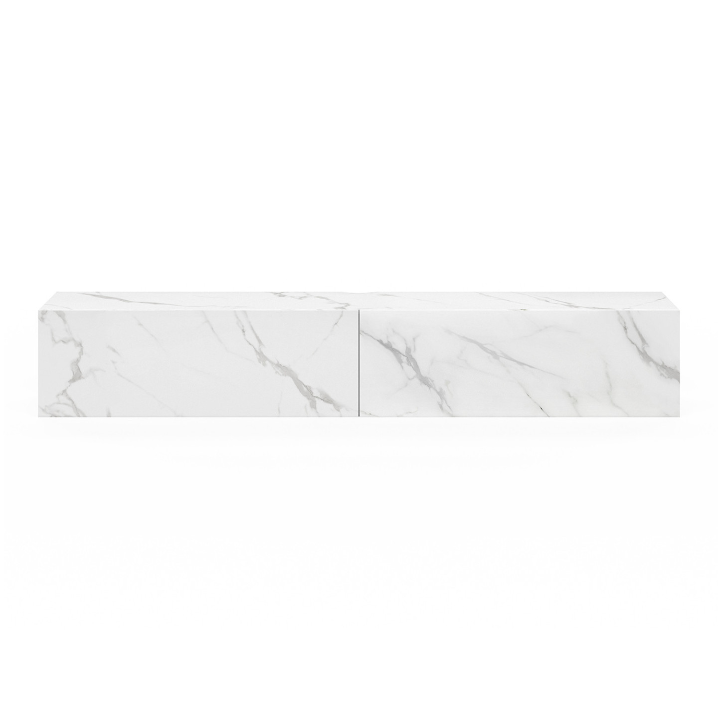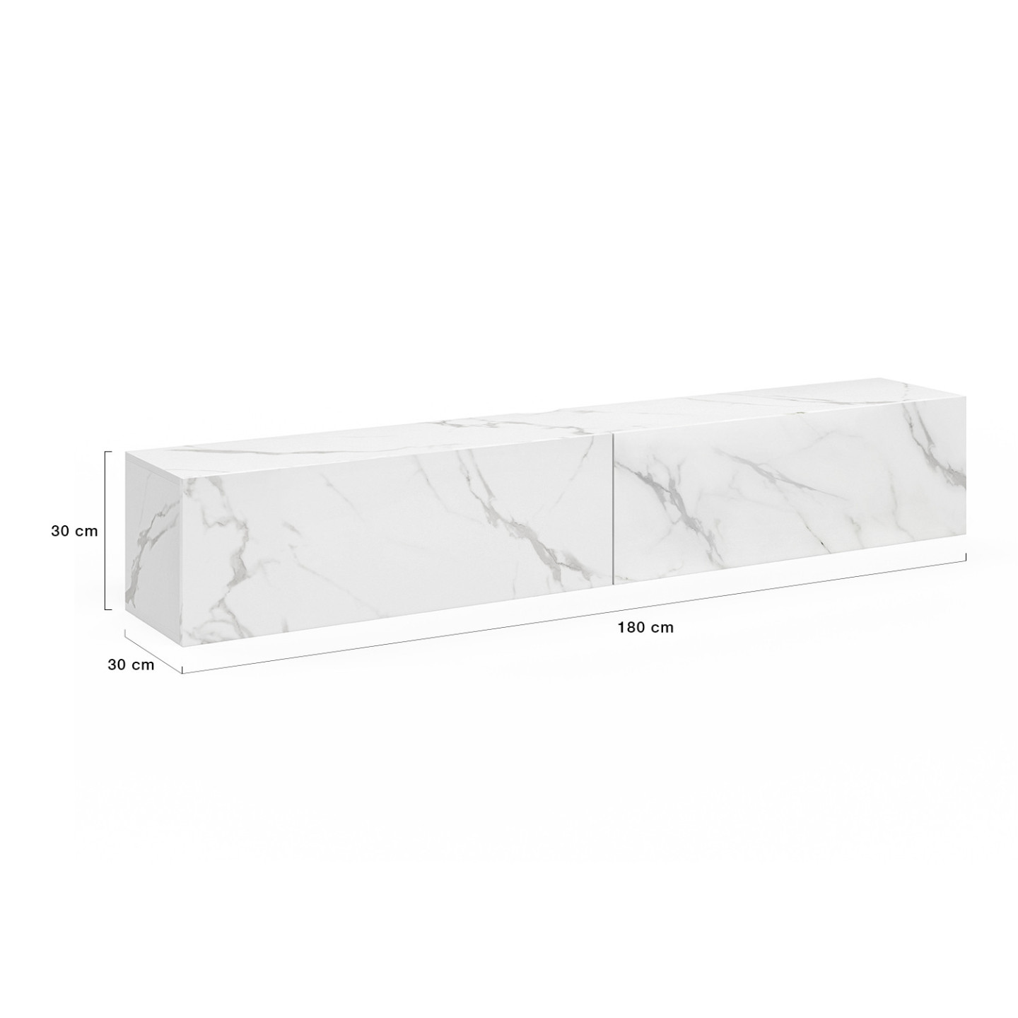 Vous êtes à la recherche d'un meuble TV pratique et tendance ? Voici le meuble télé idéal qui répondra à tous vos besoins : le meuble TV suspendu ELIO bois effet marbre !Donnez du style à votre pièce de vie grâce à son look effet marbre qui apportera un aspect design à votre pièce.Esthétique et fonctionnel, le meuble TV moderne est muni de deux portes abattantes pour ranger vos livres, votre box et vos effets plus personnels à l'abri des regards.Profitez de son long plateau de 180 cm pour accueillir un écran plat jusqu'à 70 pouces ainsi que télécommandes ou petits objets de décoration. Sa structure en panneaux de particules de bois vous assure stabilité et robustesse. Un trou passe-câbles déjà percé au centre du meuble de rangement vous permet d'installer aisément tout votre matériel hi-fi et vidéo. Astucieuses, les attaches murales sont incluses afin que vous puissiez le suspendre au mur en un clin d'œil ! Laissez vous tenter par ce grand meuble TV 180 cm ELIO bois effet marbre, parfait pour recevoir vos amis ou votre famille devant une soirée télé réussie !Dimensions du meuble TV suspendu ELIO 180 cmDimensions globales : Longueur 180 cm x largeur 30 cm x Hauteur 30 cmDimensions tiroirs : L. 88 x l. 26,5 x H. 27,5 cm Dimensions encoche pour câbles : L. 10 x l. 2 cmMatériaux : panneaux de particules de bois Attaches murales inclusesÀ monter soi-mêmeRetrouvez également l'ensemble de nos meubles modernes sur notre boutique en ligne !