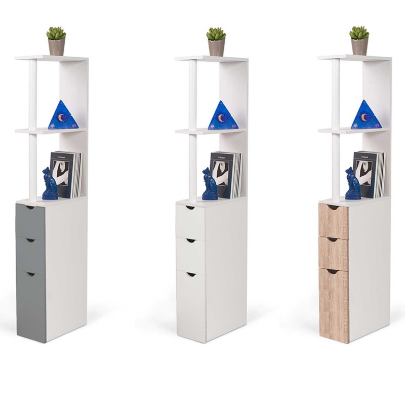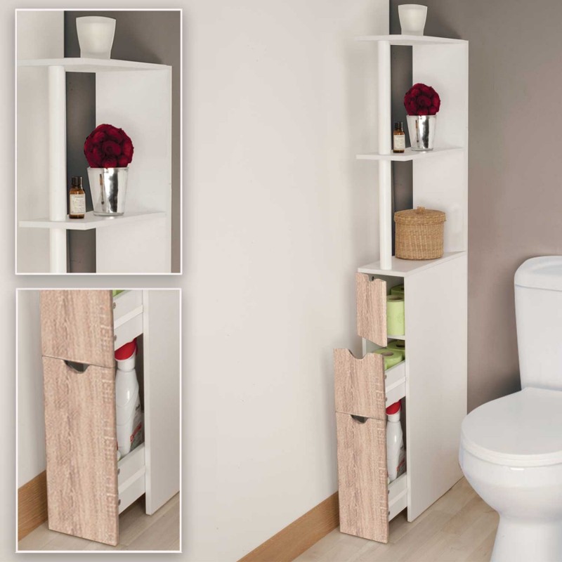 Spécialement conçu pour aménager les petits espaces, ce meuble en bois mélaminé est idéal pour un rangement fonctionnel dans votre salle de bain, buanderie ou vos WC.Très compact grâce à ces dimensions travaillées, ce meuble 3 portes + étagères offre un grand potentiel de rangement. Dimensions 136 cm de hauteur pour 33 cm de profondeur et seulement 15 cm de largeur !Ses trois étagères (composées de 2 tablettes), son placard et ses deux grands tiroirs lui confèrent pleins d'atouts de rangement ! La partie inférieure avec ses portes de placard vous permet notamment de ranger les produits peu esthétiques : rouleaux de papier toilette et produits d'entretien...Ce nouveau modèle au design contemporain en bois mélaminé blanc et portes façon hêtre est la solution pour tout ranger à portée de main même dans les petits espaces !Dimensions meuble WC WILLYDimensions globales : Longueur 15 cm x largeur 33 cm x hauteur 136 cmHauteur placard du haut : 19,5 cmHauteur tiroir du milieu : 18,3 cmHauteur tiroir du bas : 36,5 cmÀ monter soi-mêmePlusieurs coloris disponibles pour ce modèle. Retrouvez tous nos meubles WC sur notre boutique en ligne !