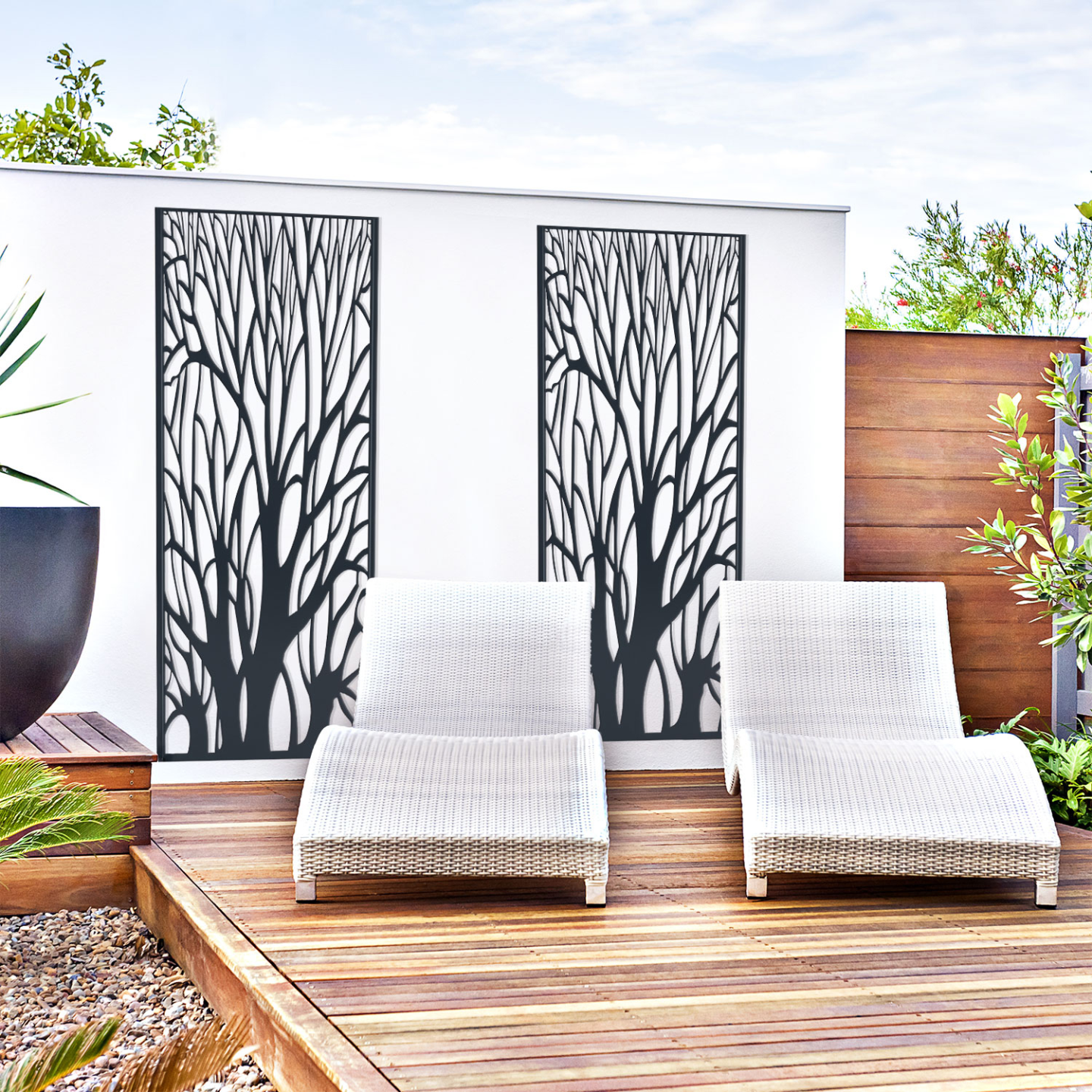 Apportez une touche déco à votre extérieur grâce à ce panneau en métal ajouré. Son design ultra moderne habillera votre terrasse ou votre mur avec élégance. Fabriqué en métal ajouré, le panneau universel ERA est résistant aux intempéries et ne demande aucun entretien. Vous n'aurez pas à vous souciez de sa longévité.Conçu pour s'adapter à votre environnement extérieur, ce panneau, en plus d'être stable, vous propose 4 modes de fixation : choisissez de le fixer directement au sol de votre terrasse ou sur votre pelouse ou au contraire, accrochez-le à votre mur ! Vous disposez d'un panneau en bois composite ? Vous pouvez également insérer le panneau ERA entre vos planches. Résistant et durable, vous pourrez longuement profiter du design du panneau décoratif universel. Ses formes arborescentes ajourées sont ultra modernes et apportent une note tendance à votre extérieur ! Notre astuce : faîtes grimper vos plantes le long du panneau ERA pour un effet végétal garanti ! Dimensions du panneau décoratif ERA- Dimensions totales : largeur 50 CM x Hauteur 150 CM x épaisseur 1,8 CM- Dimensions des pieds : Longueur 40 CM x largeur 5 CM x Hauteur 4 MM- Épaisseur de la structure : 18 x 18 x 1 MM- Épaisseur du métal : 0,8 x 1,8 MM- Peinture spray- Couleur : gris 425CCe modèle convient aux panneaux occultants disposant d'une épaisseur de lame de 1,8 CM.