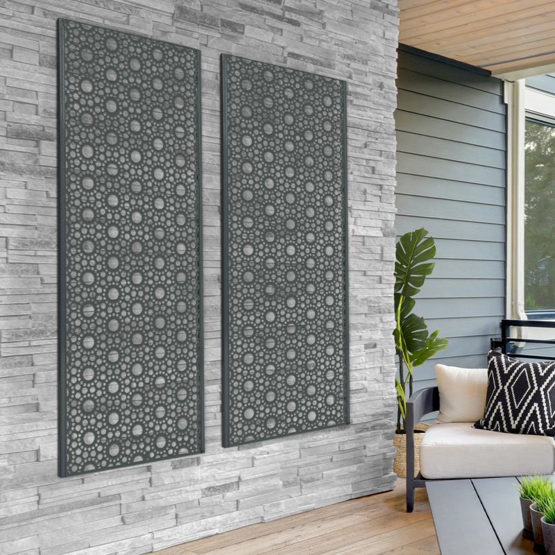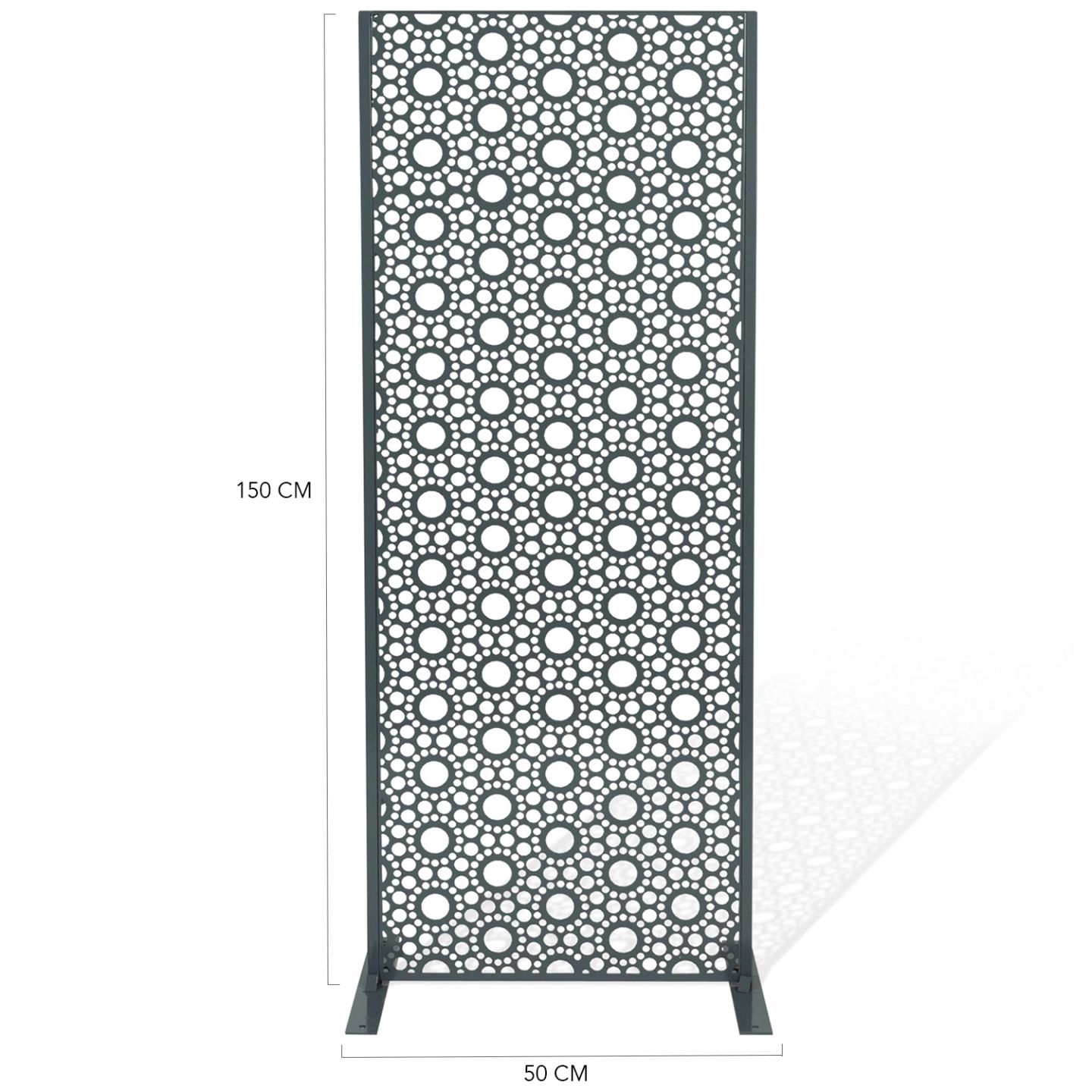 Apportez une touche déco à votre extérieur grâce à ce panneau en métal ajouré. Son design ultra moderne habillera votre terrasse ou votre mur avec élégance. Fabriqué en métal ajouré, le panneau universel ROSAS est résistant aux intempéries et ne demande aucun entretien. Vous n'aurez pas à vous souciez de sa longévité.Conçu pour s'adapter à votre environnement extérieur, ce panneau, en plus d'être stable, vous propose 4 modes de fixation : choisissez de le fixer directement au sol de votre terrasse ou sur votre pelouse ou au contraire, accrochez-le à votre mur ! Vous disposez d'un panneau en bois composite ? Vous pouvez également insérer le panneau ROSAS entre vos planches. Résistant et durable, vous pourrez longuement profiter du design du panneau décoratif universel. Ses formes arrondies ajourées sont ultra modernes et apportent une note tendance à votre extérieur ! Notre astuce : faîtes grimper vos plantes le long du panneau ROSAS pour un effet végétal garanti ! Dimensions du panneau décoratif ROSAS- Dimensions totales : largeur 60 CM x Hauteur 160 CM x épaisseur 1,8 CM- Dimensions des pieds : Longueur 40 CM x largeur 5 CM x Hauteur 4 MM- Épaisseur de la structure : 18 x 18 x 1 MM- Épaisseur du métal : 0,8 x 1,8 MM- Peinture spray- Couleur : gris 425CCe modèle convient aux panneaux occultants disposant d'une épaisseur de lame de 1,8 CM.